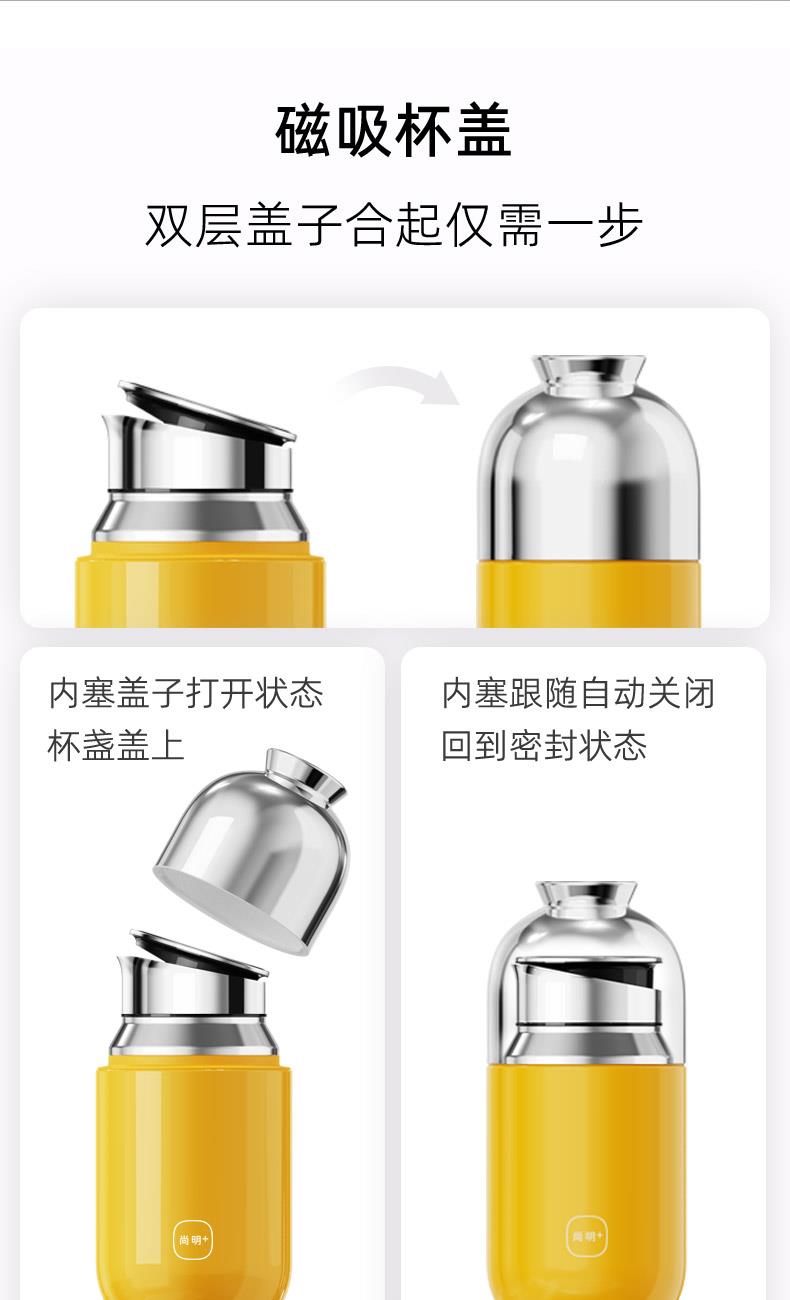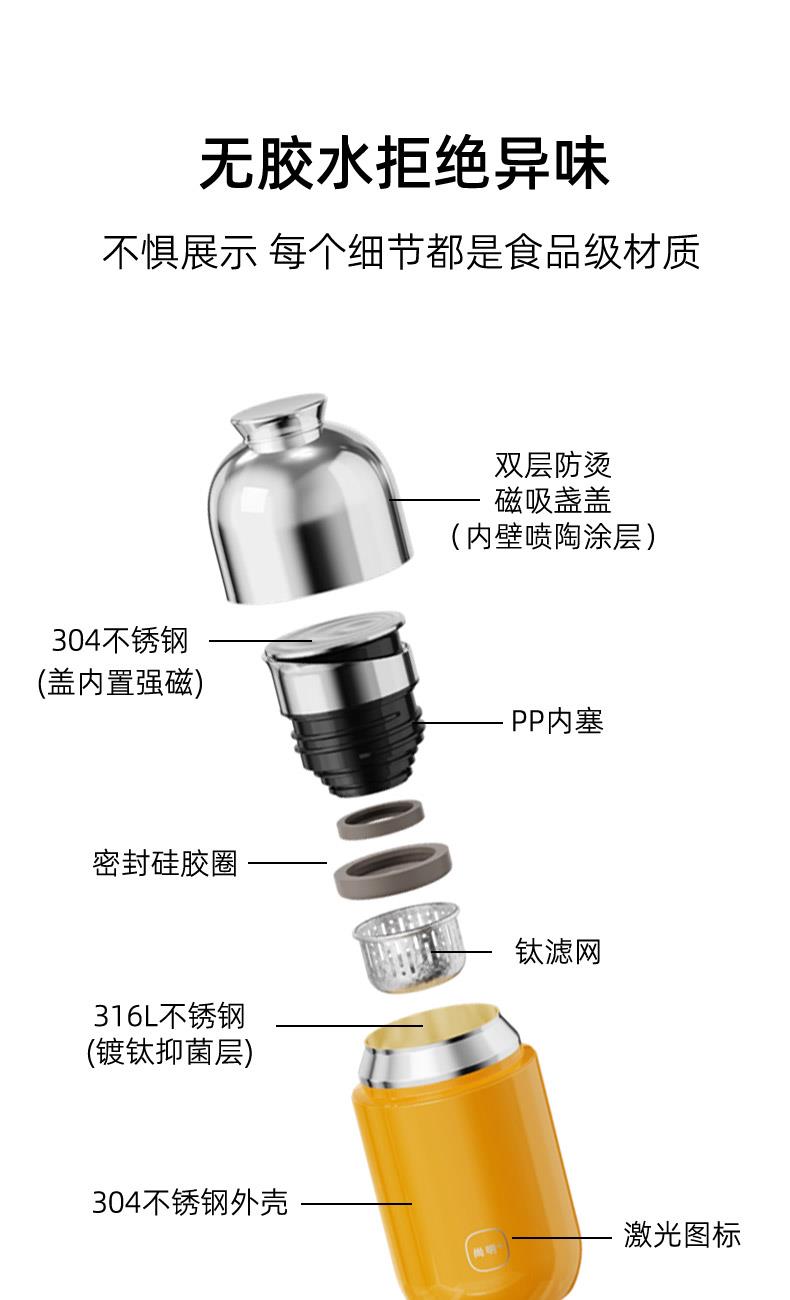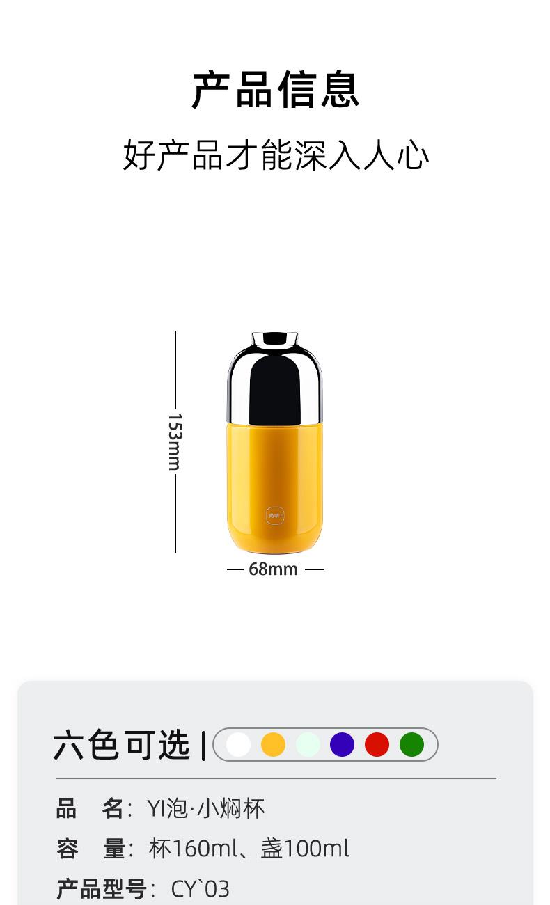 型号:MC03小焖杯 容量:160mL 一杯一盏 双层防烫磁吸盏盖(内壁喷陶涂层) 六层锁温,保温保冷 母婴安全材料 杯身不锈钢内胆覆钛yi菌 按压开盖,钛滤网内塞 防滑硅胶壶底,不易倾倒