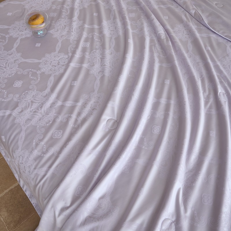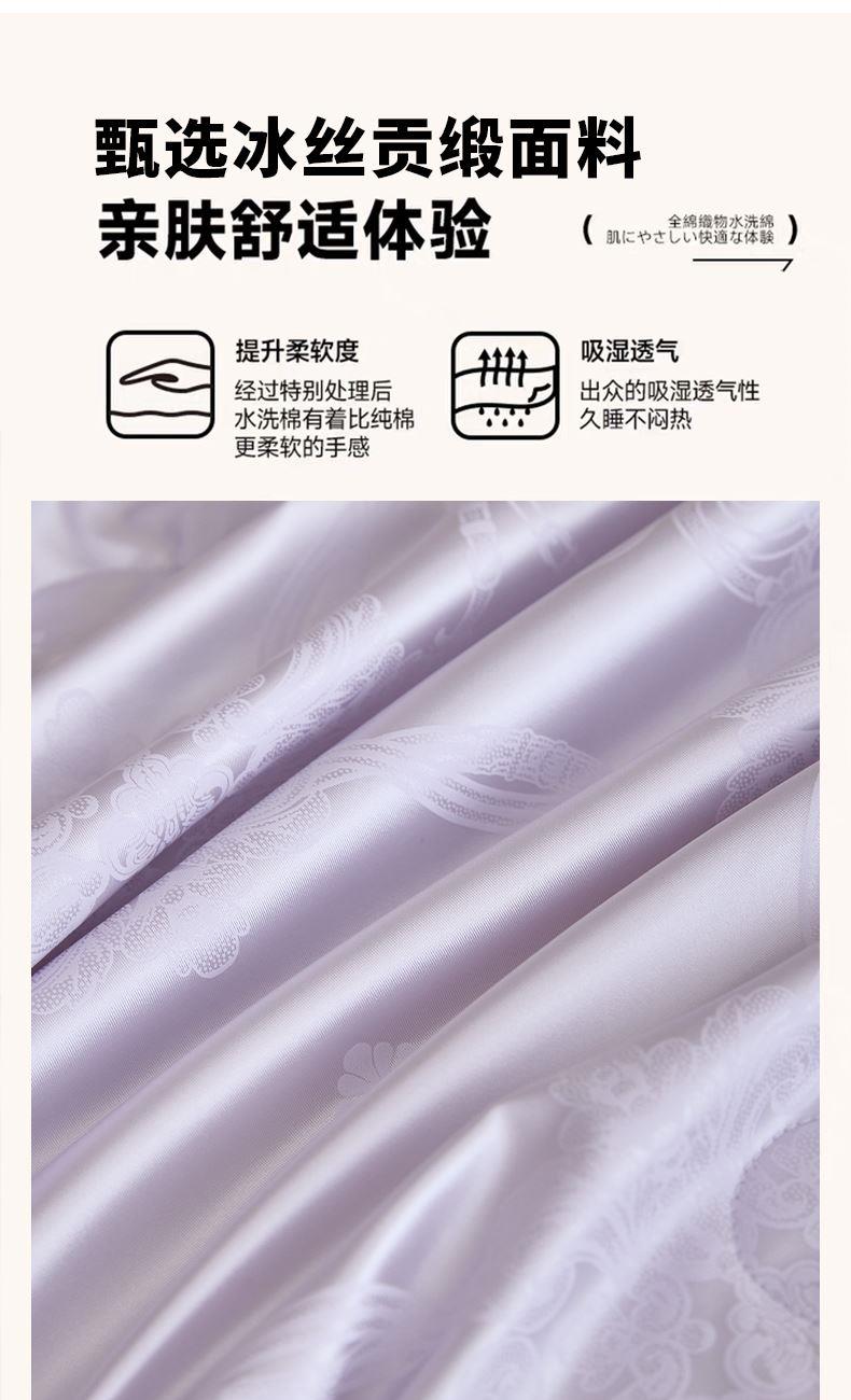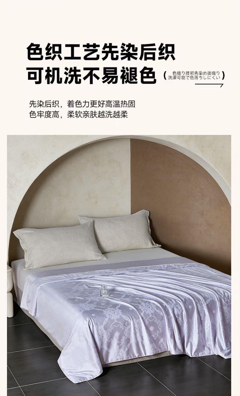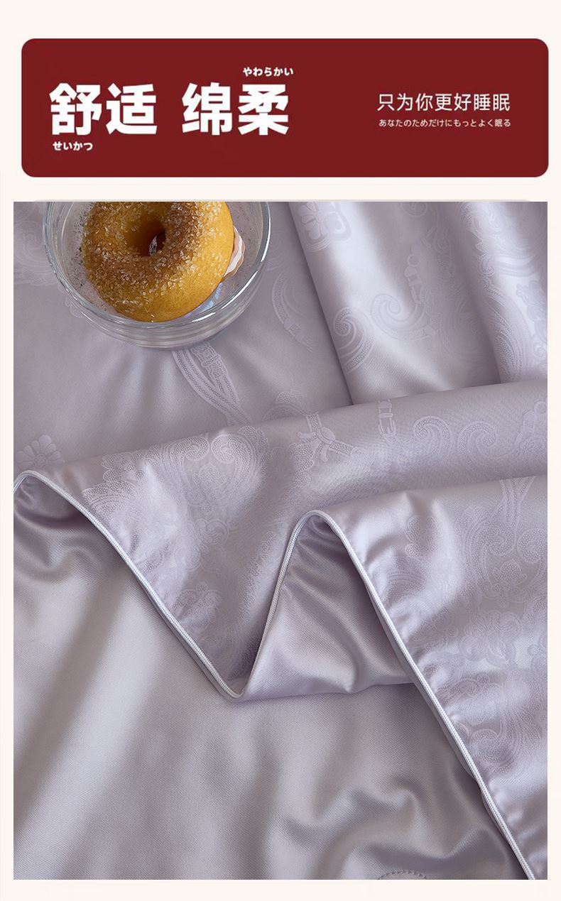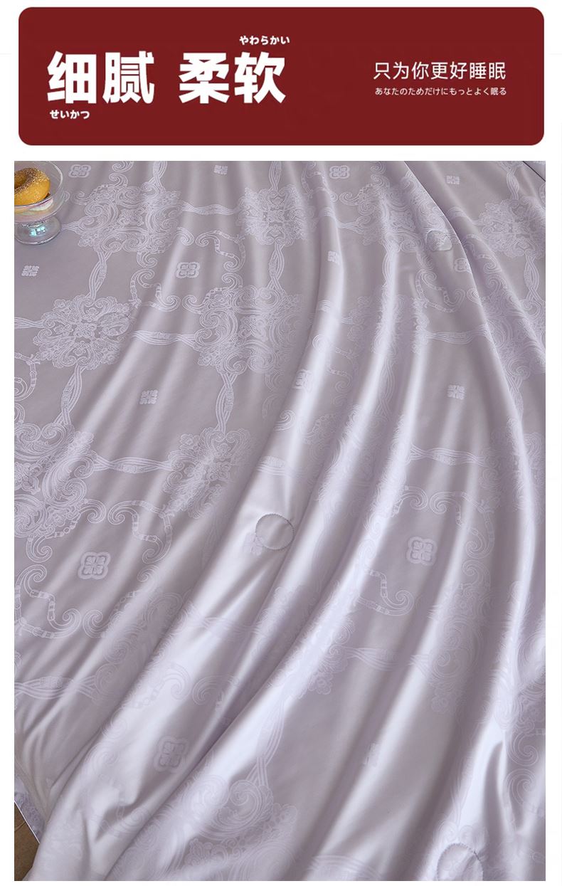 规格:200*230cm 面料:冰丝贡缎 填充:蚕丝(中长丝) 重量:1800g 执行标准:GB/T22796-2021 安全类别:GB18401-2010 B类 1.优选凉感冰丝面料,水洗工艺处理,提升拉力强度,使面料更加舒适贴身; 2.蚕丝被称为“纤维皇后”因其中含有丰富的氨基酸及细密的透气孔,更有利于水汽的流通,产生“天然调温”功能; 给您一个时尚健康的睡眠体验!
