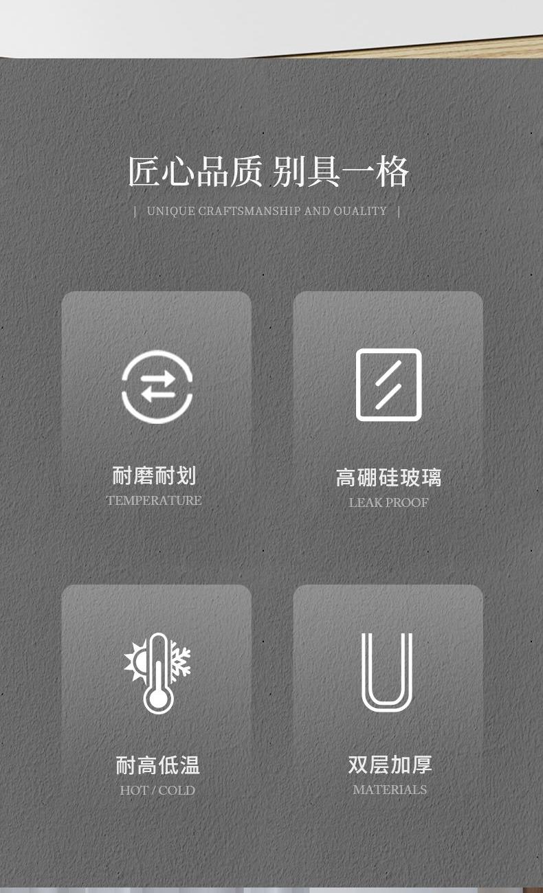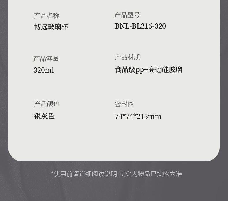 材 质:食品级pp+高硼硅玻璃 规 格:320ml 颜 色:银灰色 装 箱 数:40pcs/箱 PP材质无毒无害:食品级PP材质经过专门的处理,不含有对人体有害的化学物质,不释放出有害气味,确保食品的安全性和卫生性。 高硼硅玻璃耐温差:能够承受较大的温差变化,应变温度差大,从极冷到极热都不易破裂或变形 易清洁:表面光滑,不易粘污,细菌和污垢不易滋生,用普通清洁剂或开水就能轻松清洗。 高透明度:清晰显示杯中内容,方便观察和欣赏饮品。
