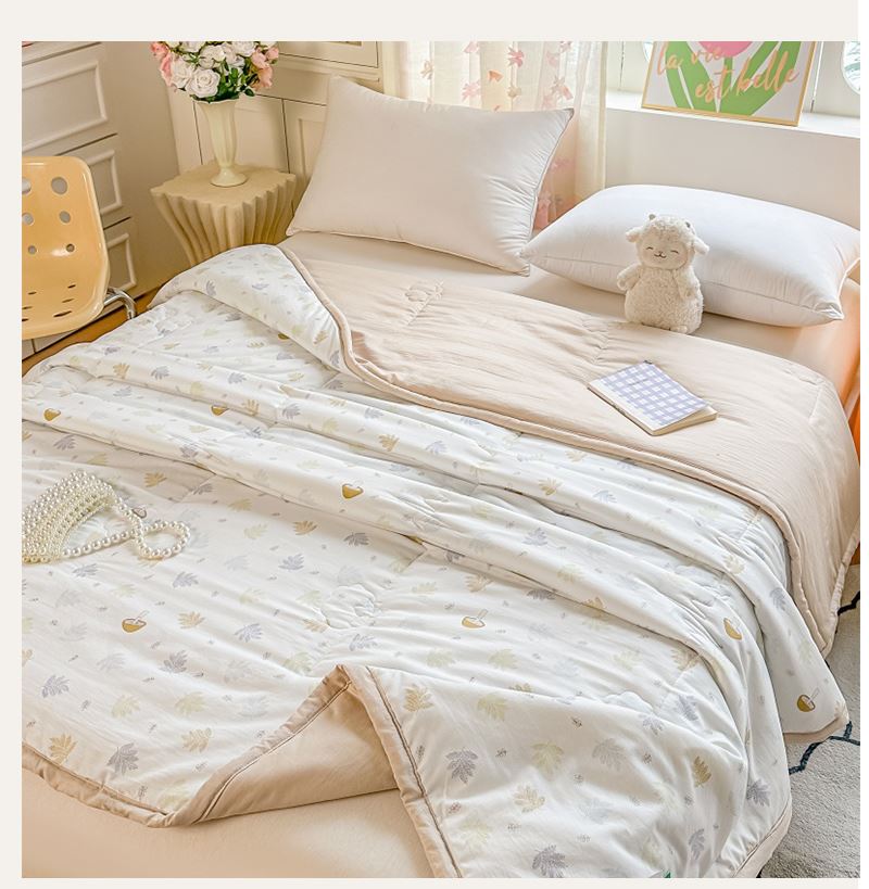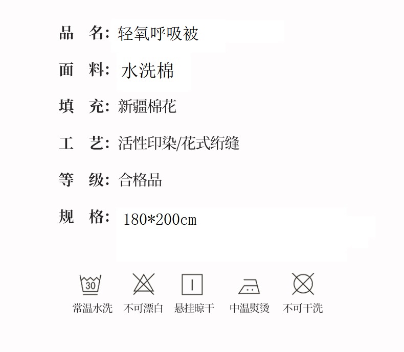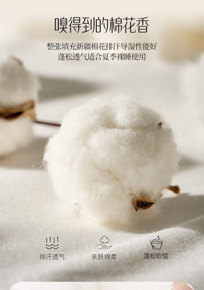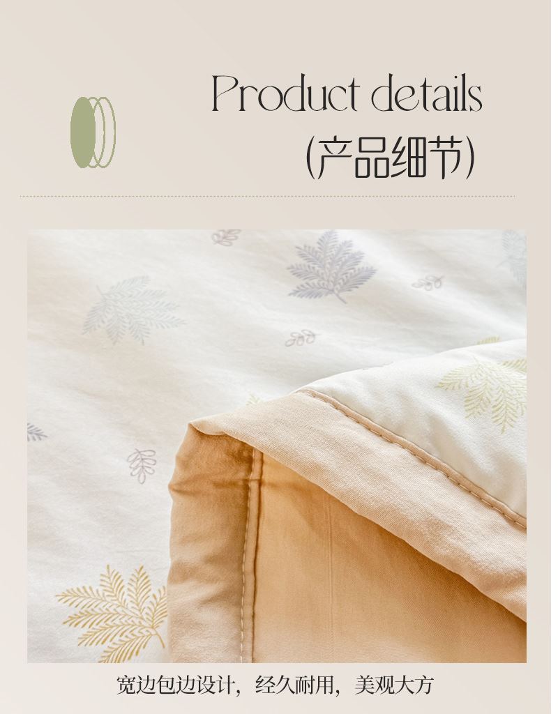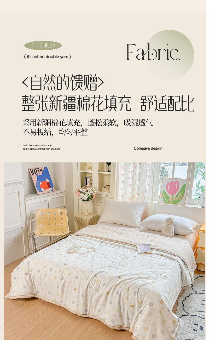 面料材质:水洗棉 填充:新疆棉花 产品规格:180*200cm 克重:1300g 产品特点: 1.水洗棉面料轻薄透气,绵软轻盈,排湿透气。 2.自然的馈赠,采用新疆棉花填充,蓬松柔软,吸湿透气,均匀平整。 3.时尚印花式,经典又有新意,潮流时尚设计,充盈着艺术感绽放于一室的温柔,百搭!
