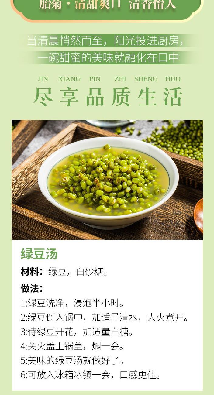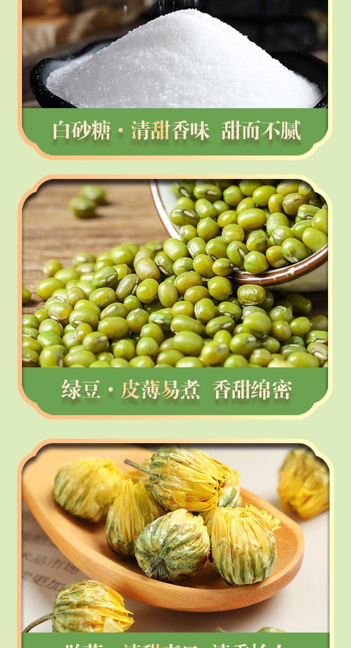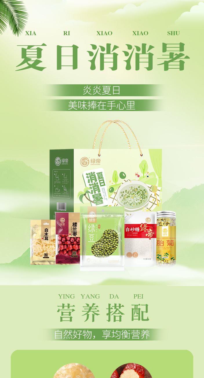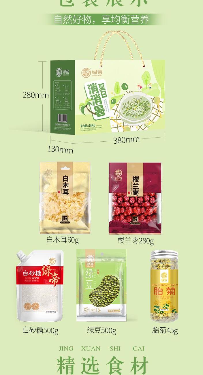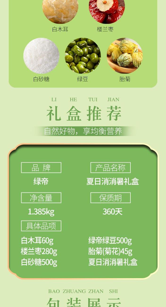 原料产地:福建省厦门市 净含量:365克 保质期:365天 生产日期:见包装物打印处 礼盒配备绿豆、白木耳、楼兰枣、白砂糖、胎菊等夏日必备清补食材。 绿豆清热解火、搭配白木耳、楼兰枣做成绿豆红枣银耳羹,胎菊清热下火,可直接冲泡饮用,是夏日解暑必备的佳品。
