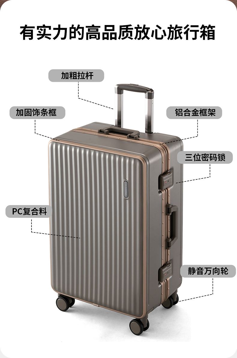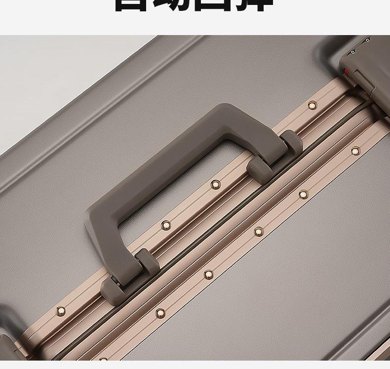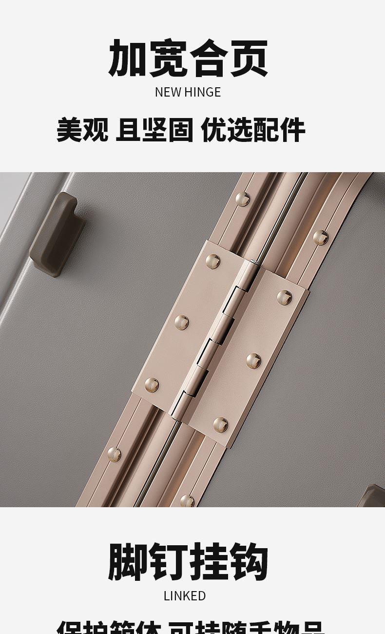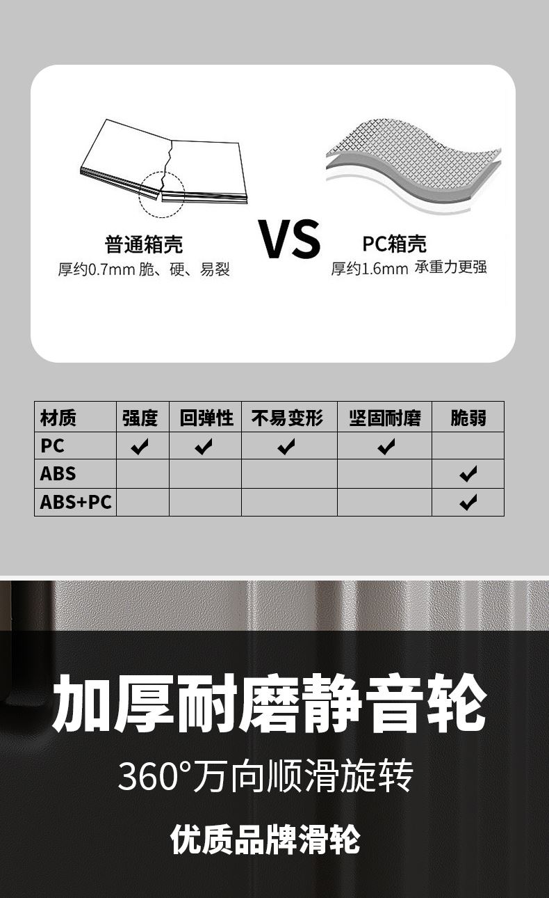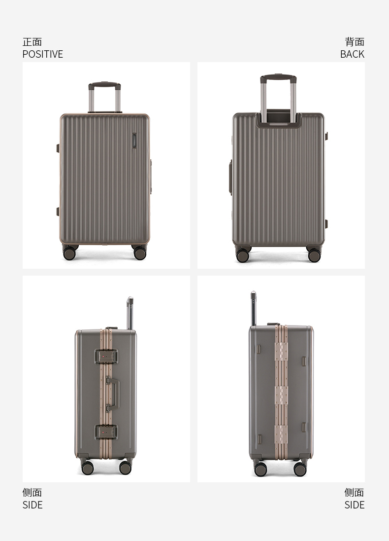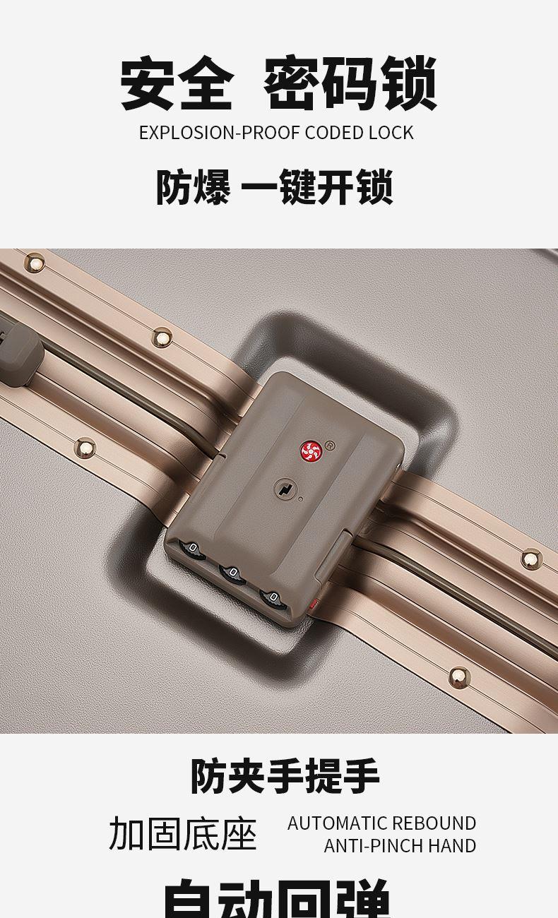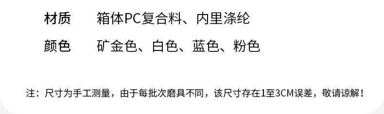 型号:TJ2013 规格:20英寸 材质:PC复合料 里料:涤纶 颜色:矿金色/白色/粉色/蓝色 等级:一等合格品 执行标准:QB/T 2155-2018 产品特点: 1、加厚PC合金外壳及铝框和合页,防刮坚固,耐磨防爆;2、加厚合金伸缩拉杆,拉合顺畅,握感舒适,结实稳固;3、带慢回弹顶部和侧部提手,竖提横提都方便;4、侧部顶脚防剐蹭,同时带方便行李挂架功能;5、内大双网结构,干湿分离,分区合理;6、双嵌入式三码密码锁,安全性高,放心旅行;7、带挡泥板TPE万向静音飞机轮,高承重,肆意而行;8、撞色金属条配饰,美观大方,时尚有质感。