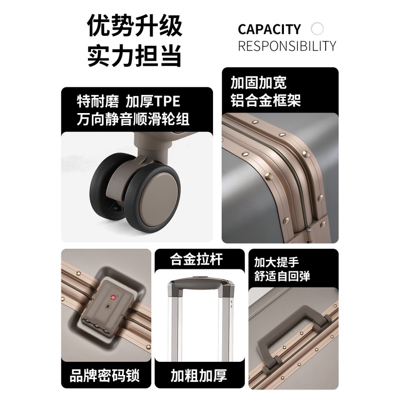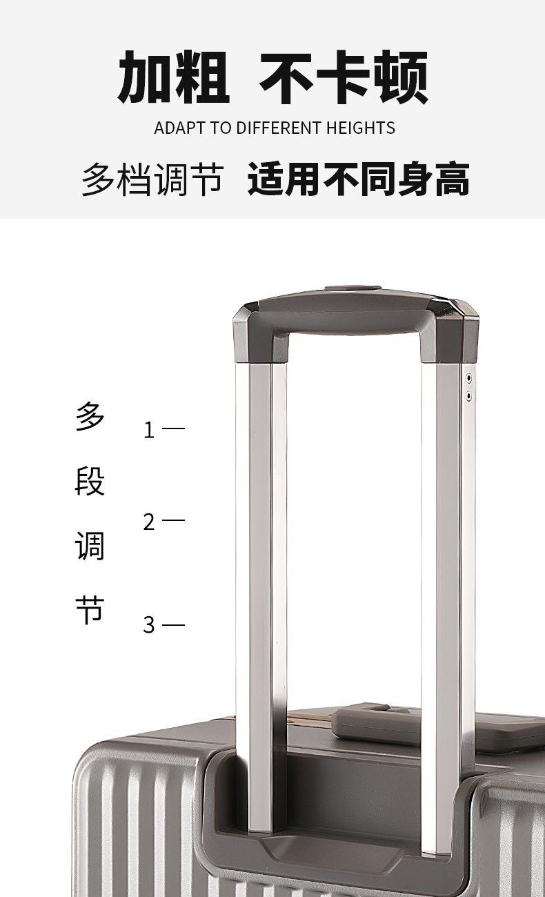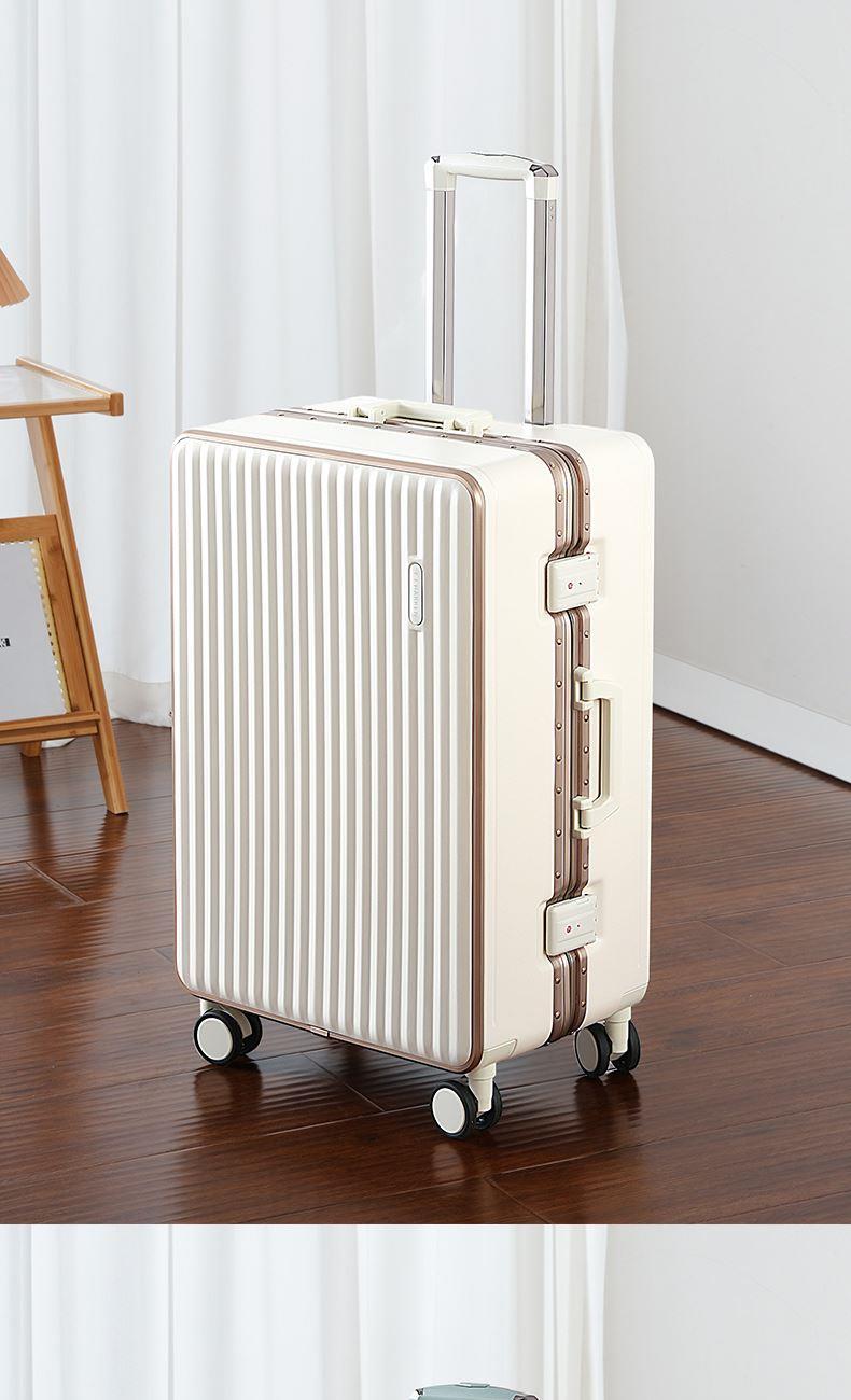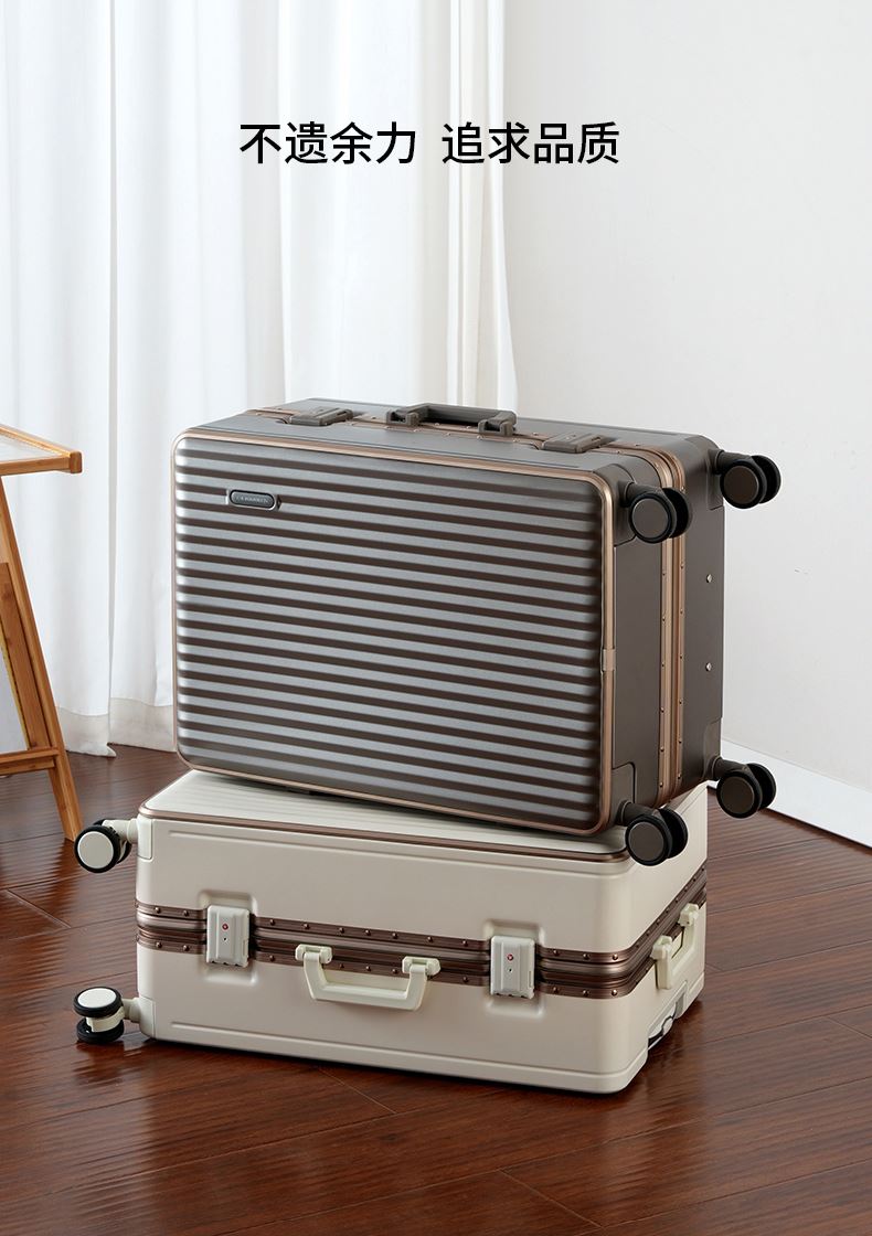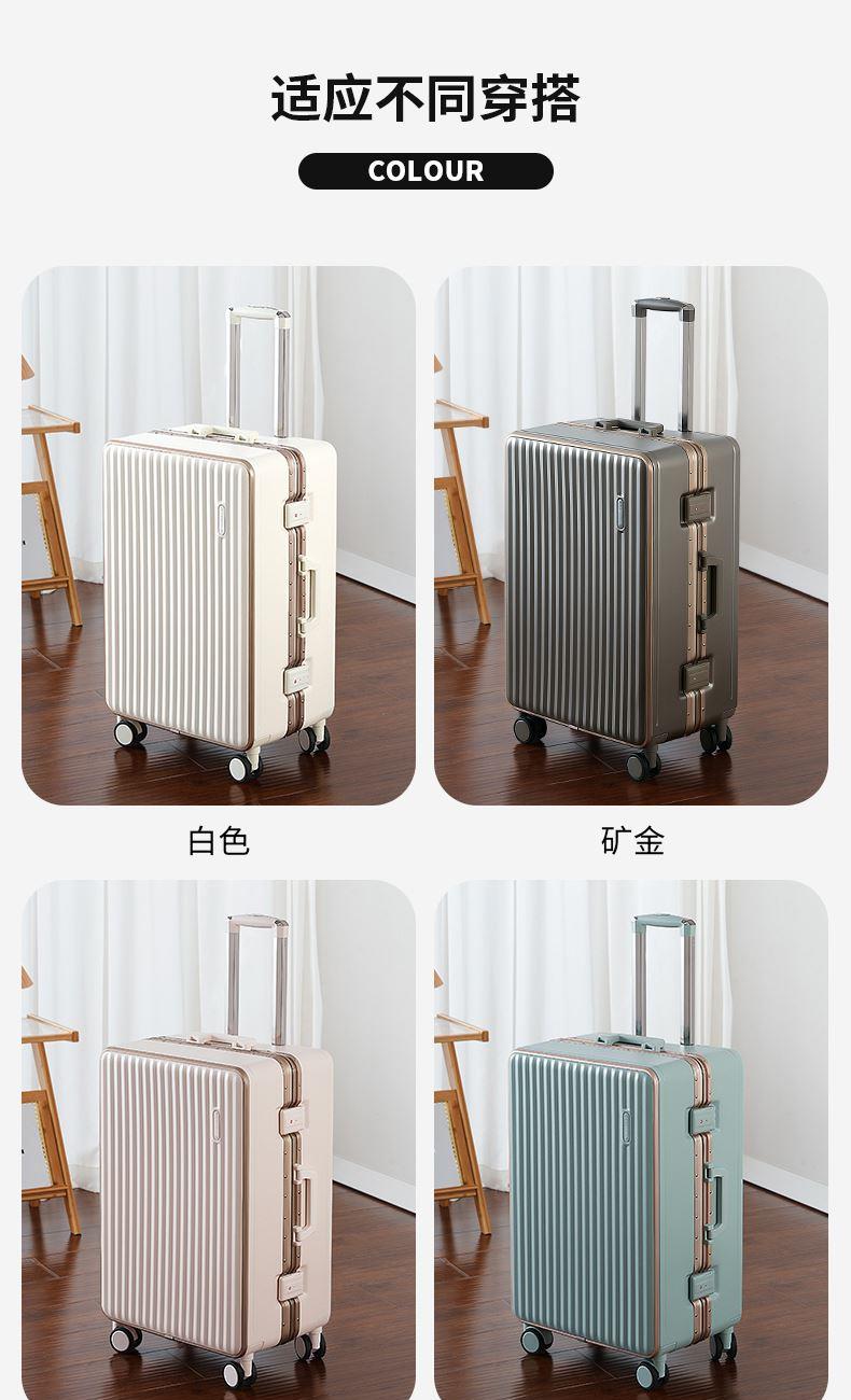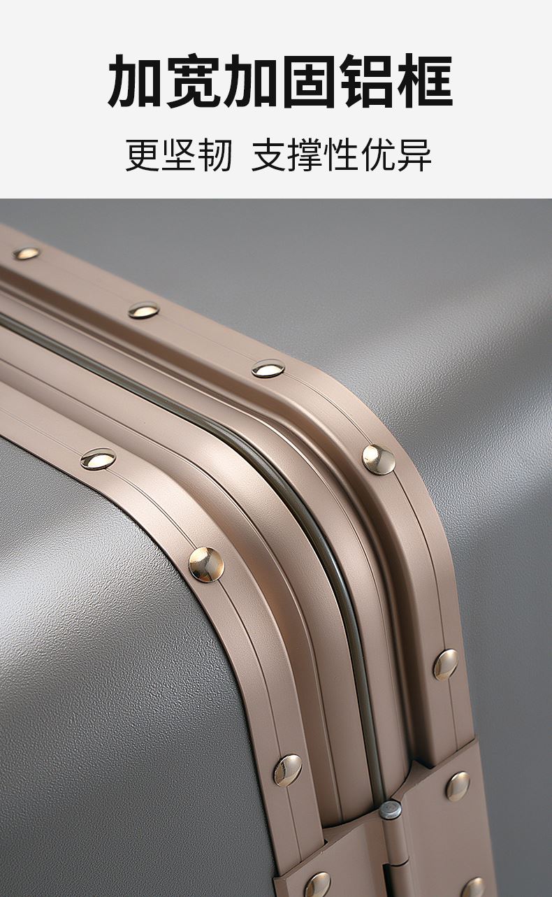 型号:TJ2013 规格:20英寸 材质:PC复合料 里料:涤纶 颜色:矿金色/白色/粉色/蓝色 等级:一等合格品 执行标准:QB/T 2155-2018 产品特点: 1、加厚PC合金外壳及铝框和合页,防刮坚固,耐磨防爆;2、加厚合金伸缩拉杆,拉合顺畅,握感舒适,结实稳固;3、带慢回弹顶部和侧部提手,竖提横提都方便;4、侧部顶脚防剐蹭,同时带方便行李挂架功能;5、内大双网结构,干湿分离,分区合理;6、双嵌入式三码密码锁,安全性高,放心旅行;7、带挡泥板TPE万向静音飞机轮,高承重,肆意而行;8、撞色金属条配饰,美观大方,时尚有质感。