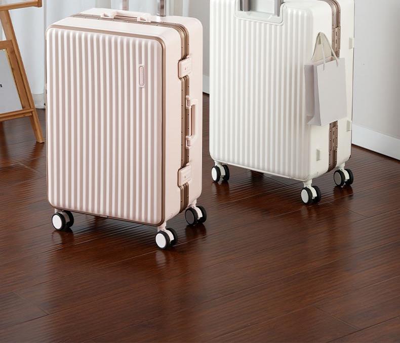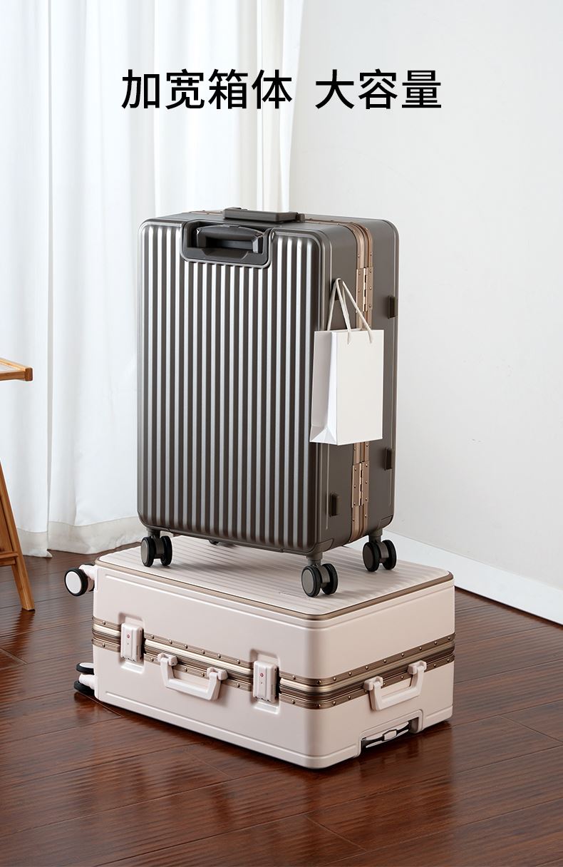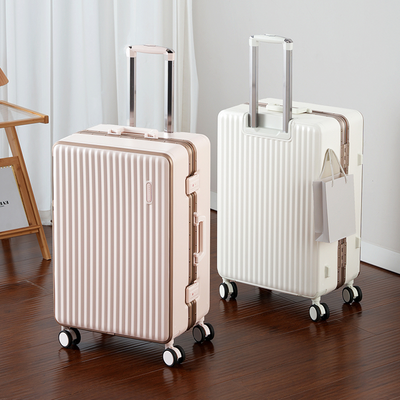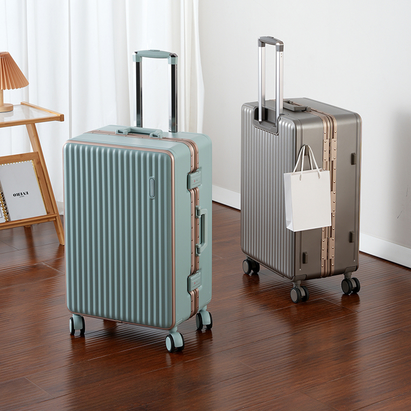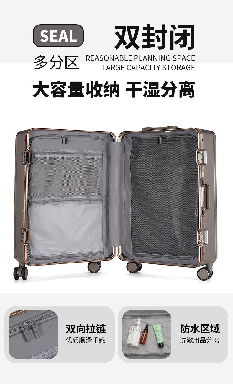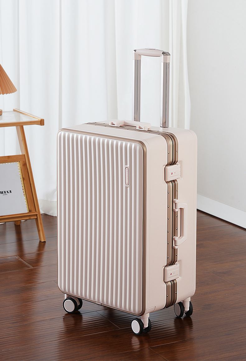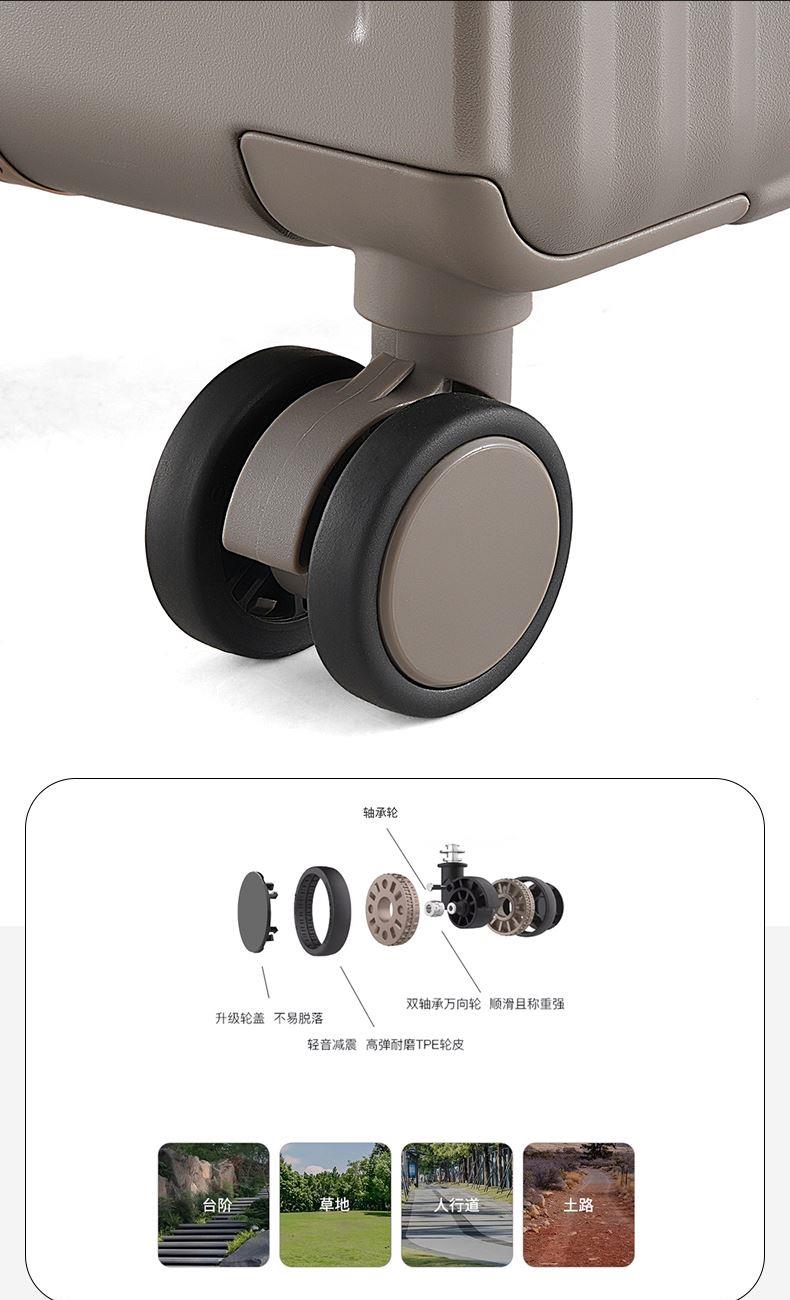 型号:TJ2013 规格:20英寸 材质:PC复合料 里料:涤纶 颜色:矿金色/白色/粉色/蓝色 等级:一等合格品 执行标准:QB/T 2155-2018 产品特点: 1、加厚PC合金外壳及铝框和合页,防刮坚固,耐磨防爆;2、加厚合金伸缩拉杆,拉合顺畅,握感舒适,结实稳固;3、带慢回弹顶部和侧部提手,竖提横提都方便;4、侧部顶脚防剐蹭,同时带方便行李挂架功能;5、内大双网结构,干湿分离,分区合理;6、双嵌入式三码密码锁,安全性高,放心旅行;7、带挡泥板TPE万向静音飞机轮,高承重,肆意而行;8、撞色金属条配饰,美观大方,时尚有质感。