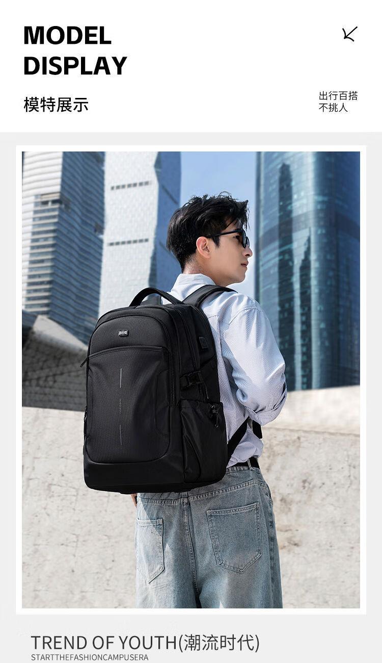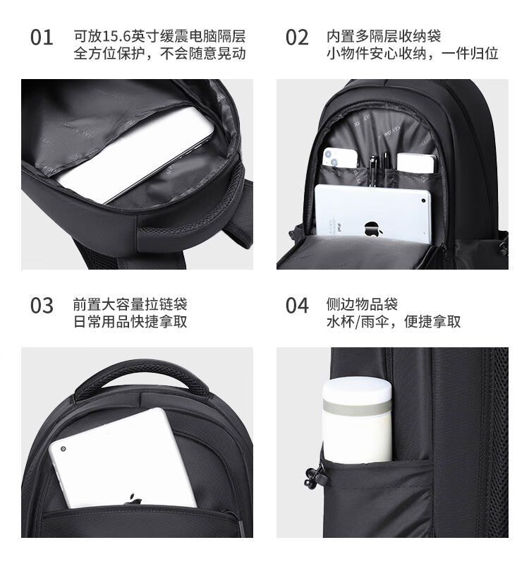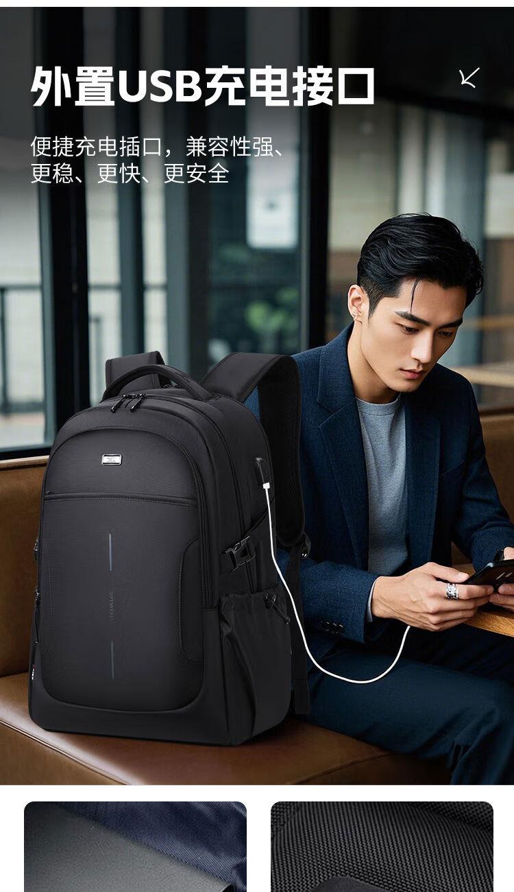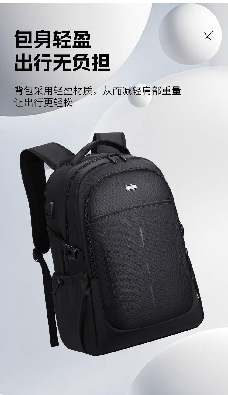 类别:背包 外部材质:织物 闭合方式:拉链 规格:300x150x450mm 容纳电脑尺寸:15.6英寸 风格:通勤风 商务风 携包出行,旅途无忧,立体挺括包型兼顾时尚外观与功能性,轻松驾驭多种都市出行场景 内里大容装载,多层收纳空间,满足多样收纳需求,轻装出行,采用高密度织物面料,防刮耐用,防泼贱,轻松应对泼水,便携外置USB充电接口,3D透气蜂窝设计,柔软减压肩带