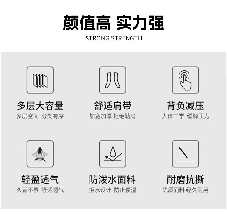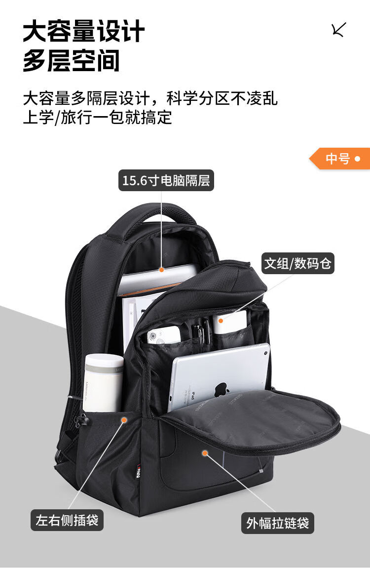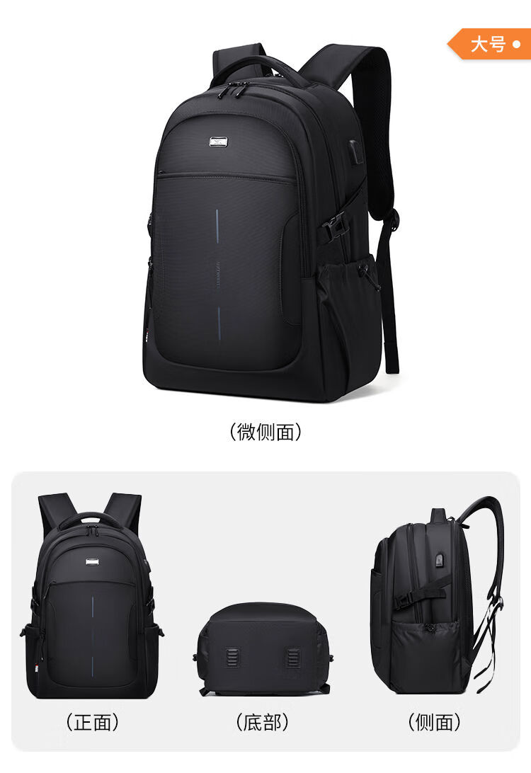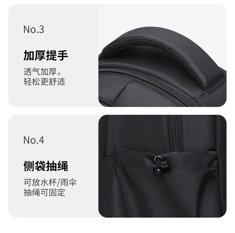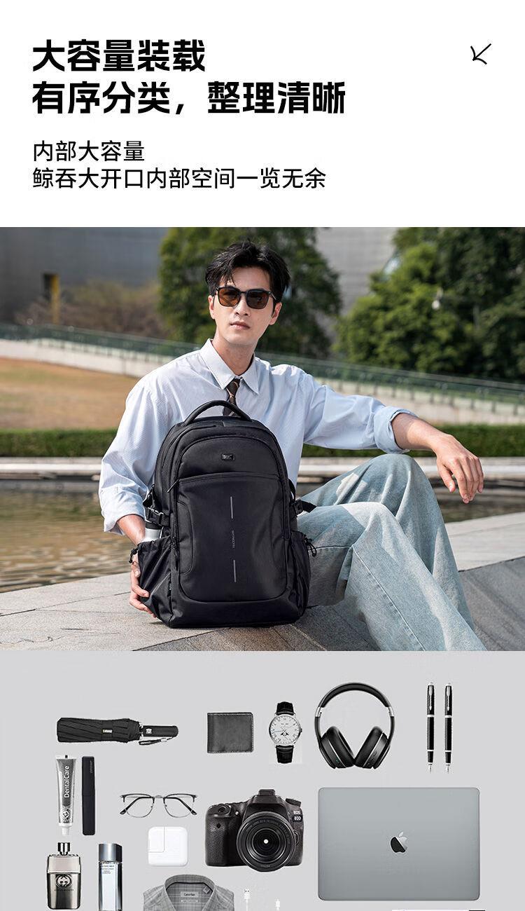 类别:背包 外部材质:织物 闭合方式:拉链 规格:300x150x450mm 容纳电脑尺寸:15.6英寸 风格:通勤风 商务风 携包出行,旅途无忧,立体挺括包型兼顾时尚外观与功能性,轻松驾驭多种都市出行场景 内里大容装载,多层收纳空间,满足多样收纳需求,轻装出行,采用高密度织物面料,防刮耐用,防泼贱,轻松应对泼水,便携外置USB充电接口,3D透气蜂窝设计,柔软减压肩带
