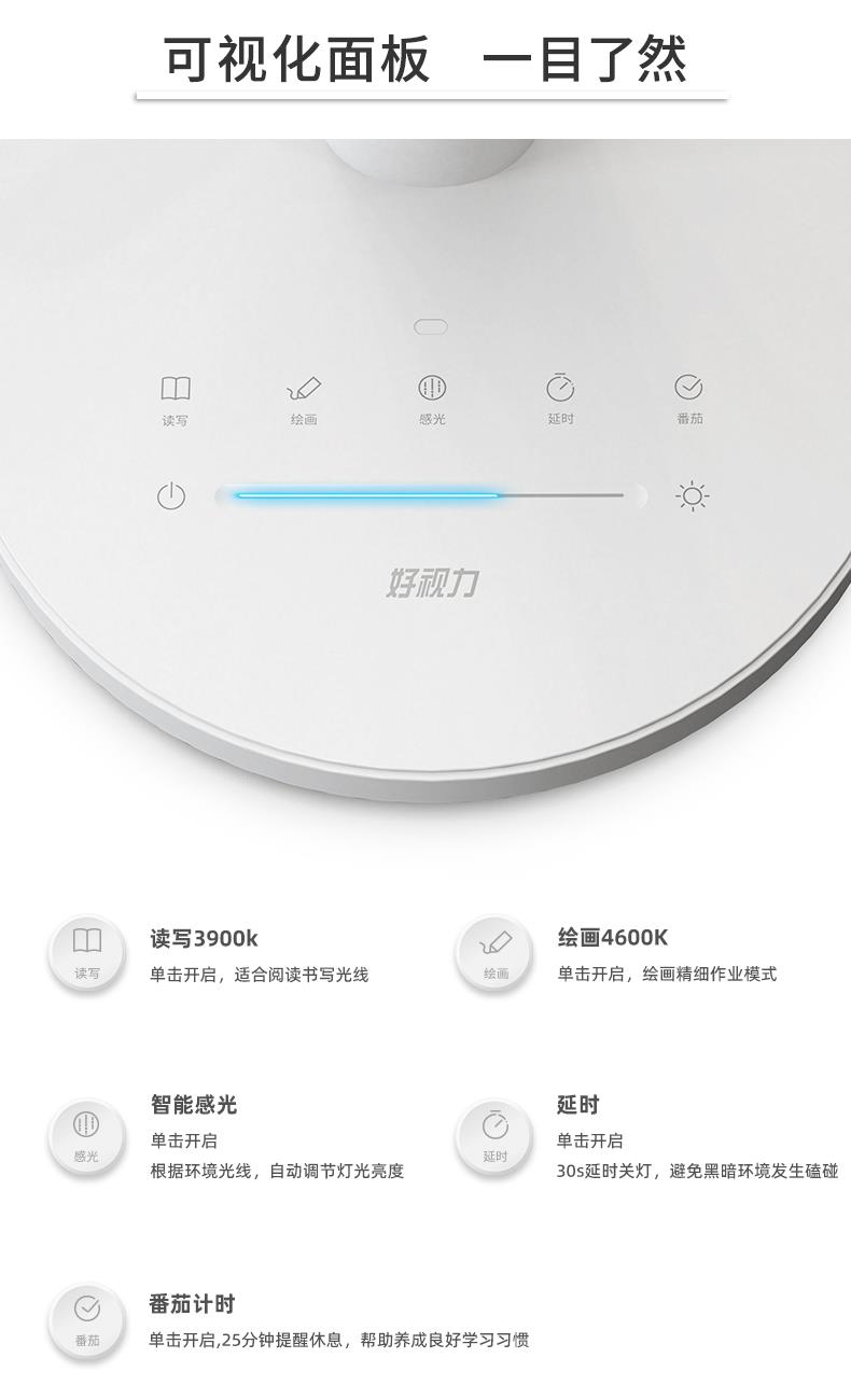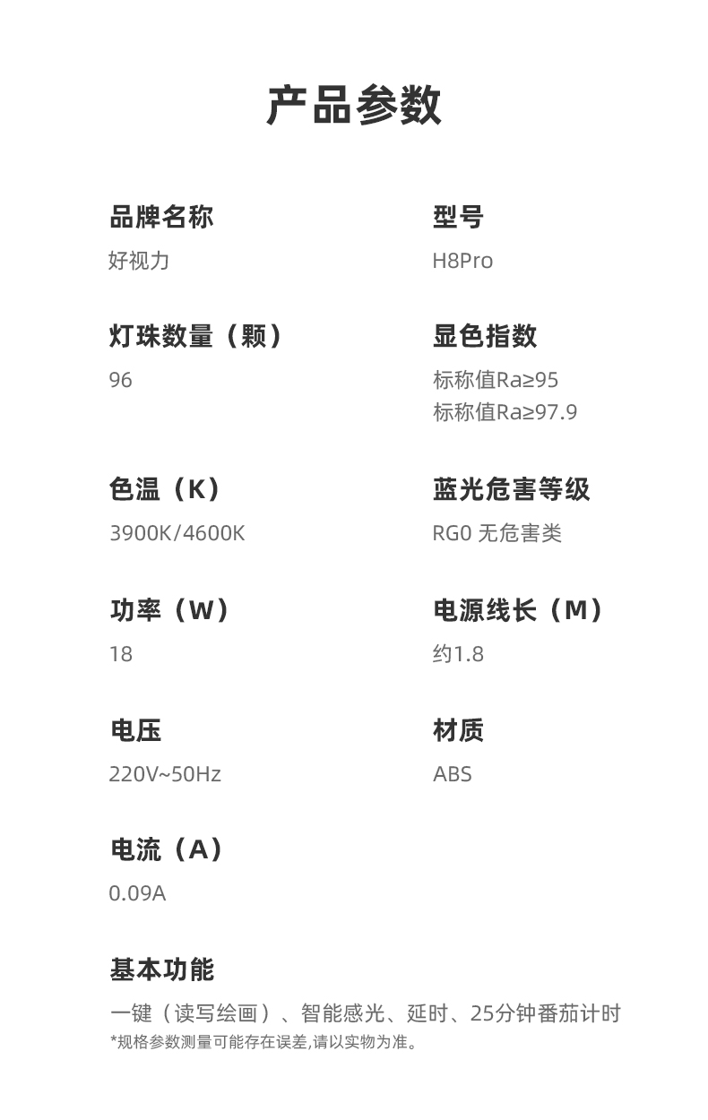 护眼功能:全光谱 防蓝光指数:RG0(豁免伤害) 智能功能:智能调光 开关方式:触摸开关 灯身材质:ABS 供电方式:插座 显色指数:Ra96-98(含) 包装清单:台灯*1,适配器*1,说明书保修卡*1