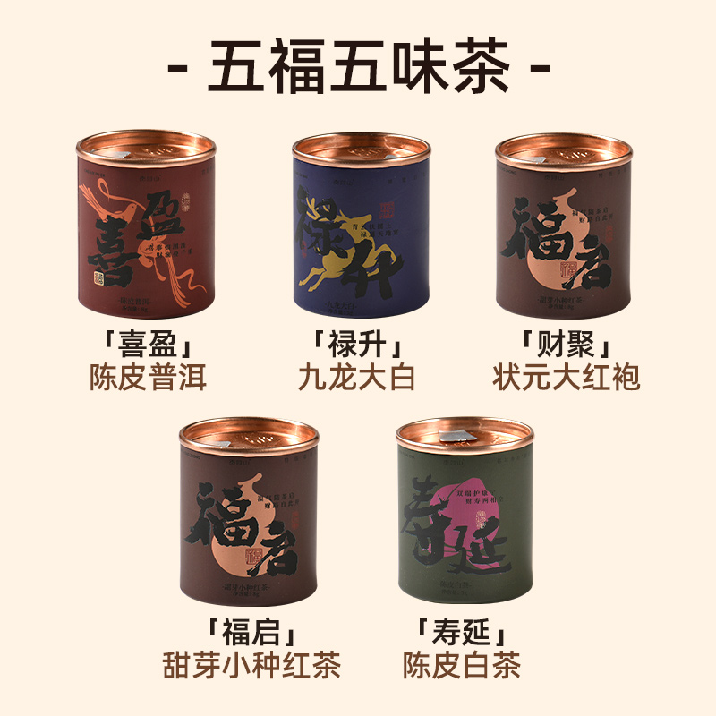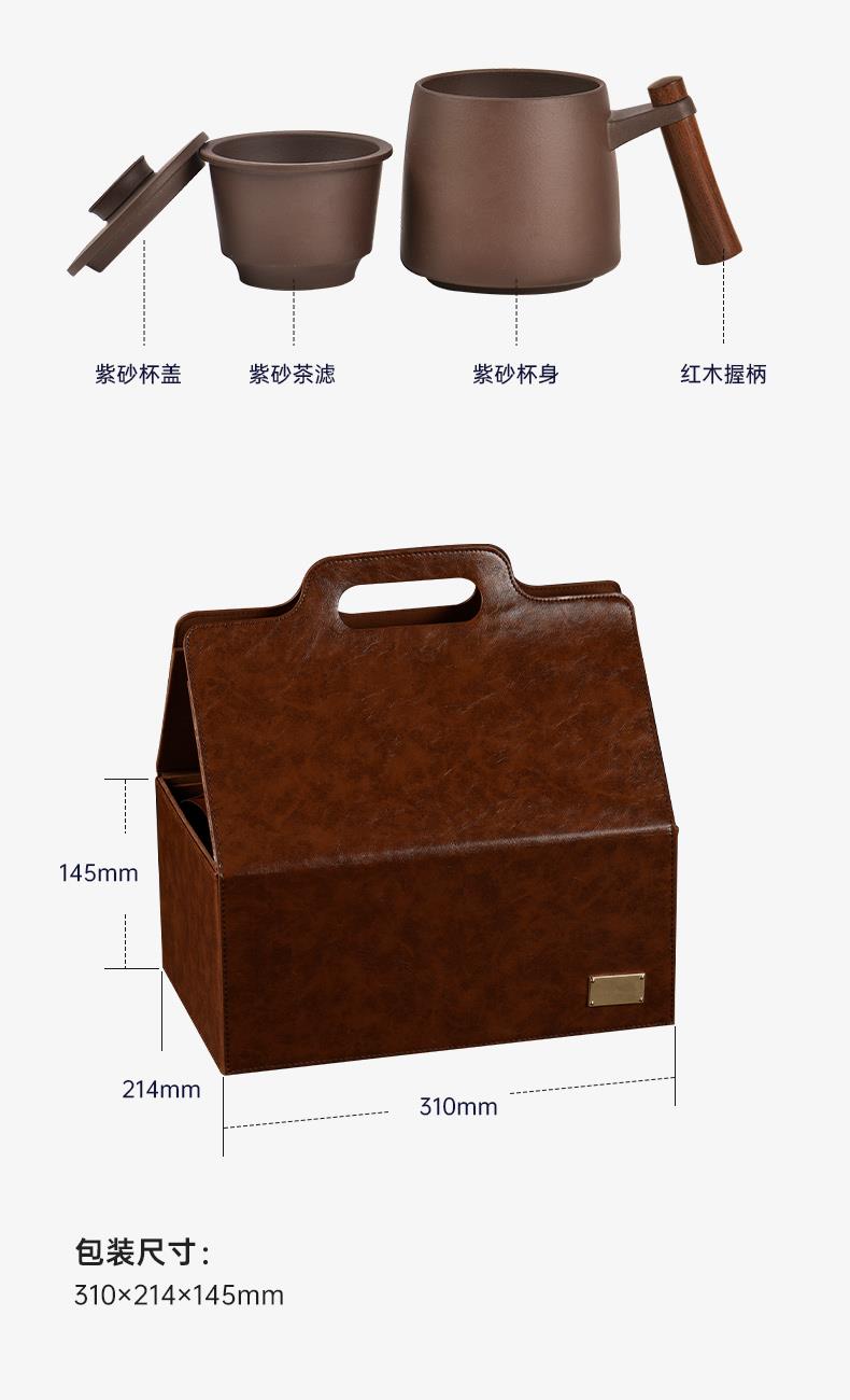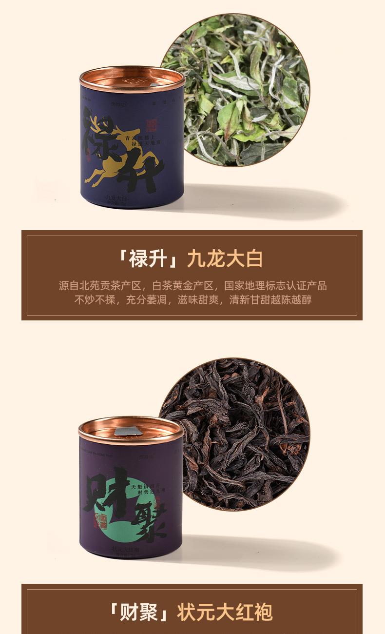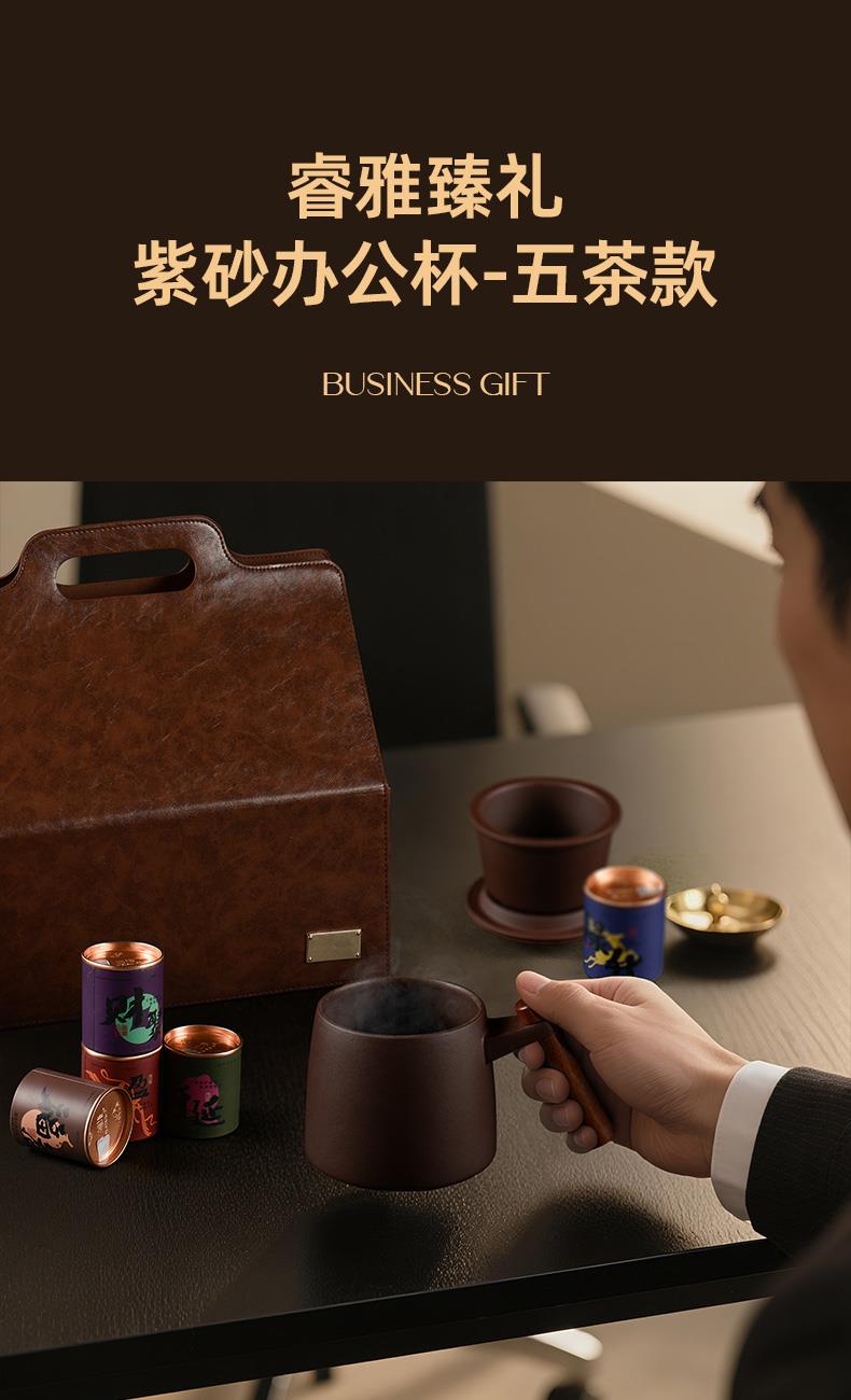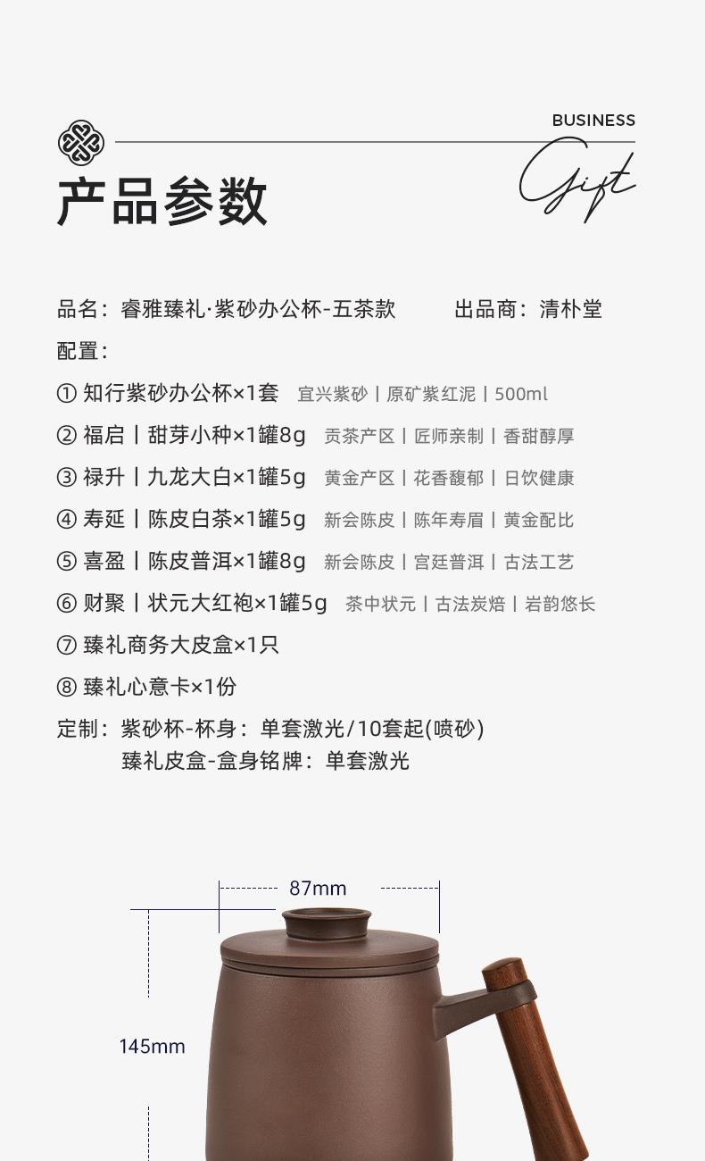 配置 · ① 知行紫砂办公杯×1套 【宜兴紫砂丨原矿紫红泥丨600ml】 ② 福启丨甜芽小种×1罐8g 【贡茶产区丨匠师亲制丨香甜醇厚】 ③ 禄升丨九龙大白×1罐5g 【黄金产区丨花香馥郁丨日饮健康】 ④ 寿延丨陈皮白茶×1罐5g 【新会陈皮丨陈年寿眉丨黄金配比】 ⑤ 喜盈丨陈皮普洱×1罐8g 【新会陈皮丨宫廷普洱丨古法工艺】 ⑥ 财聚丨状元大红袍×1罐5g 【茶中状元丨古法炭焙丨岩韵悠长】 ⑦ 臻礼商务大皮盒×1只 丨 ⑧ 臻礼心意卡×1份