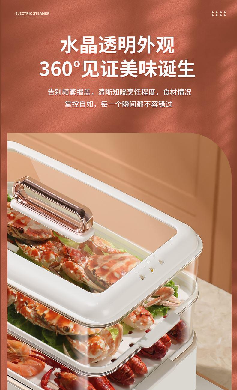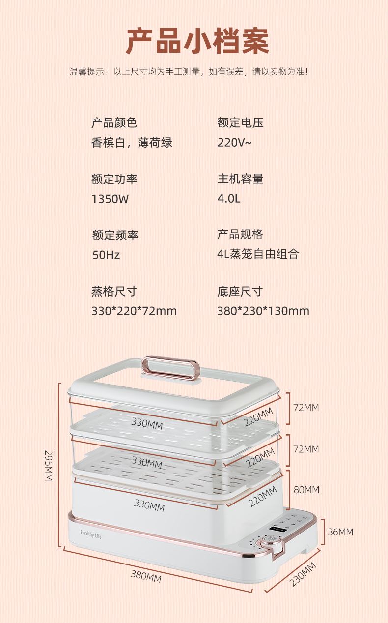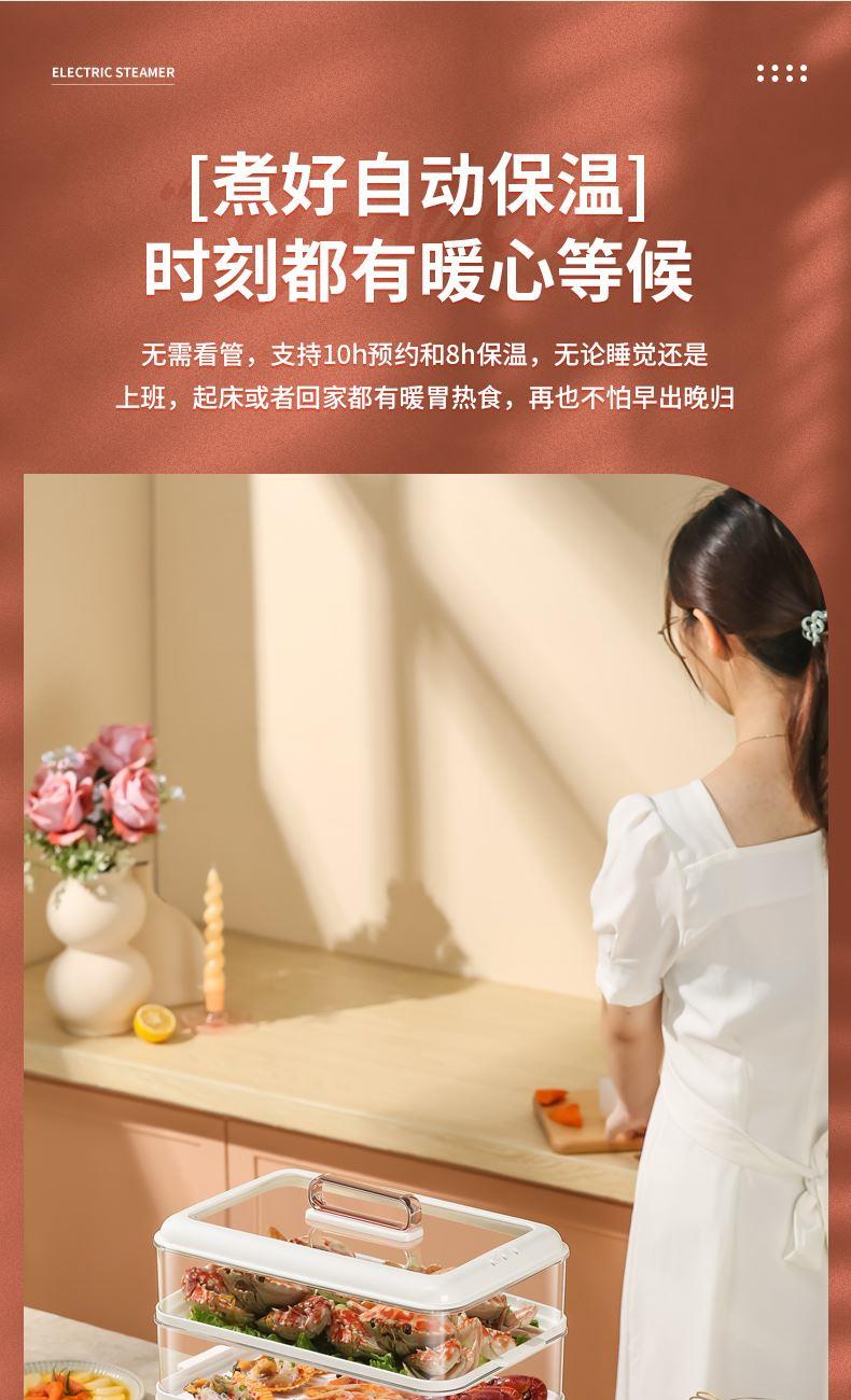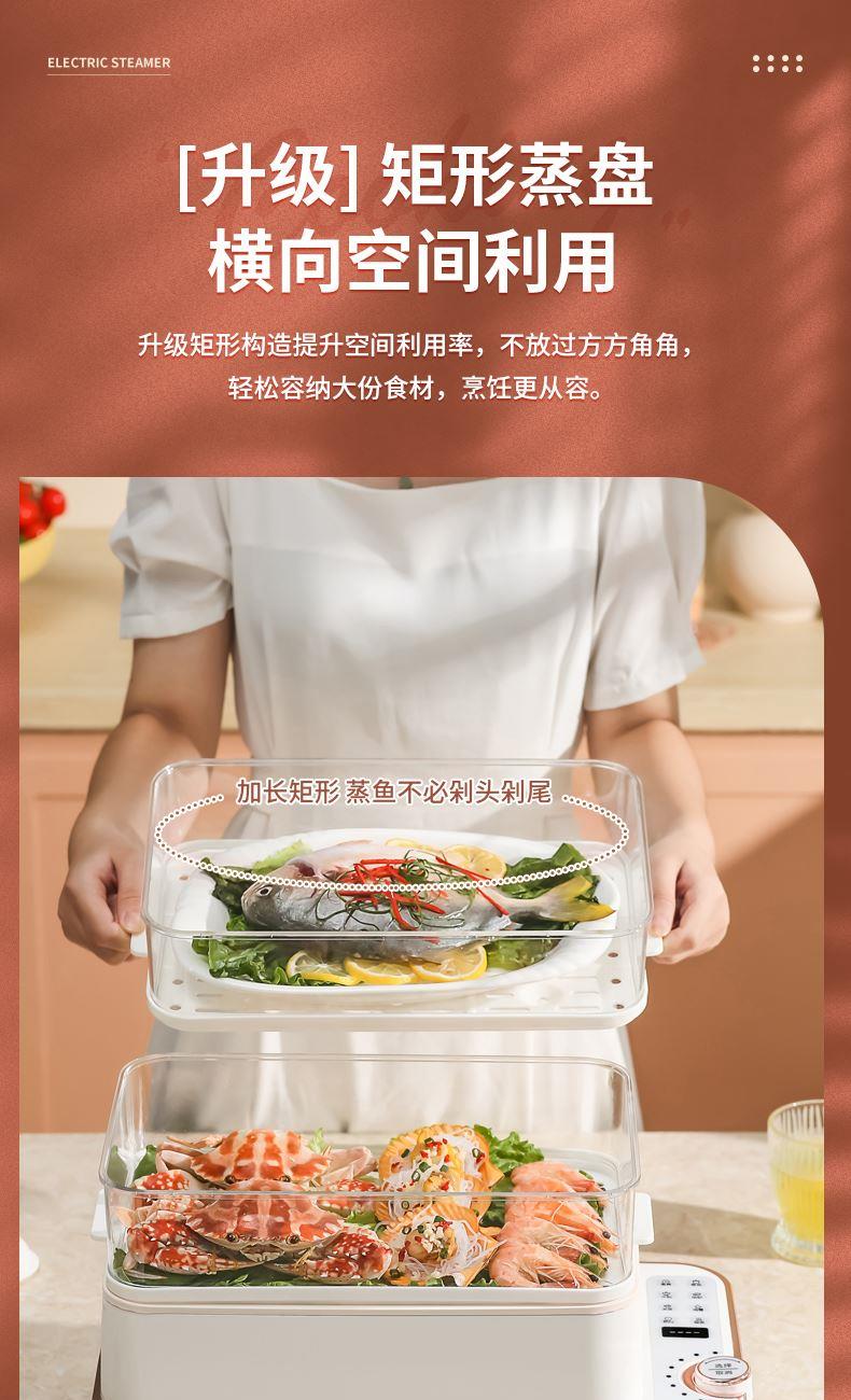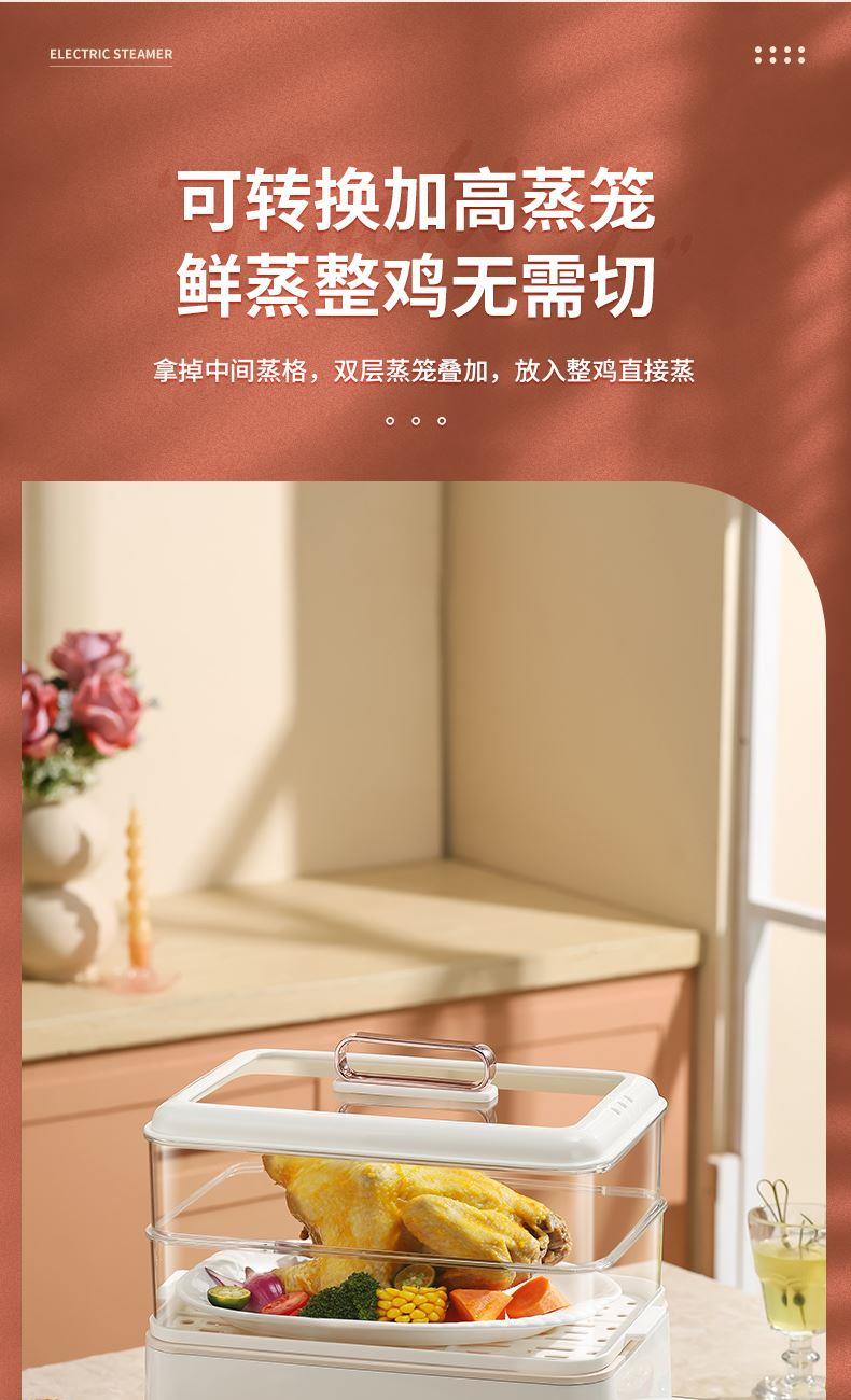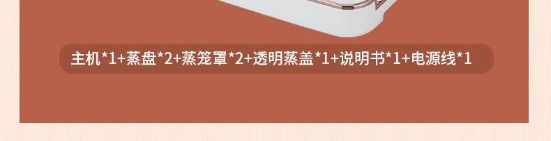 产品功率:1350W 产品容量:底锅4L+两层蒸笼8L,总12L 产品颜色:绿色 产品款式:4L蒸笼自有组合 包装清单:主机、透明盖、蒸格、电源线、说明书 蒸格尺寸:330*220*72mm 底座尺寸:380*230*130mm 特色功能 1、巧设导流孔蒸格,科学排水不浸水;底部多孔散热,保证烹饪安全; 2、可视化蒸盖,烹煮过程更好掌握火候;镀金提手,隔层隔热不会烫手; 3、可分离电线,清洗方便,安全使用;主机容量4L,蒸笼自有组合; 4、1350W大功率,烹饪无需等待;食品级PP材质,耐高温不易变形,耐酸,耐磨不易碎; 5、支持10小时预约和8小时保温;360°整圈发热,受热均匀不易焦; 6、自动断电,防干烧功能;一机多用,可用于婴儿用品高温蒸汽消毒,更安全;