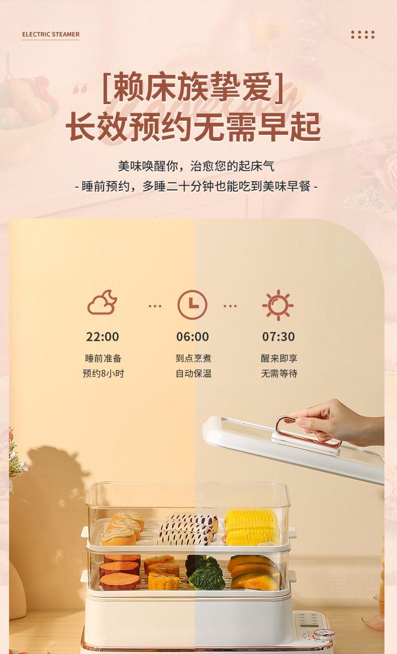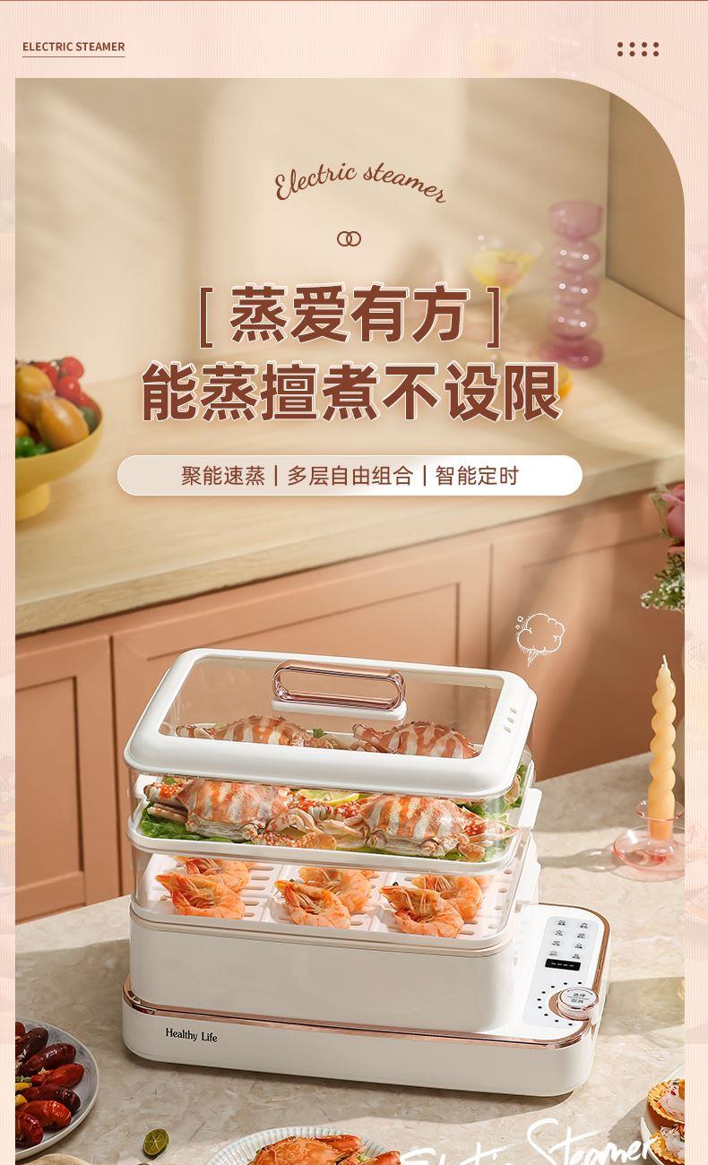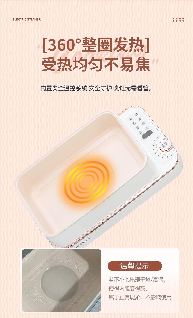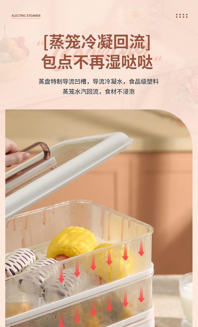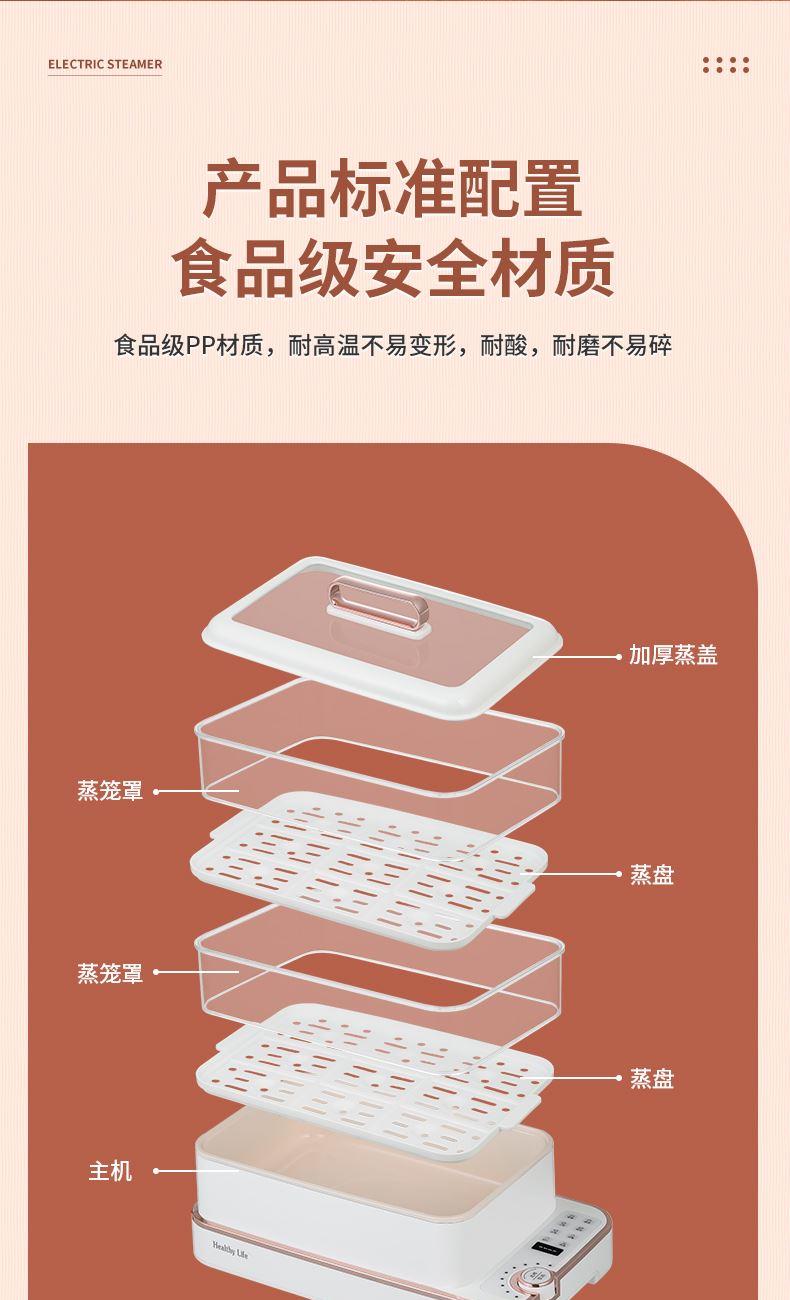 产品功率:1350W 产品容量:底锅4L+两层蒸笼8L,总12L 产品颜色:绿色 产品款式:4L蒸笼自有组合 包装清单:主机、透明盖、蒸格、电源线、说明书 蒸格尺寸:330*220*72mm 底座尺寸:380*230*130mm 特色功能 1、巧设导流孔蒸格,科学排水不浸水;底部多孔散热,保证烹饪安全; 2、可视化蒸盖,烹煮过程更好掌握火候;镀金提手,隔层隔热不会烫手; 3、可分离电线,清洗方便,安全使用;主机容量4L,蒸笼自有组合; 4、1350W大功率,烹饪无需等待;食品级PP材质,耐高温不易变形,耐酸,耐磨不易碎; 5、支持10小时预约和8小时保温;360°整圈发热,受热均匀不易焦; 6、自动断电,防干烧功能;一机多用,可用于婴儿用品高温蒸汽消毒,更安全;