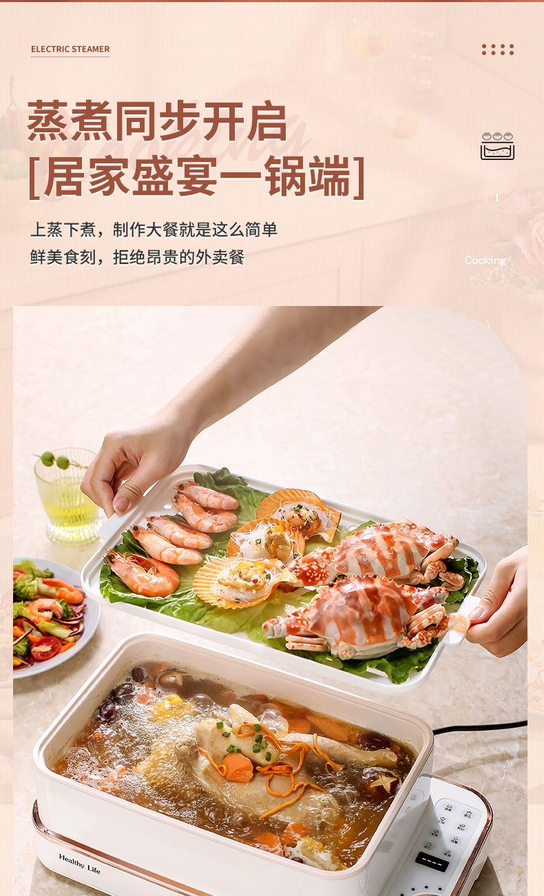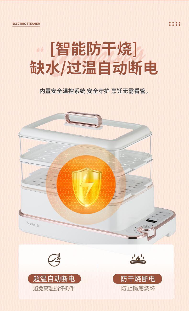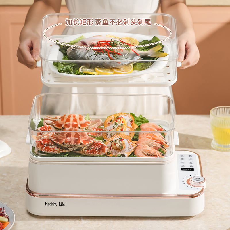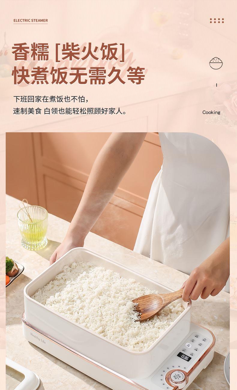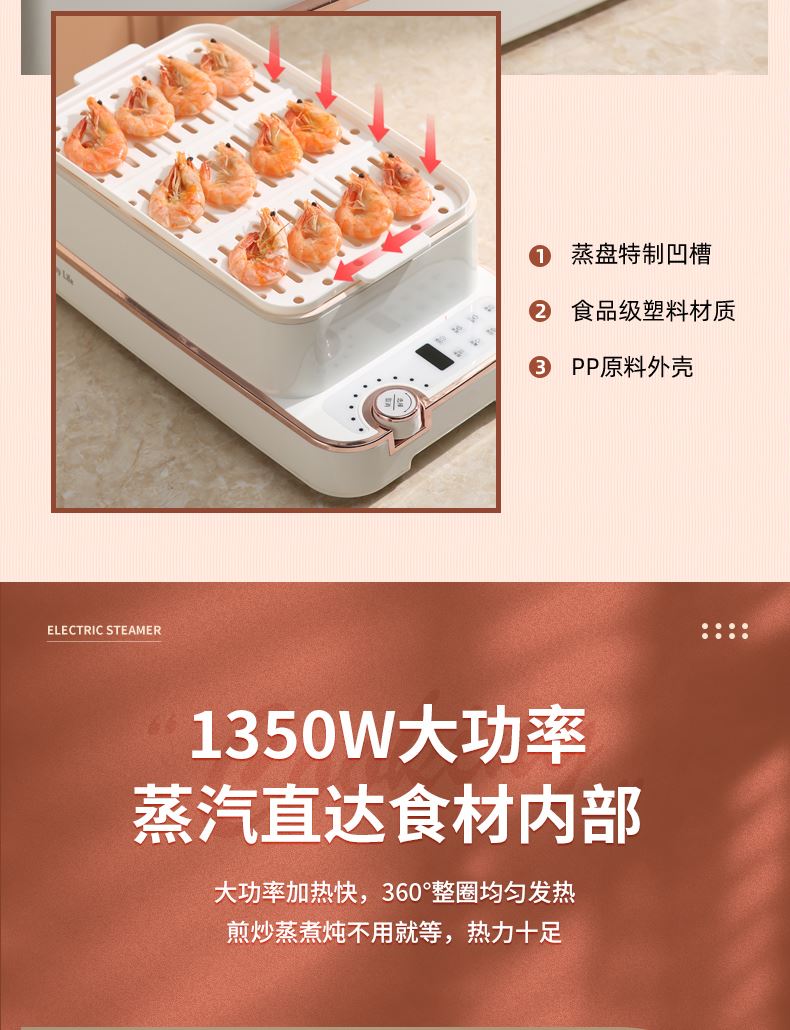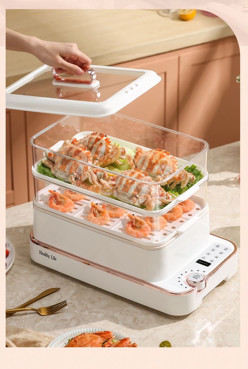 产品功率:1350W 产品容量:底锅4L+两层蒸笼8L,总12L 产品颜色:绿色 产品款式:4L蒸笼自有组合 包装清单:主机、透明盖、蒸格、电源线、说明书 蒸格尺寸:330*220*72mm 底座尺寸:380*230*130mm 特色功能 1、巧设导流孔蒸格,科学排水不浸水;底部多孔散热,保证烹饪安全; 2、可视化蒸盖,烹煮过程更好掌握火候;镀金提手,隔层隔热不会烫手; 3、可分离电线,清洗方便,安全使用;主机容量4L,蒸笼自有组合; 4、1350W大功率,烹饪无需等待;食品级PP材质,耐高温不易变形,耐酸,耐磨不易碎; 5、支持10小时预约和8小时保温;360°整圈发热,受热均匀不易焦; 6、自动断电,防干烧功能;一机多用,可用于婴儿用品高温蒸汽消毒,更安全;