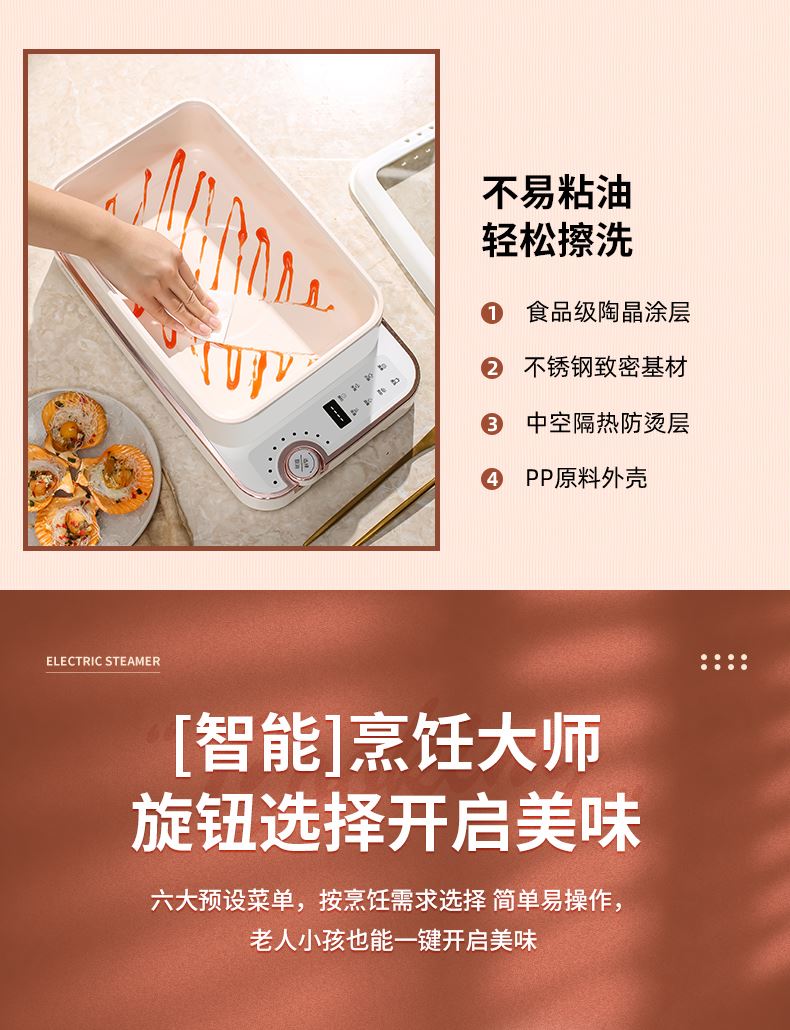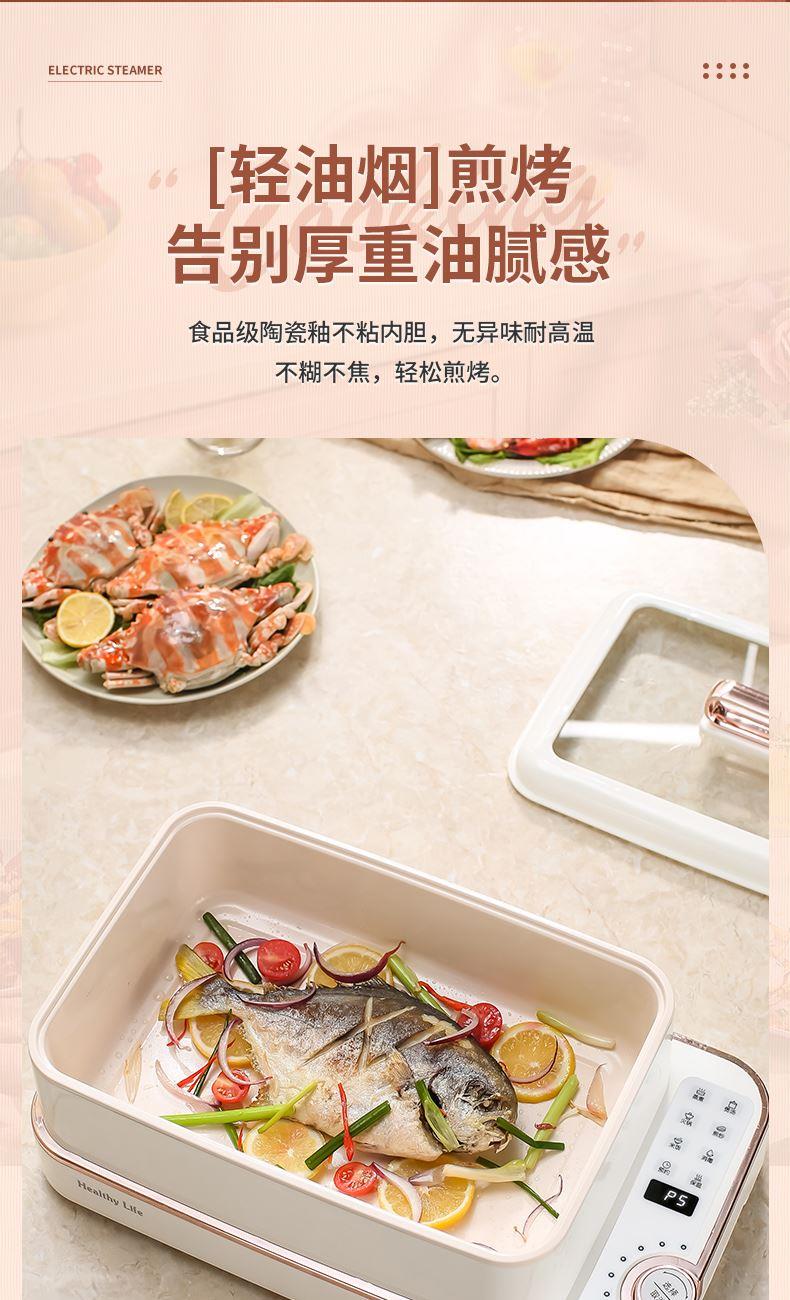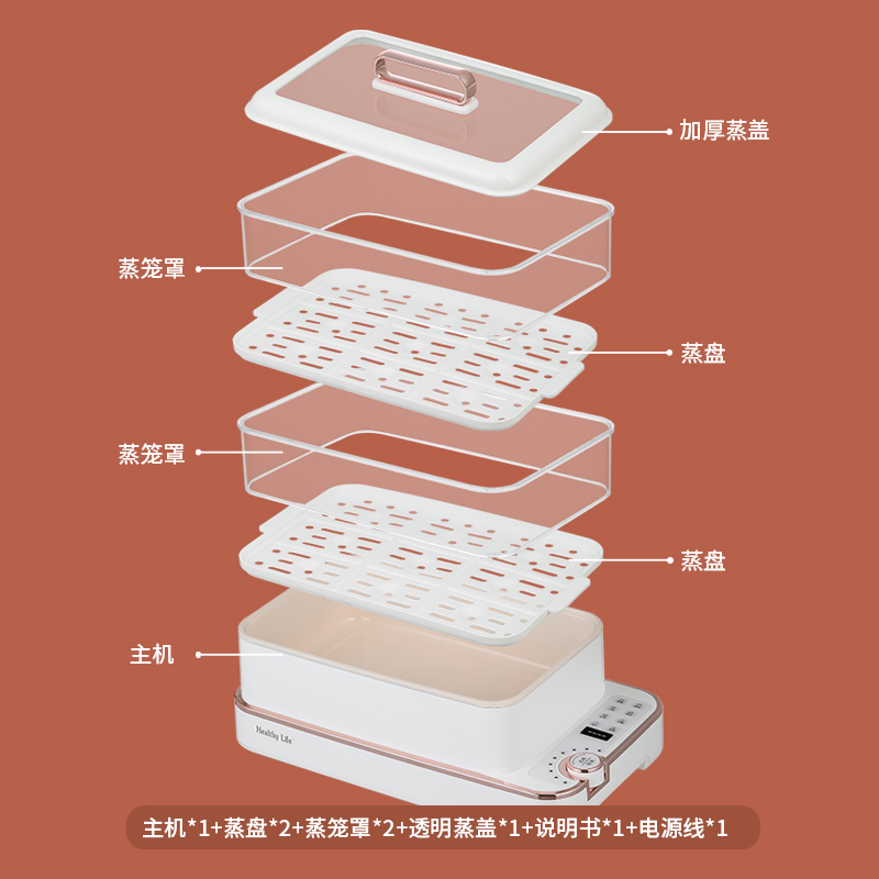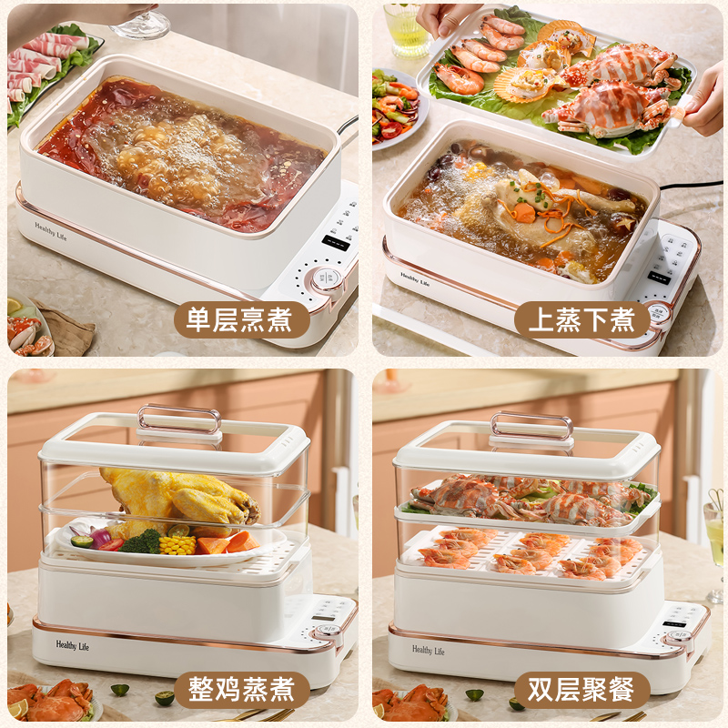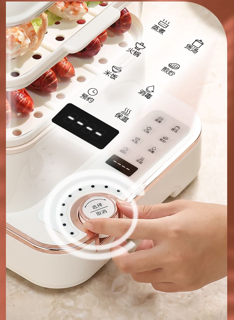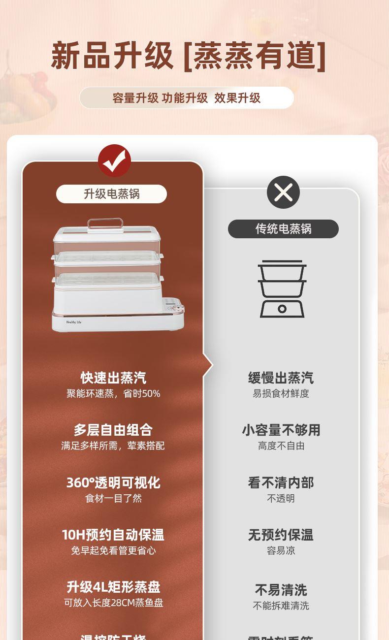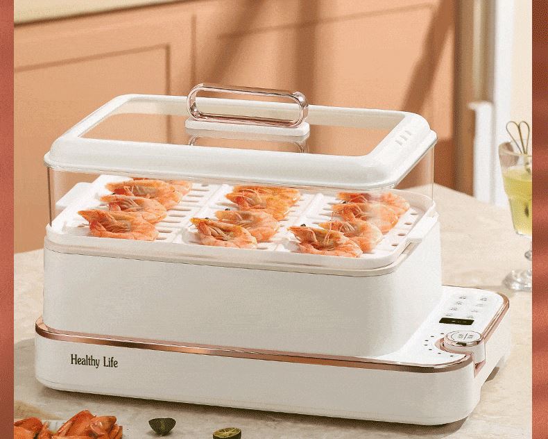 产品功率:1350W 产品容量:底锅4L+两层蒸笼8L,总12L 产品颜色:绿色 产品款式:4L蒸笼自有组合 包装清单:主机、透明盖、蒸格、电源线、说明书 蒸格尺寸:330*220*72mm 底座尺寸:380*230*130mm 特色功能 1、巧设导流孔蒸格,科学排水不浸水;底部多孔散热,保证烹饪安全; 2、可视化蒸盖,烹煮过程更好掌握火候;镀金提手,隔层隔热不会烫手; 3、可分离电线,清洗方便,安全使用;主机容量4L,蒸笼自有组合; 4、1350W大功率,烹饪无需等待;食品级PP材质,耐高温不易变形,耐酸,耐磨不易碎; 5、支持10小时预约和8小时保温;360°整圈发热,受热均匀不易焦; 6、自动断电,防干烧功能;一机多用,可用于婴儿用品高温蒸汽消毒,更安全;
