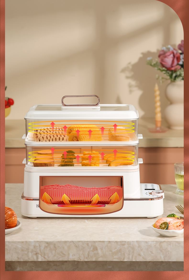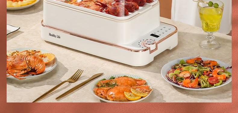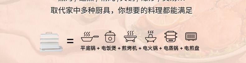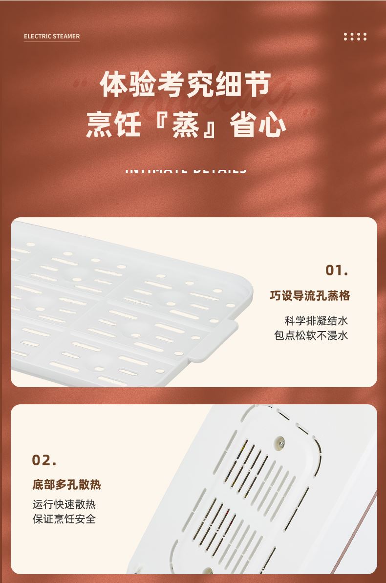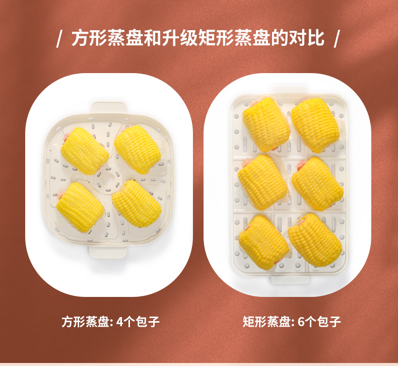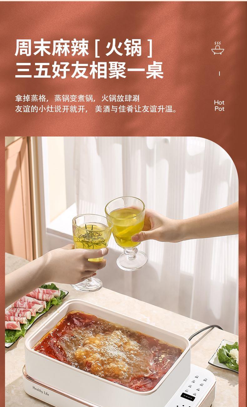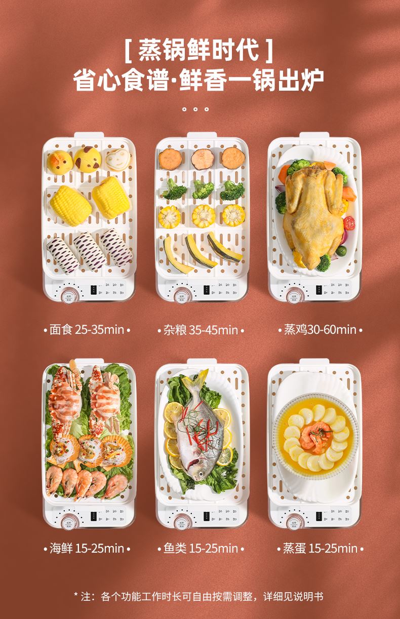 产品功率:1350W 产品容量:底锅4L+两层蒸笼8L,总12L 产品颜色:绿色 产品款式:4L蒸笼自有组合 包装清单:主机、透明盖、蒸格、电源线、说明书 蒸格尺寸:330*220*72mm 底座尺寸:380*230*130mm 特色功能 1、巧设导流孔蒸格,科学排水不浸水;底部多孔散热,保证烹饪安全; 2、可视化蒸盖,烹煮过程更好掌握火候;镀金提手,隔层隔热不会烫手; 3、可分离电线,清洗方便,安全使用;主机容量4L,蒸笼自有组合; 4、1350W大功率,烹饪无需等待;食品级PP材质,耐高温不易变形,耐酸,耐磨不易碎; 5、支持10小时预约和8小时保温;360°整圈发热,受热均匀不易焦; 6、自动断电,防干烧功能;一机多用,可用于婴儿用品高温蒸汽消毒,更安全;