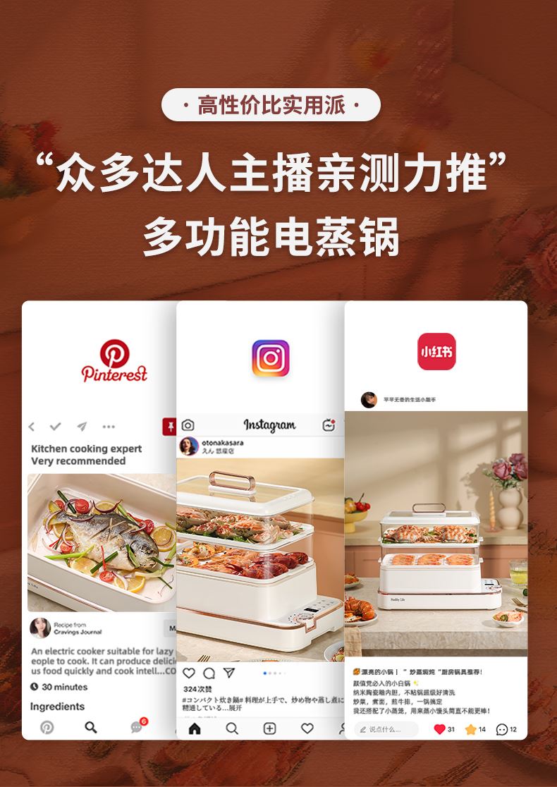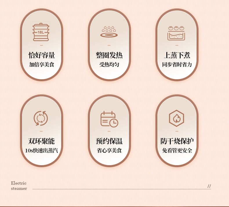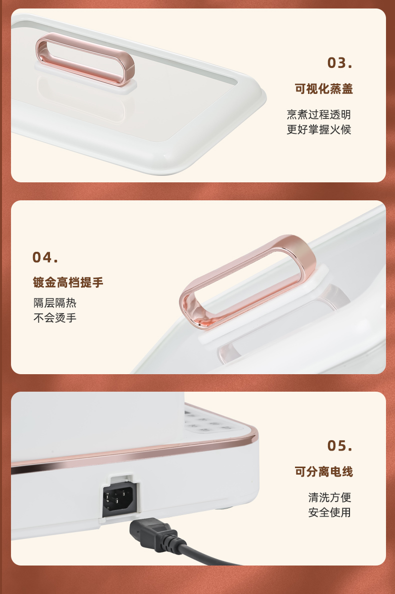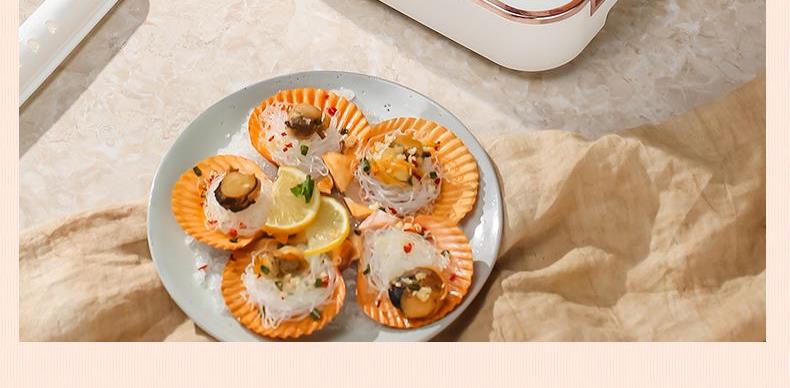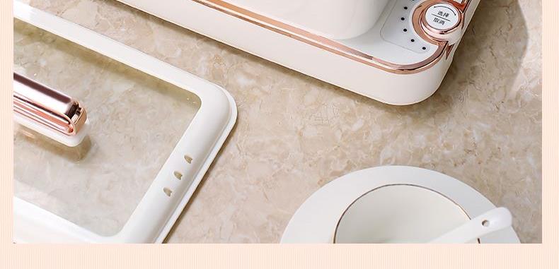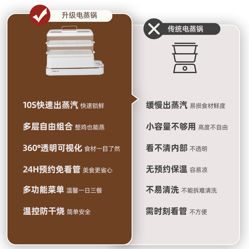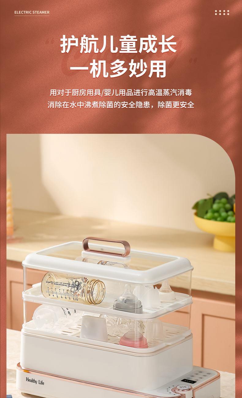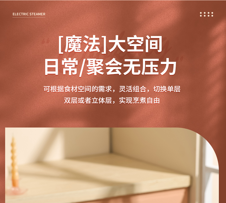 产品功率:1350W 产品容量:底锅4L+两层蒸笼8L,总12L 产品颜色:绿色 产品款式:4L蒸笼自有组合 包装清单:主机、透明盖、蒸格、电源线、说明书 蒸格尺寸:330*220*72mm 底座尺寸:380*230*130mm 特色功能 1、巧设导流孔蒸格,科学排水不浸水;底部多孔散热,保证烹饪安全; 2、可视化蒸盖,烹煮过程更好掌握火候;镀金提手,隔层隔热不会烫手; 3、可分离电线,清洗方便,安全使用;主机容量4L,蒸笼自有组合; 4、1350W大功率,烹饪无需等待;食品级PP材质,耐高温不易变形,耐酸,耐磨不易碎; 5、支持10小时预约和8小时保温;360°整圈发热,受热均匀不易焦; 6、自动断电,防干烧功能;一机多用,可用于婴儿用品高温蒸汽消毒,更安全;