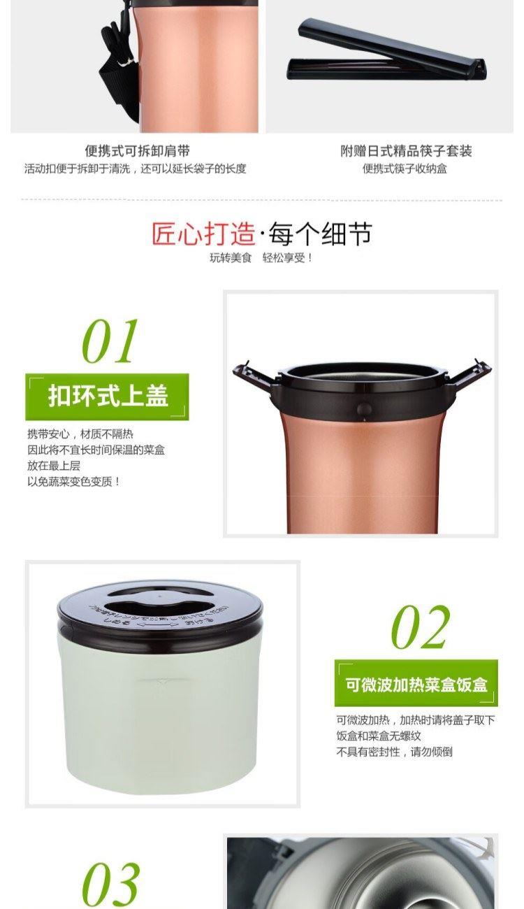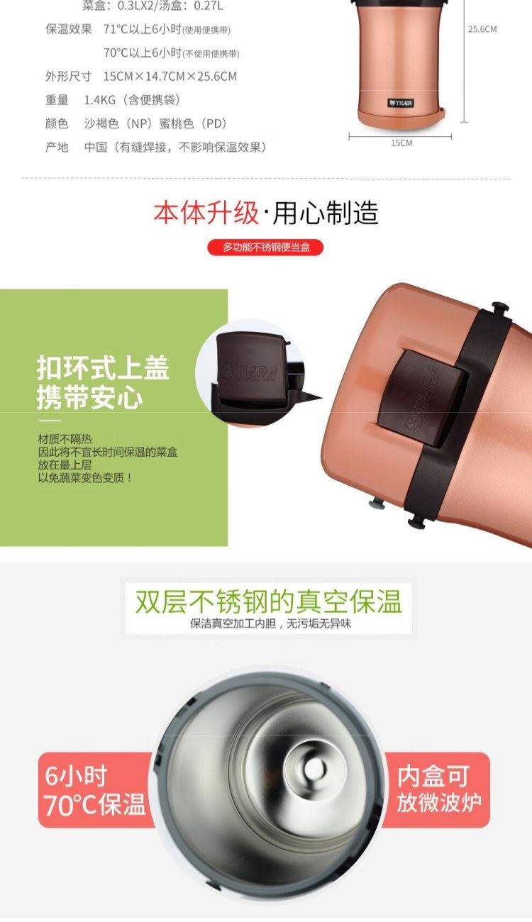 容量饭盒:0.61L/菜盒:0.3LX2/汤盒:0.27L保温效果:71℃以上6小时(使用便携带)
