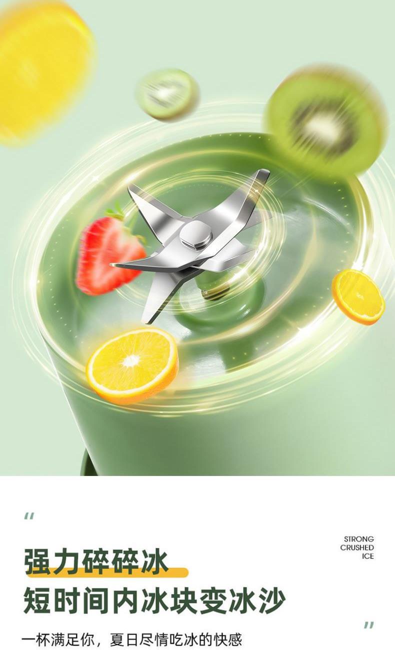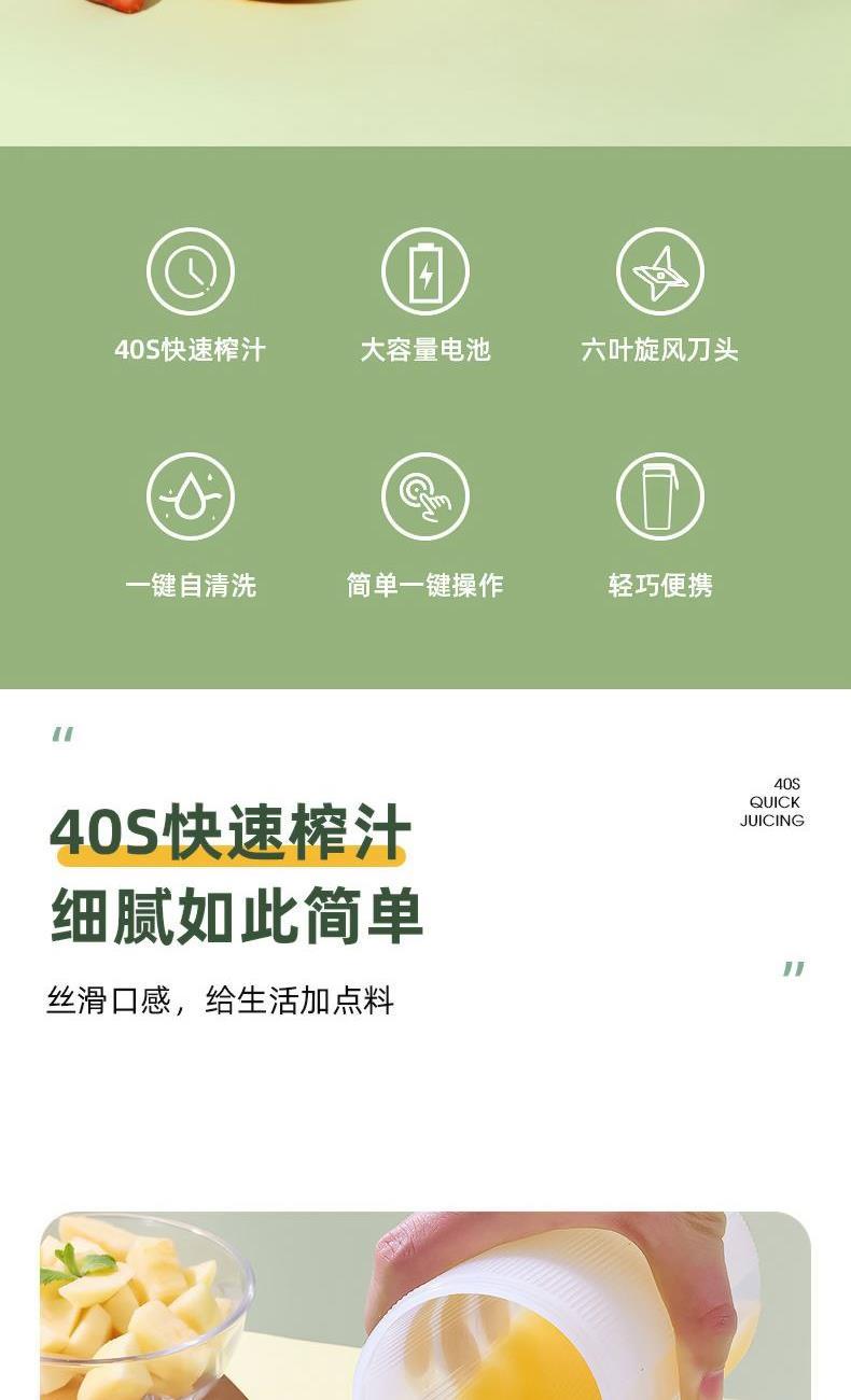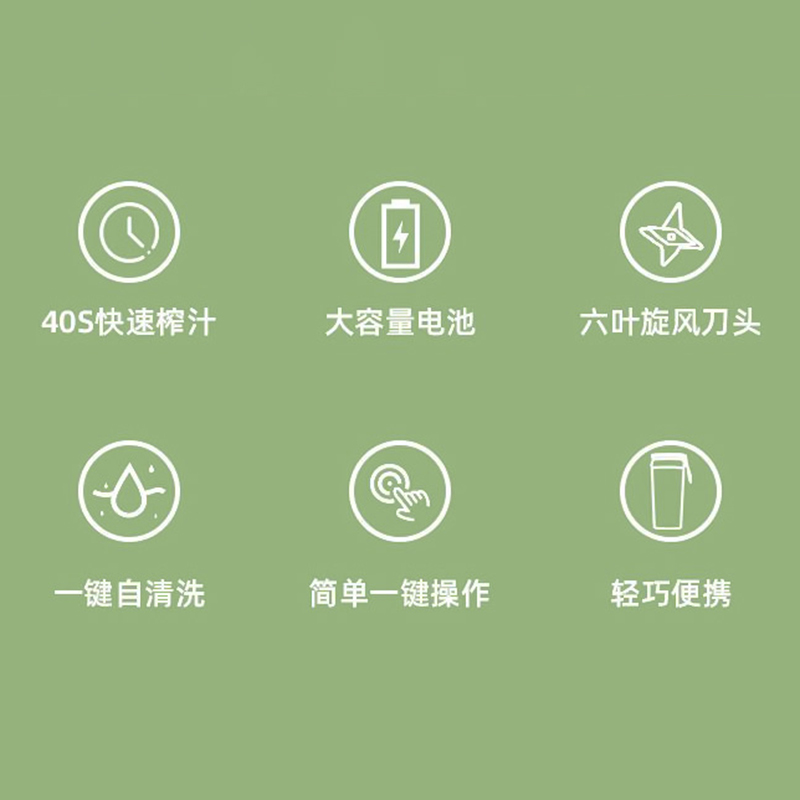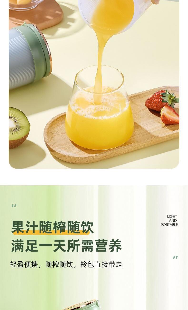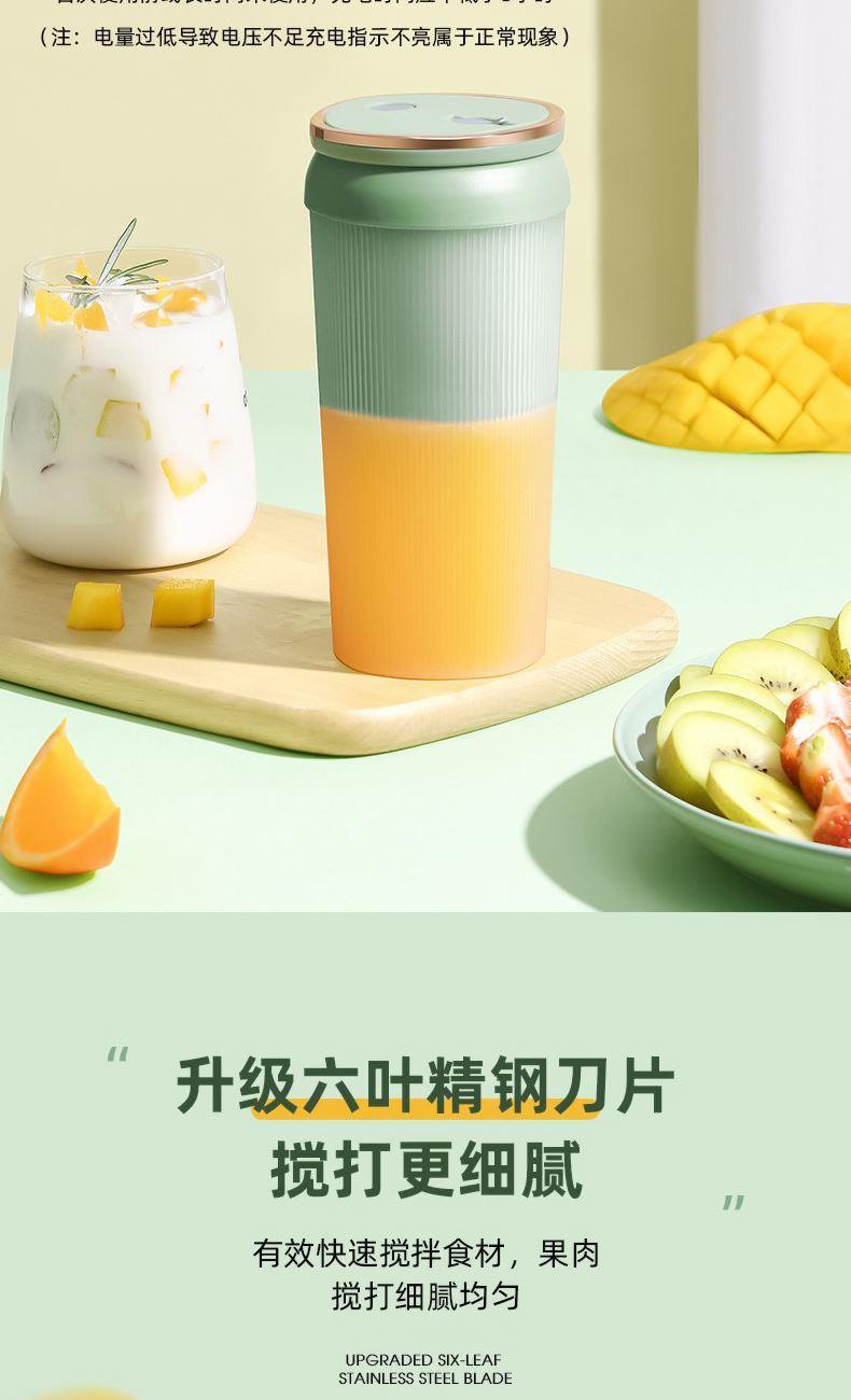 260ML便携容量,能当榨汁机也能当杯子 30W功率,USB便携式充电,充满一次电,可榨15杯左右 四叶不锈钢刀头,立体搅拌,充分旋转,口感细腻 双击启动,轻轻摇晃,马上实现果汁自由 一键清洗,机身分离不易藏垢,易清洗干净无残留 电脑、充电宝、车载可充,居家户外,不用担心没电喝不上新鲜果汁 硅胶密封圈防滴漏,USB接口硅胶防尘塞,防水又防尘