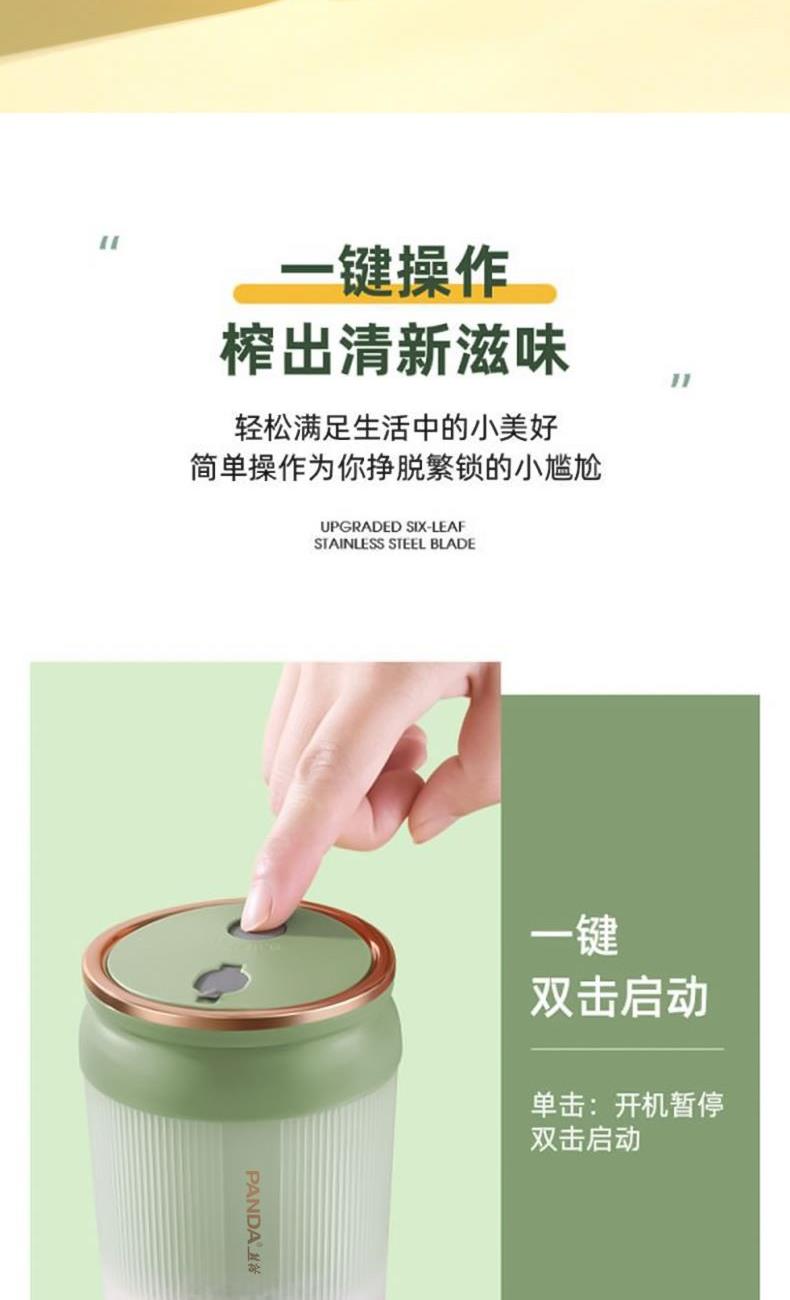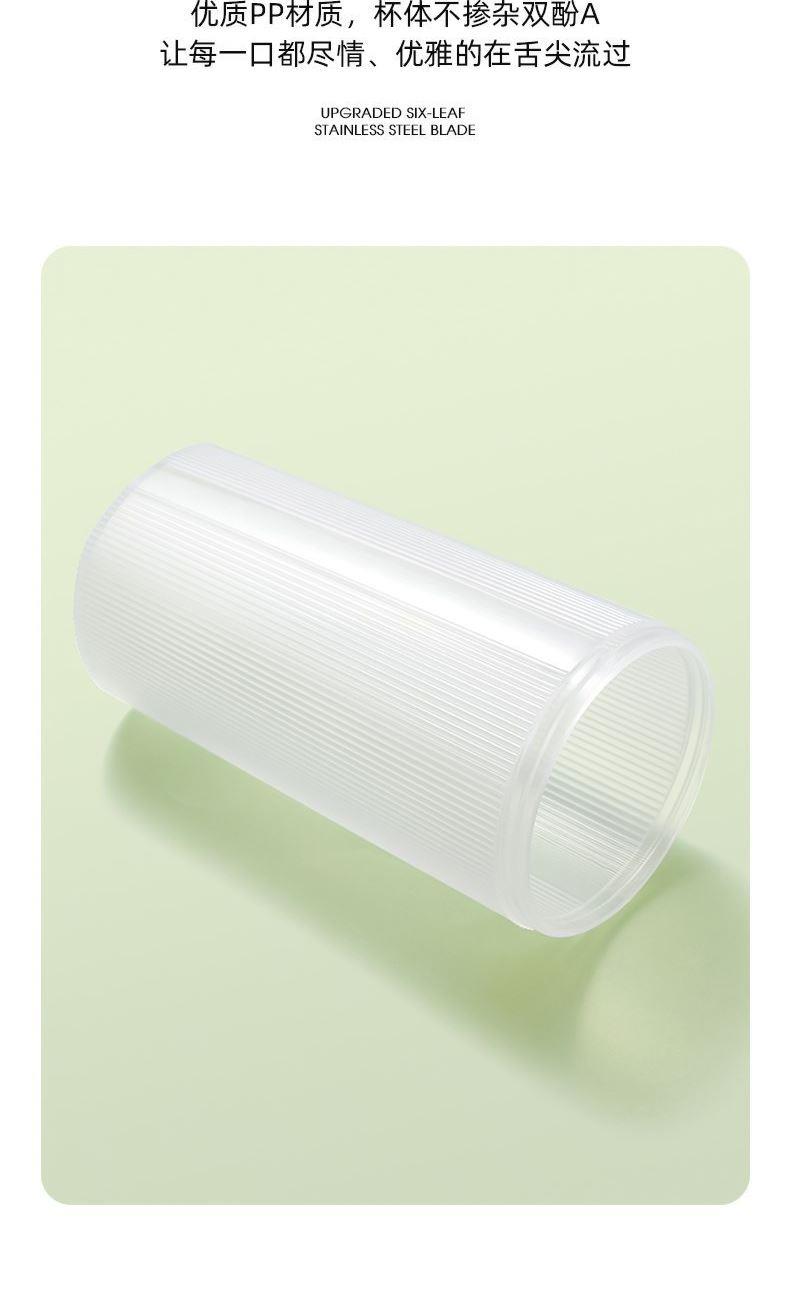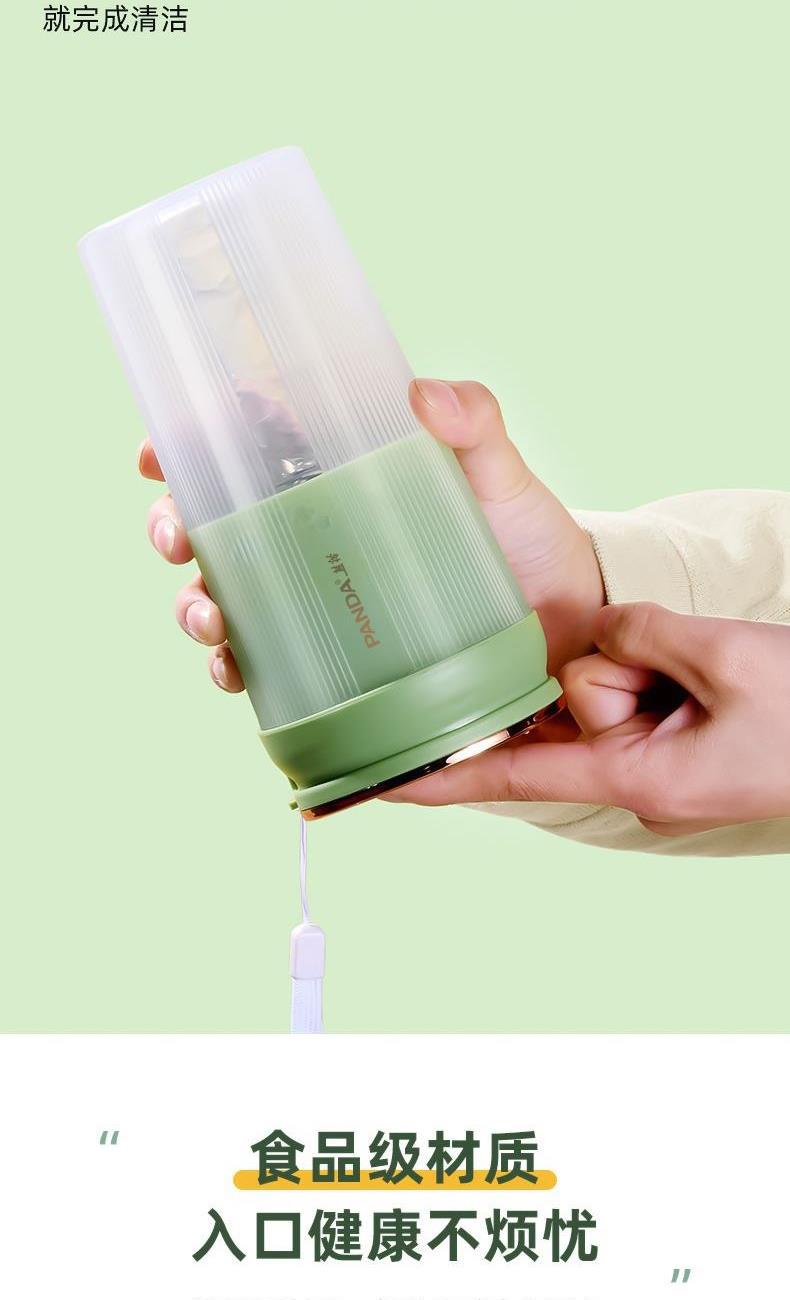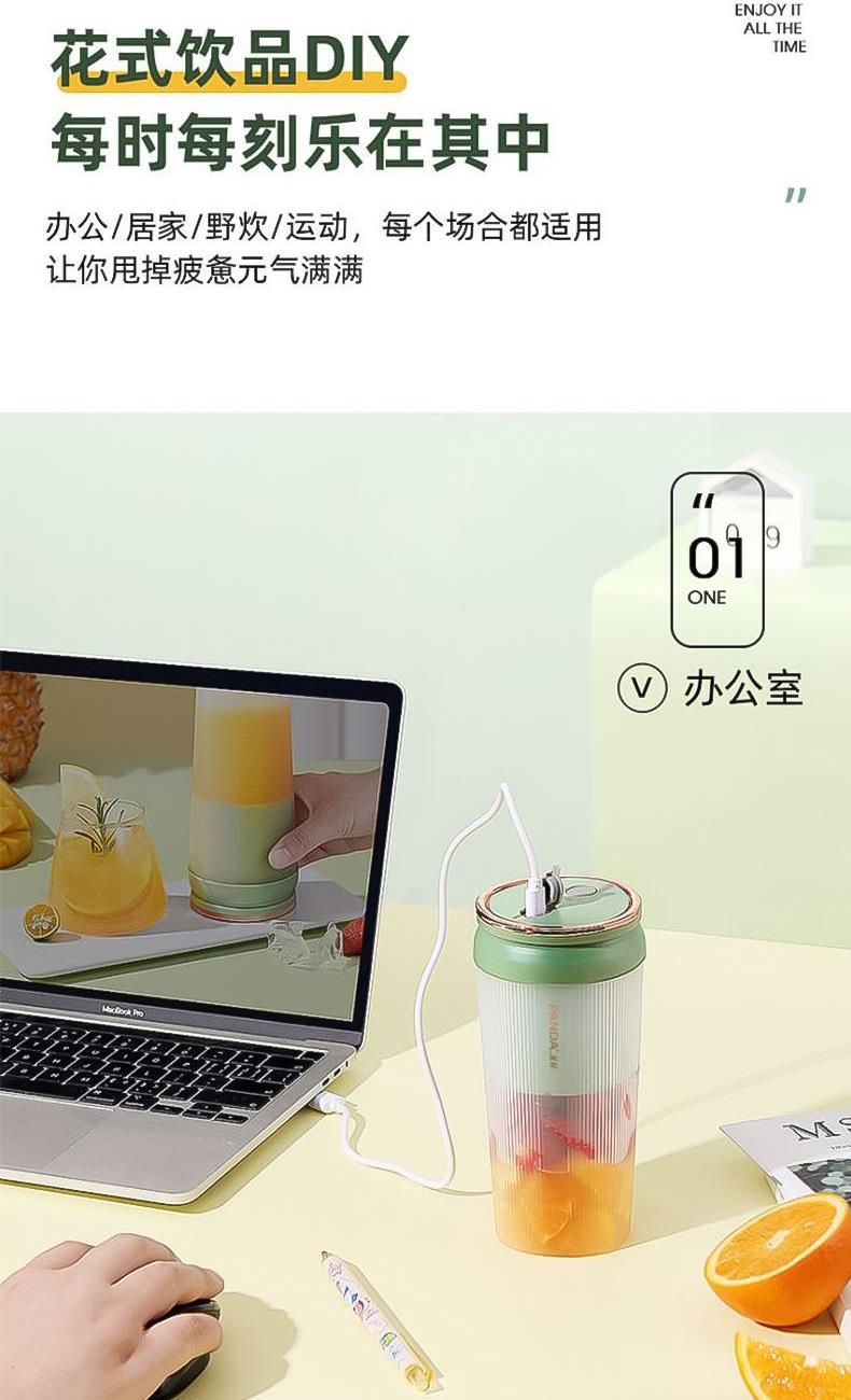 260ML便携容量,能当榨汁机也能当杯子 30W功率,USB便携式充电,充满一次电,可榨15杯左右 四叶不锈钢刀头,立体搅拌,充分旋转,口感细腻 双击启动,轻轻摇晃,马上实现果汁自由 一键清洗,机身分离不易藏垢,易清洗干净无残留 电脑、充电宝、车载可充,居家户外,不用担心没电喝不上新鲜果汁 硅胶密封圈防滴漏,USB接口硅胶防尘塞,防水又防尘
