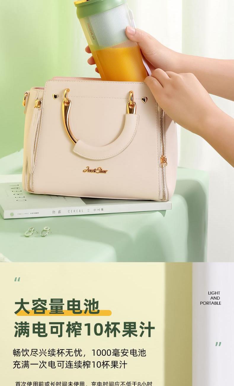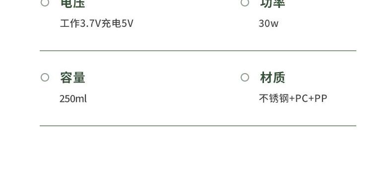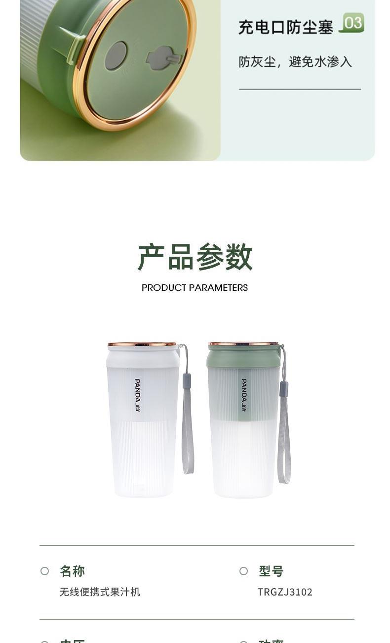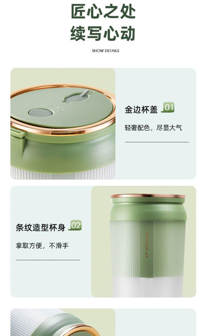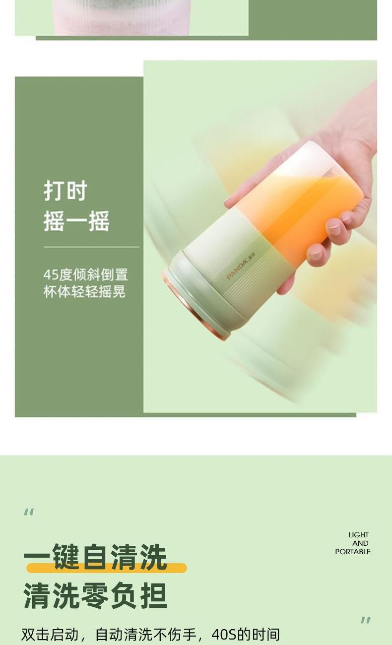 260ML便携容量,能当榨汁机也能当杯子 30W功率,USB便携式充电,充满一次电,可榨15杯左右 四叶不锈钢刀头,立体搅拌,充分旋转,口感细腻 双击启动,轻轻摇晃,马上实现果汁自由 一键清洗,机身分离不易藏垢,易清洗干净无残留 电脑、充电宝、车载可充,居家户外,不用担心没电喝不上新鲜果汁 硅胶密封圈防滴漏,USB接口硅胶防尘塞,防水又防尘