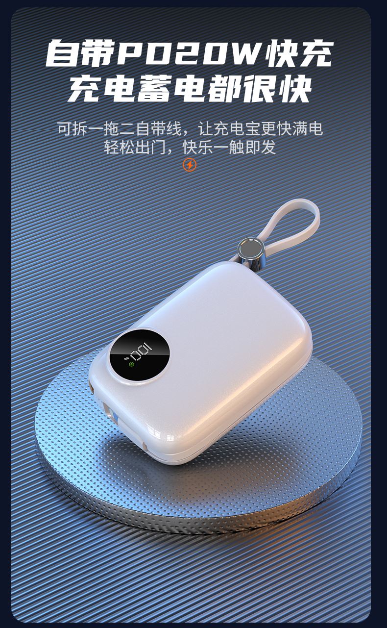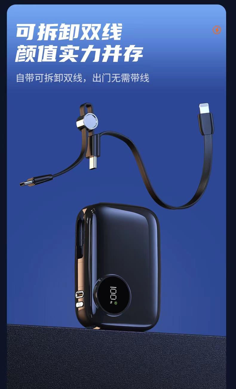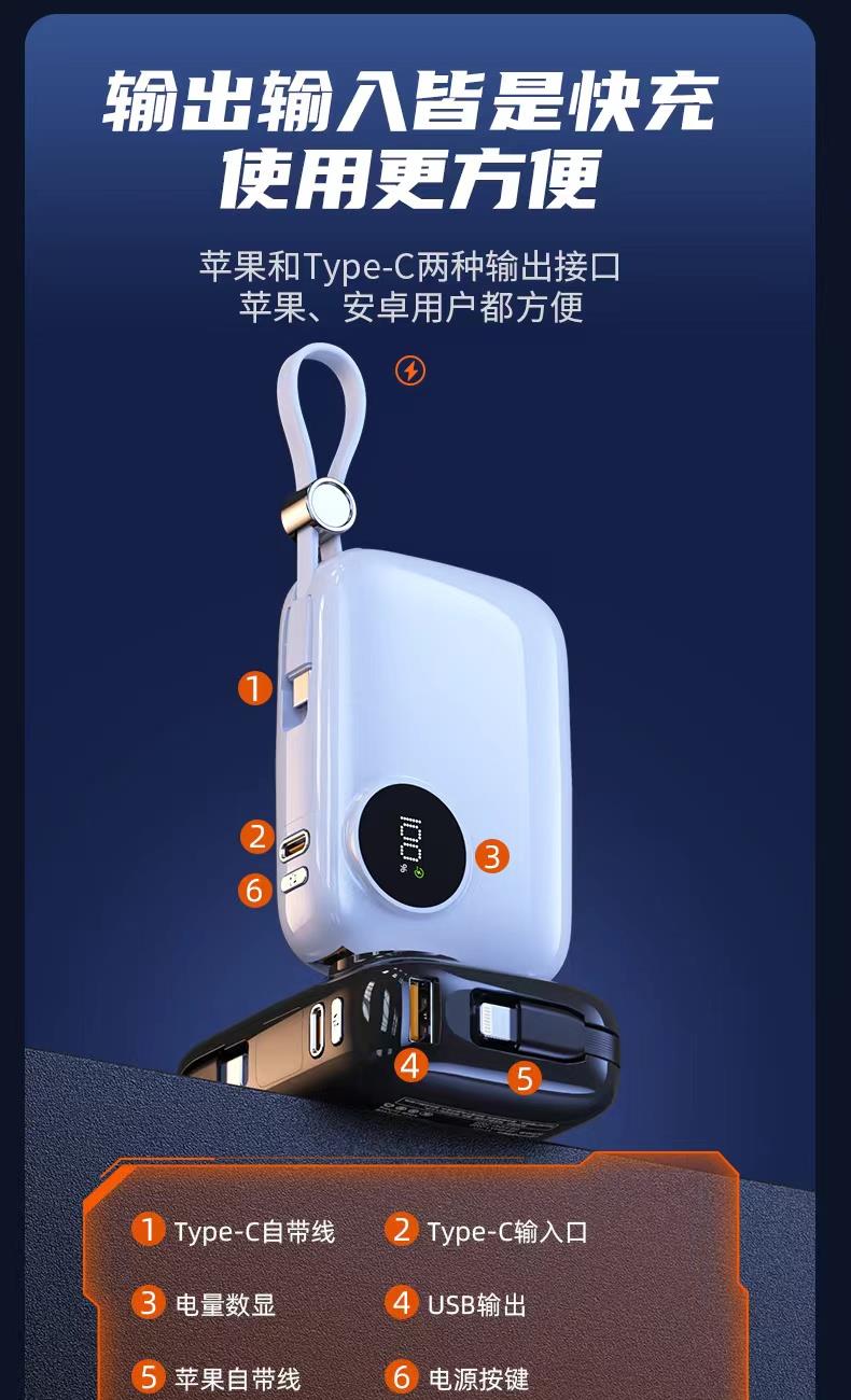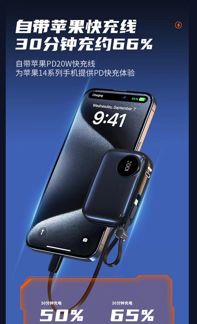 奥苏米开门红3C认证灵光超级宝快充移动电源 型 号: PD105C1 电池 :21700*2pcs 电池类型 :动力电芯 容量:10000mAh 材质 :ABS+PC 尺寸 :88*61.5*29mm 颜色 :黑色 /白色/ 蓝色/ 紫色/ 功能特点 简约设计风格,时尚大气; 22.5W超级快充,迅速充电; 10000mAh锂电池,澎湃动力; 自带苹果和Type-C充电线; 一输入三输出,支持苹果15手机 智能数显查看电量