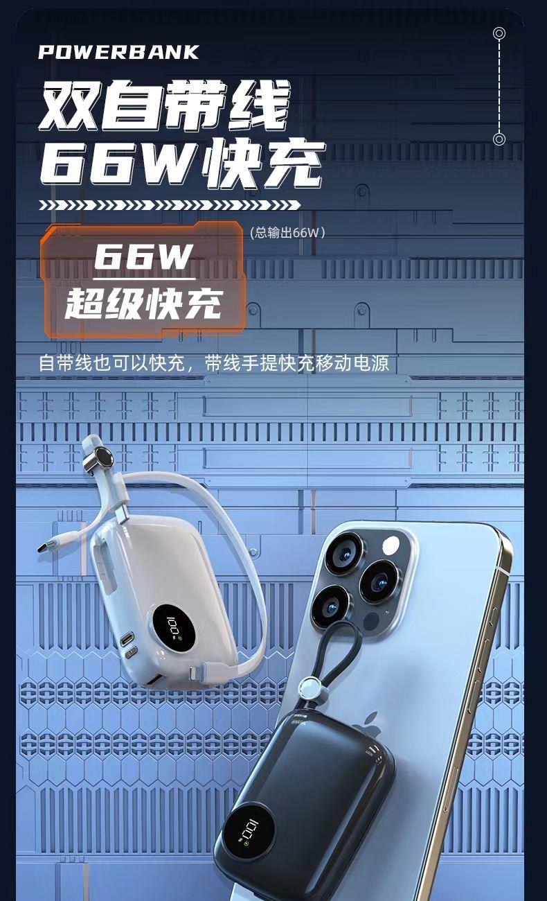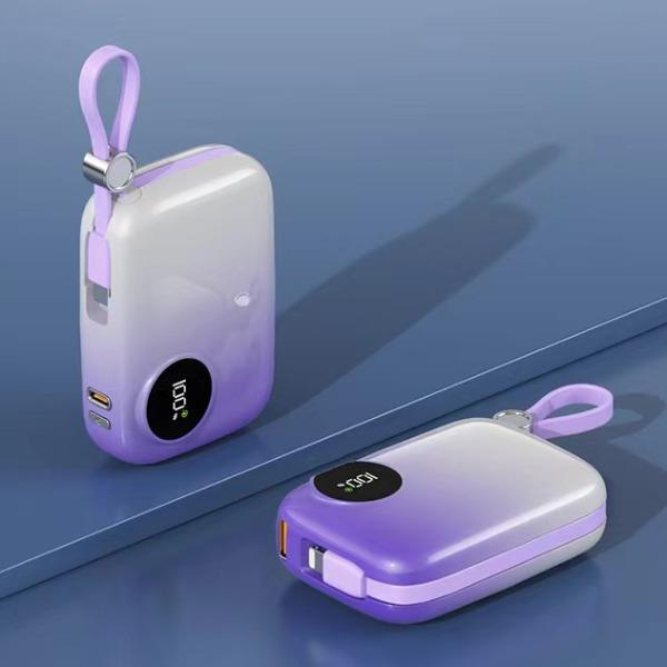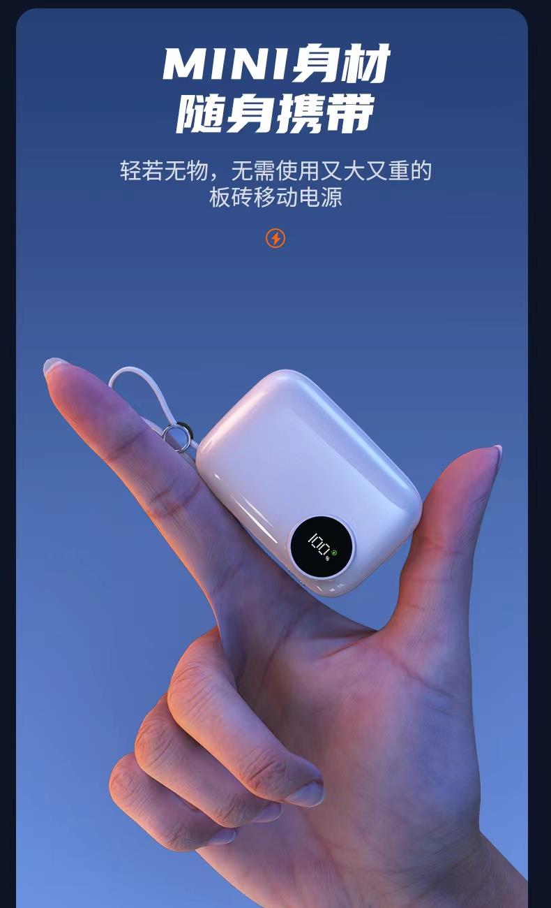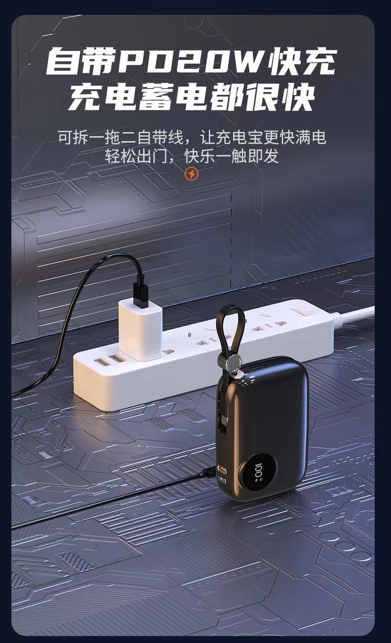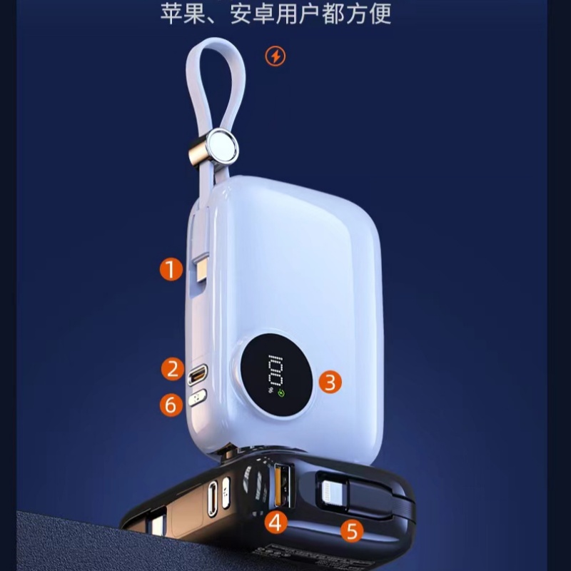 奥苏米开门红3C认证灵光超级宝快充移动电源 型 号: PD105C1 电池 :21700*2pcs 电池类型 :动力电芯 容量:10000mAh 材质 :ABS+PC 尺寸 :88*61.5*29mm 颜色 :黑色 /白色/ 蓝色/ 紫色/ 功能特点 简约设计风格,时尚大气; 22.5W超级快充,迅速充电; 10000mAh锂电池,澎湃动力; 自带苹果和Type-C充电线; 一输入三输出,支持苹果15手机 智能数显查看电量