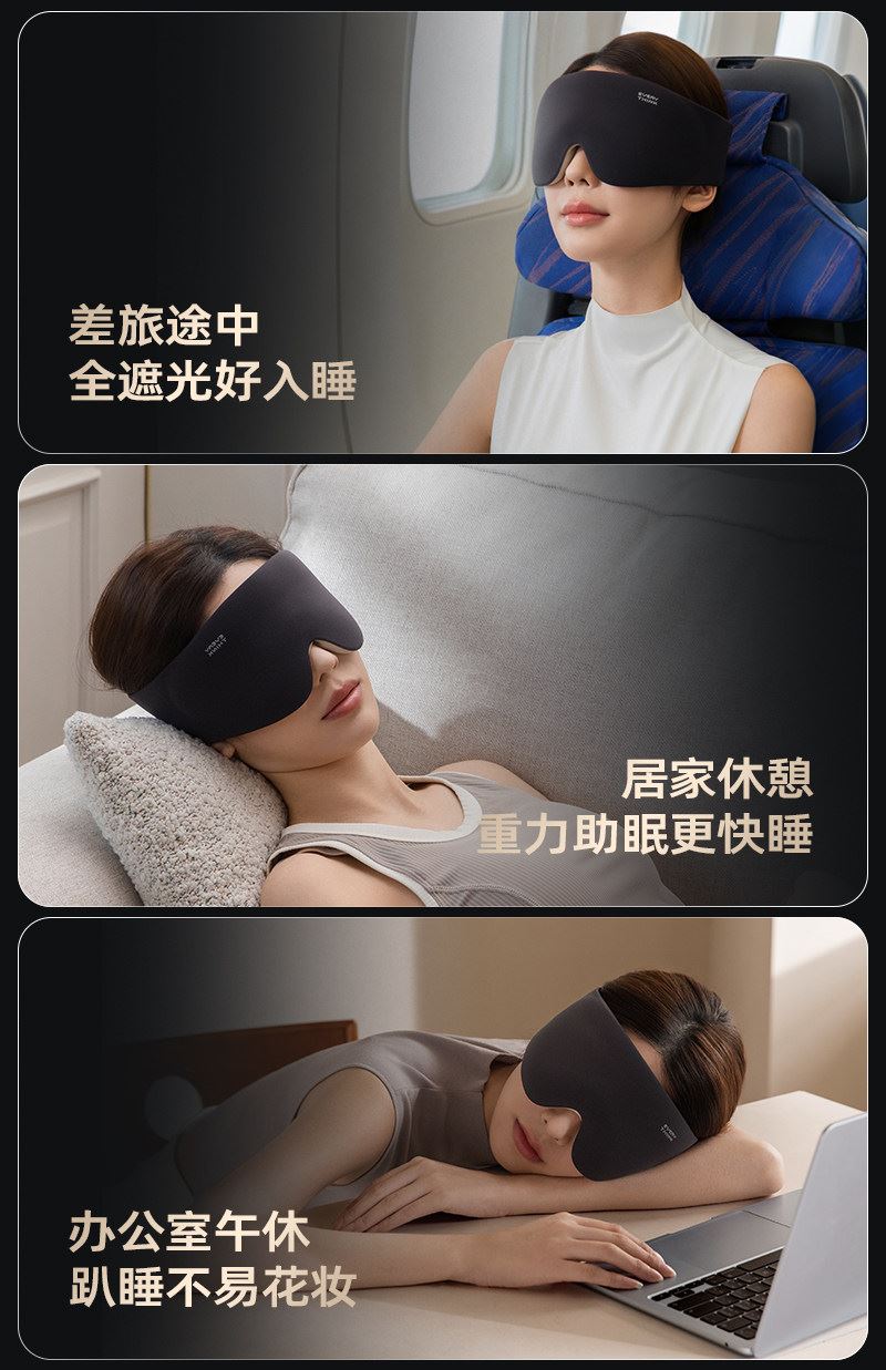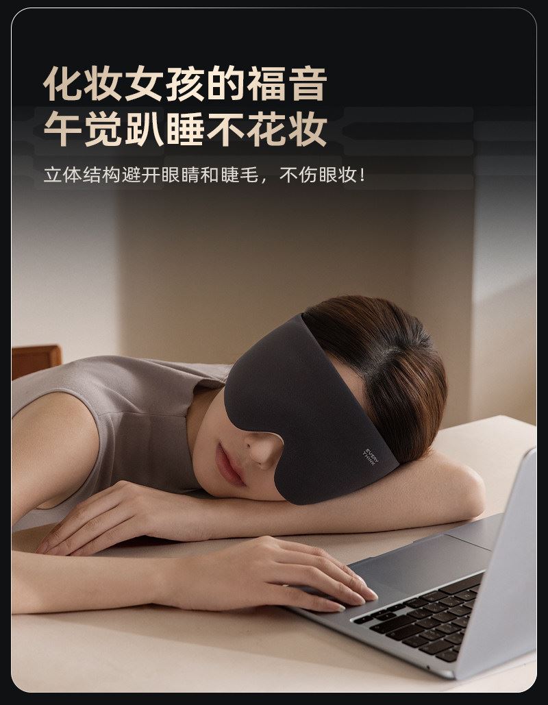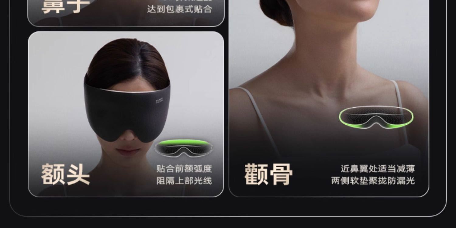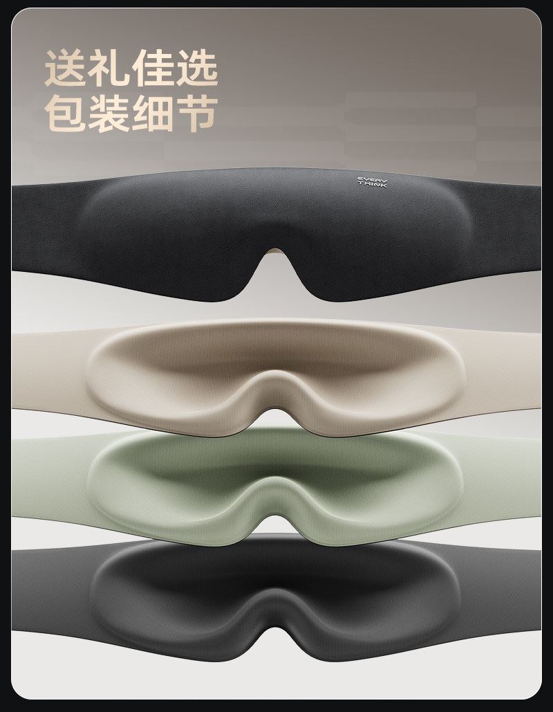 规格: 单台包装尺寸:280*120*40 单台重量:250g(含彩盒) 规格:48台 可选颜色:杏黄色、阑夜黑、豆蔻绿 功能特点: 遮光升级,首创气囊结构更贴合,鼻翼不漏光 舒适升级,3D立体设计,紧密贴合也不压眼睛 佩戴升级,魔术贴设计,一点不勒耳 一秒入夜,告别光污染 采用亲肤面料,柔软舒适佩戴无感 眼睛部位采用符合人体工学的微弧立体结构,做到贴合脸部的同时不压眼球;立体结构避开眼睛和睫毛,不伤眼妆 可收纳成巴掌大小,不占空间,出行便携