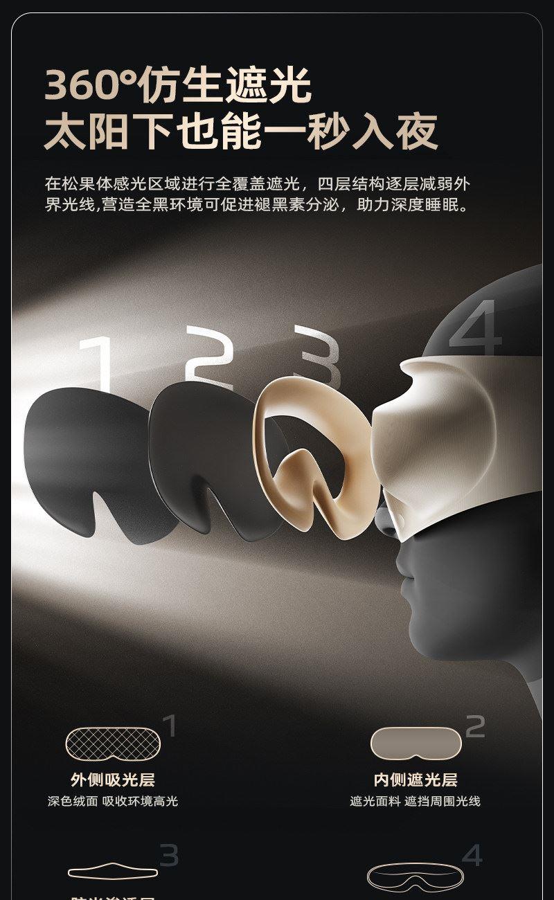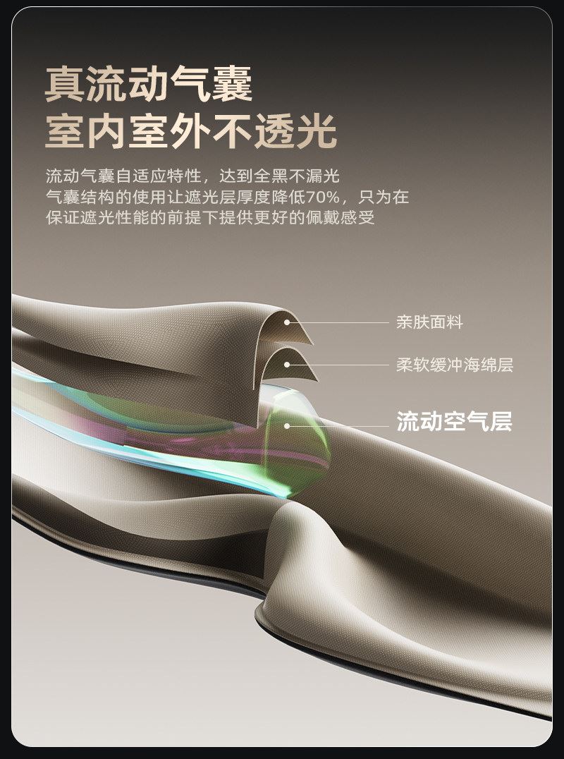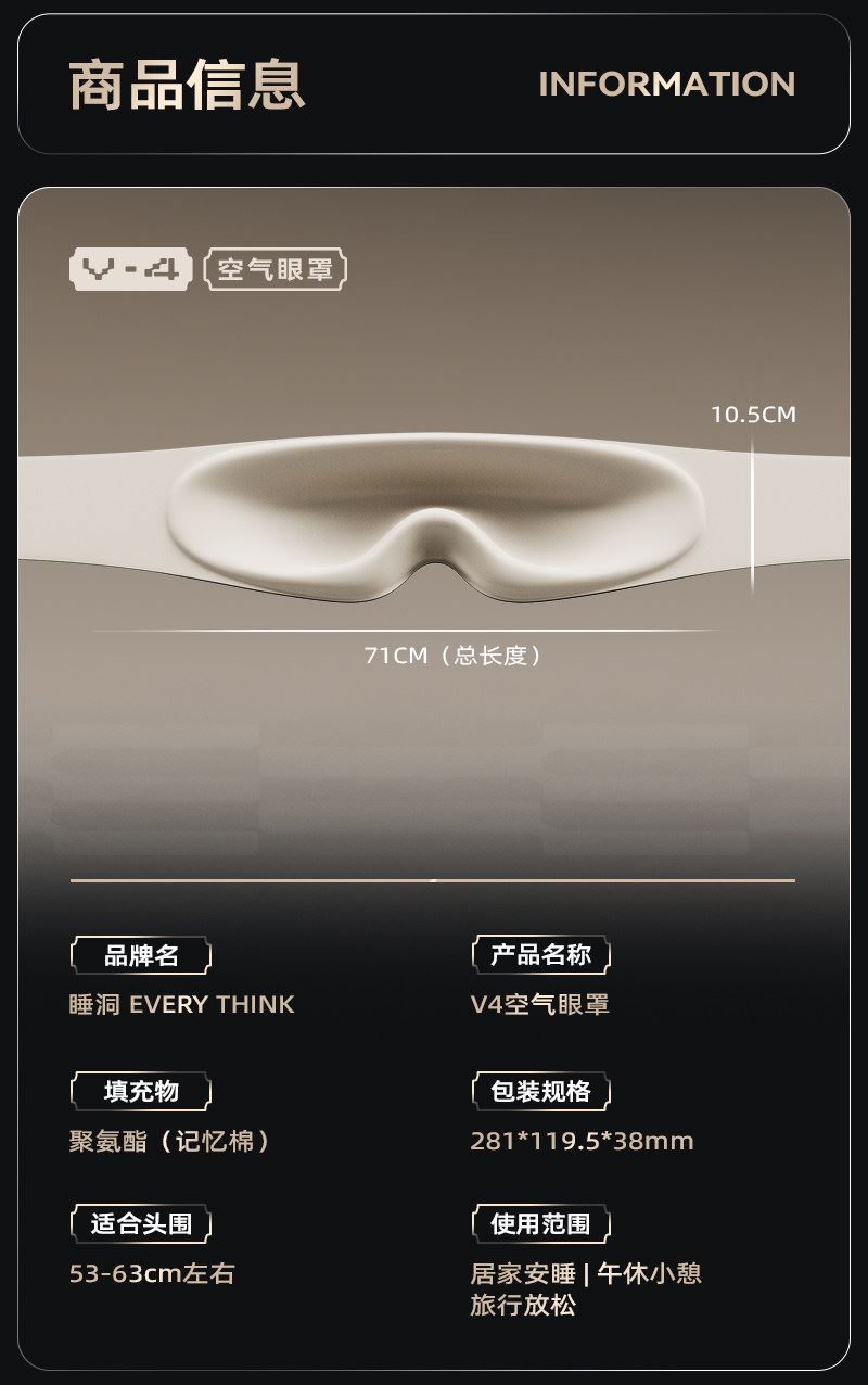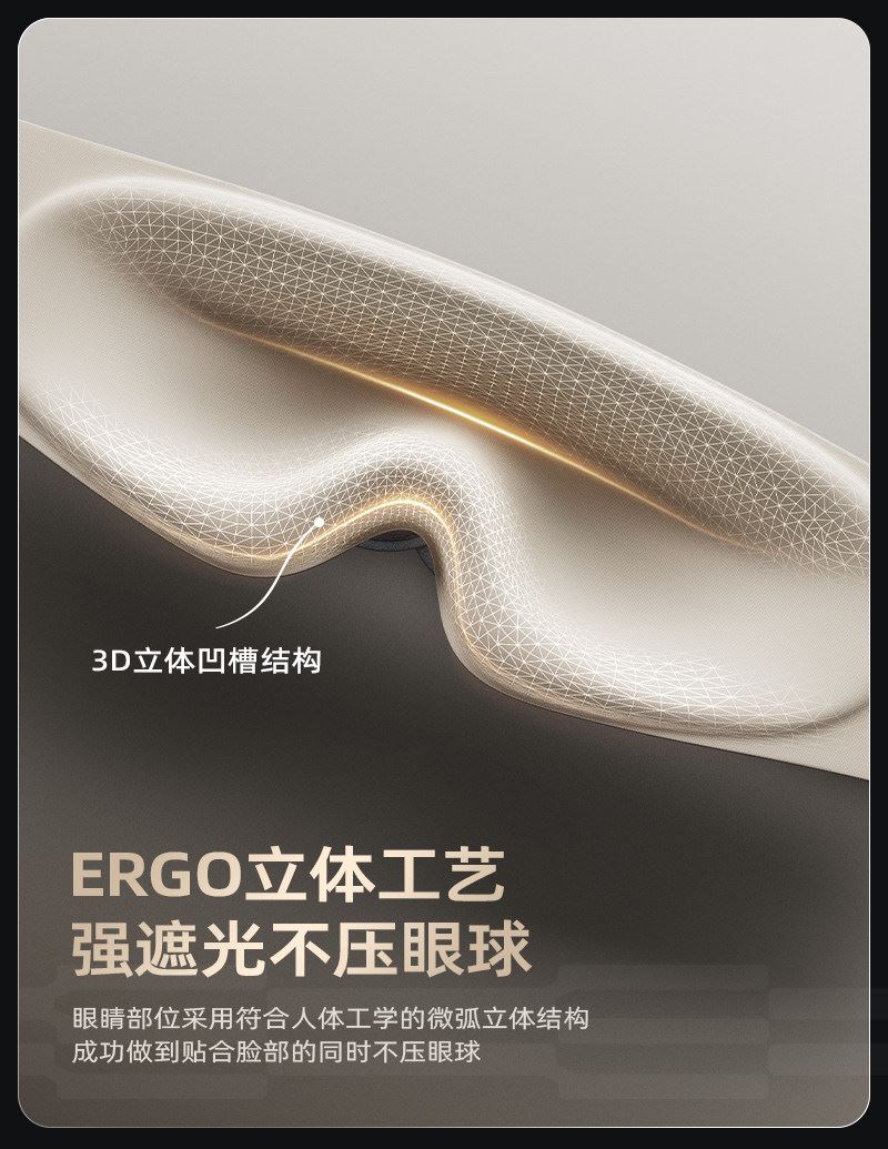 规格: 单台包装尺寸:280*120*40 单台重量:250g(含彩盒) 规格:48台 可选颜色:杏黄色、阑夜黑、豆蔻绿 功能特点: 遮光升级,首创气囊结构更贴合,鼻翼不漏光 舒适升级,3D立体设计,紧密贴合也不压眼睛 佩戴升级,魔术贴设计,一点不勒耳 一秒入夜,告别光污染 采用亲肤面料,柔软舒适佩戴无感 眼睛部位采用符合人体工学的微弧立体结构,做到贴合脸部的同时不压眼球;立体结构避开眼睛和睫毛,不伤眼妆 可收纳成巴掌大小,不占空间,出行便携