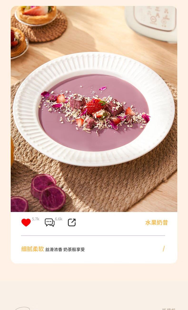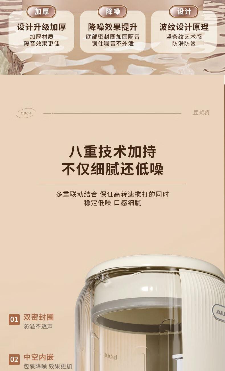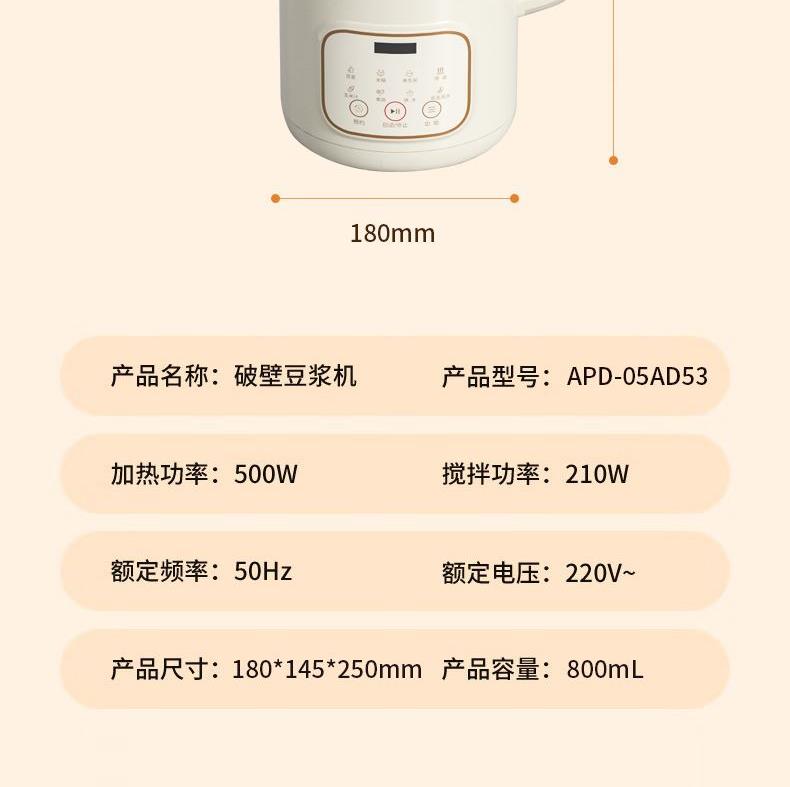 额定电压:220V~ 加热功率:500W 搅拌功率:210W 额定频率:50Hz 材质:内胆材质:304不锈钢,杯盖:PP,密封圈:硅橡胶,刀片、螺丝:304不锈钢 10叶钢刀破壁,干豆免泡直打 食品级304不锈钢杯,入口安心 低分贝降噪,不降口感 触选大屏,花式菜单一目了然 智能预约保温,起床即享