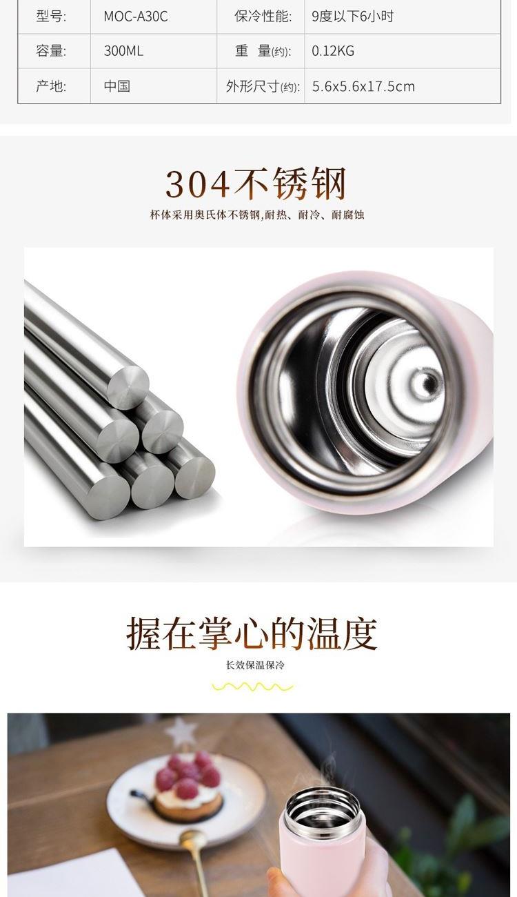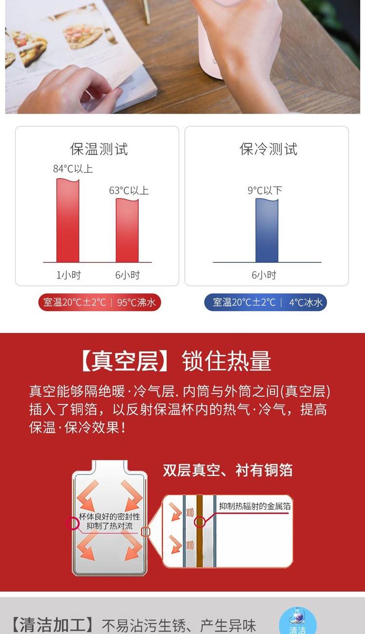 容量:300ml 颜色:白色、粉色 产品尺寸:5.6*5.6*17.5cm 口径:3.8cm 重量:0.12kg 保温效果:1小时84℃以上,6小时63℃以上 保冷效果:6小时9℃以下 产地:中国 产品特点: 优质304不锈钢材质 梦重力轻量设计 上盖可拆卸清洗 镭射焊接保温效果更好