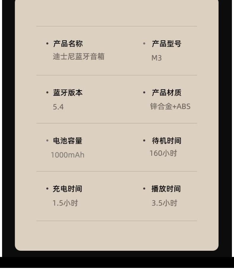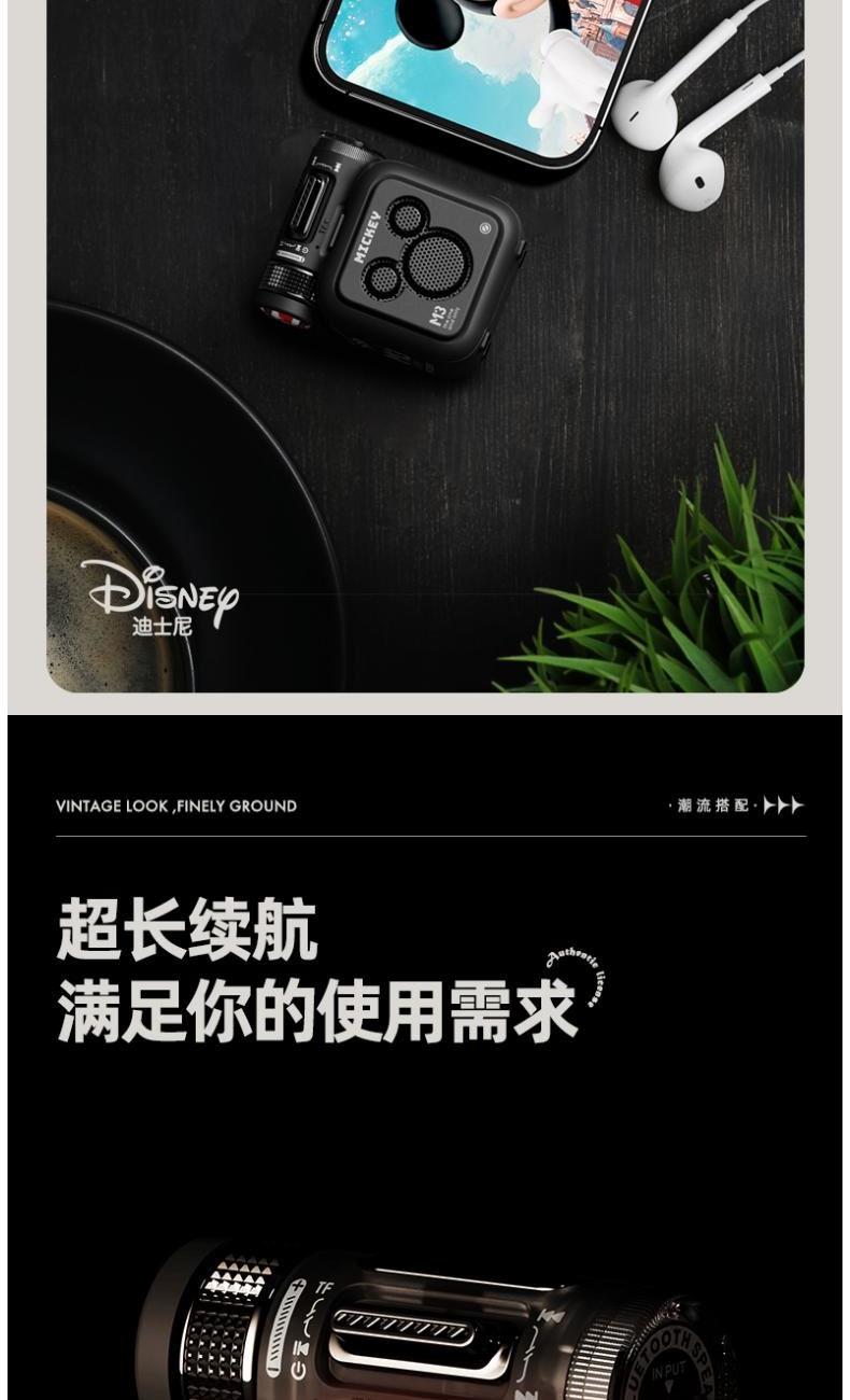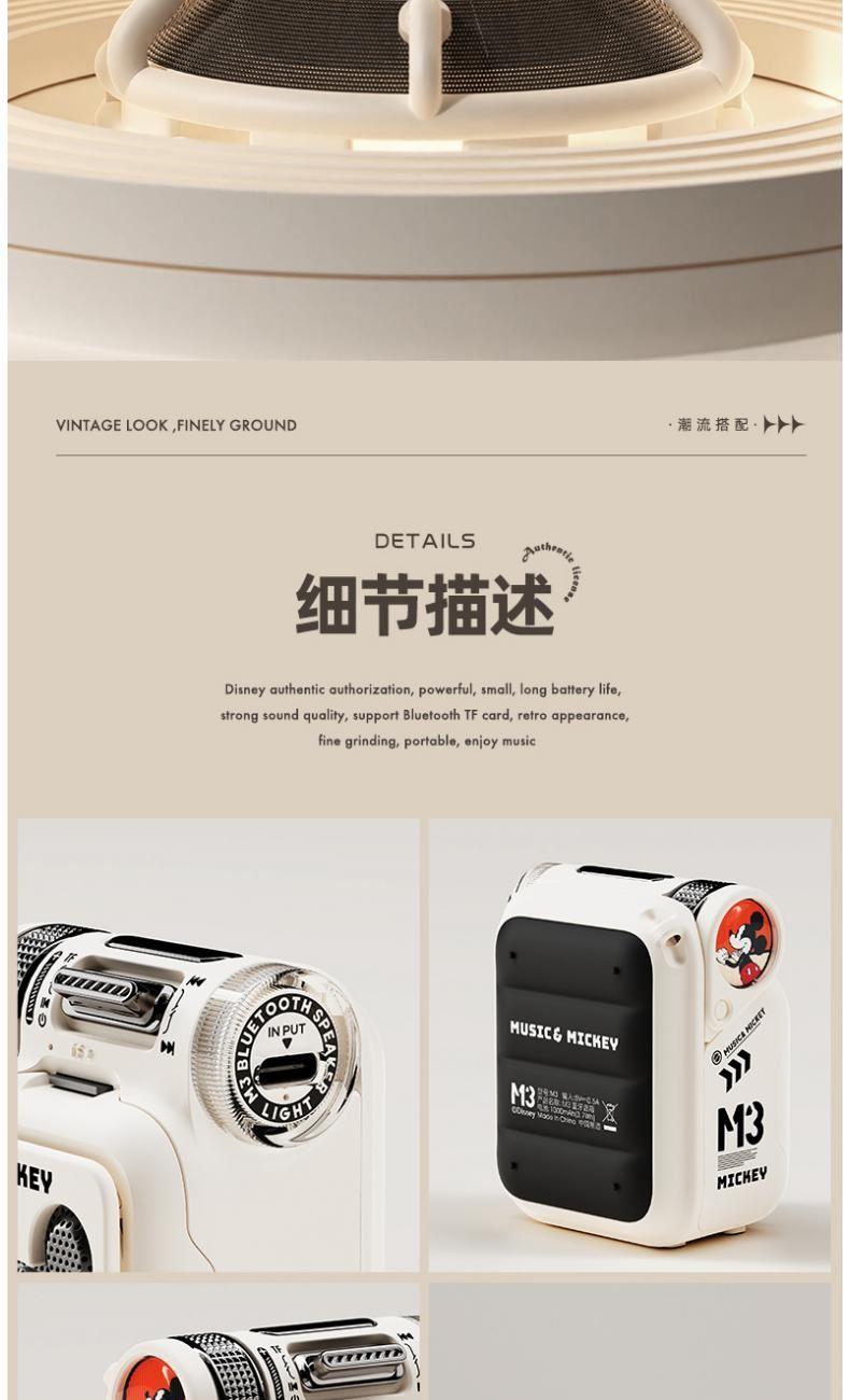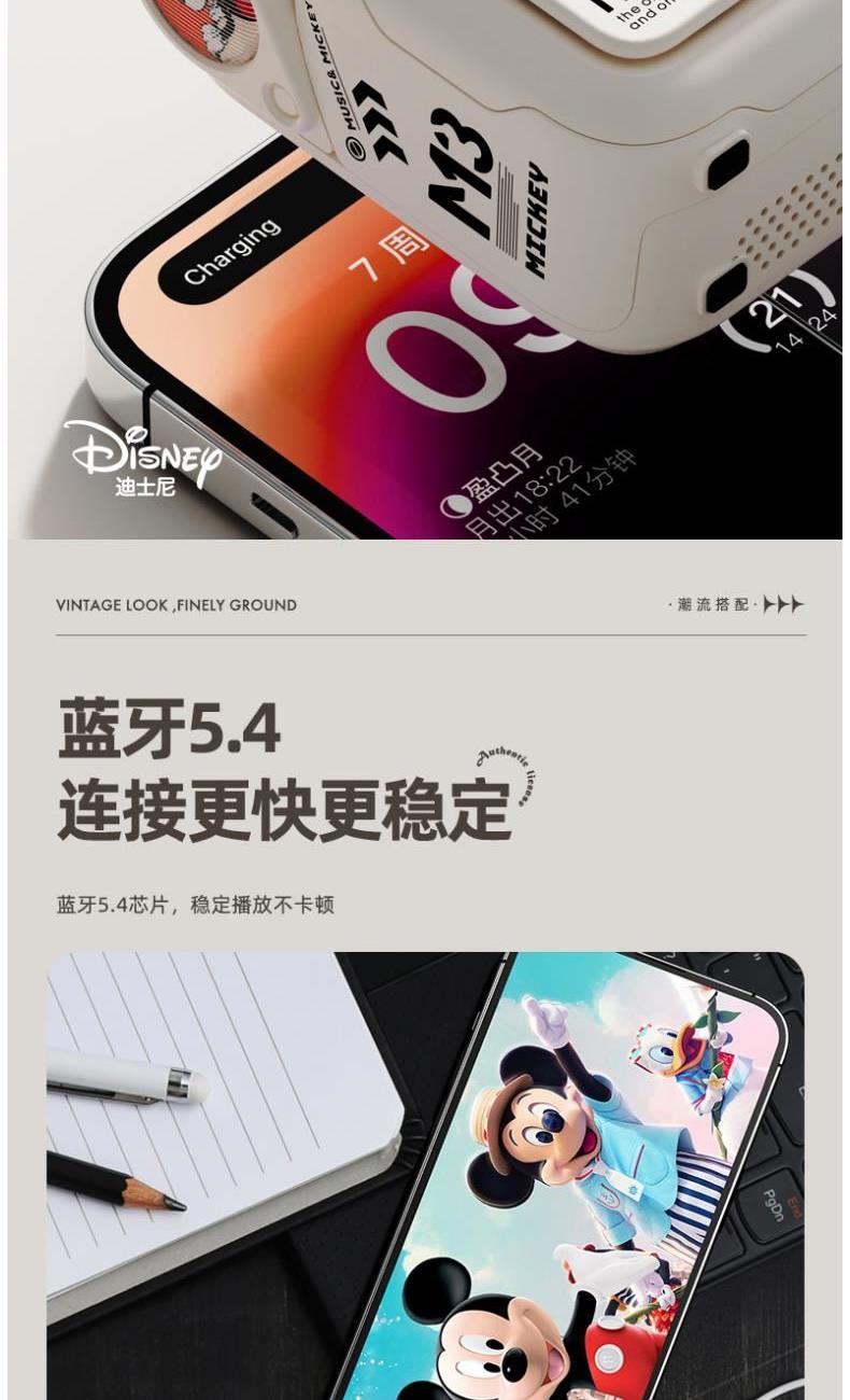 蓝牙版本:V5.4 蓝牙距离:10m(无障碍) 充电接口:Type-C; 电池容量:1500mAh 充电时间:~1.8h, 使用时间:3-5h 充电功能:支持USB充电/DC5V适配器 驱动单元:45mm 额定功率:3W 输入:5V-1A 频率响应:20hz-20khz 阻抗:DCR 3.3ohm±15% 1、迪士尼正版授权,复古朋克蓝牙音箱。 2、精美潮酷复古外观; 3、蓝牙5.4,稳定播放不卡顿、不断连; 4、硅胶脚垫+背垫, 不仅防滑还能防止共振; 5、3W内磁喇叭,峰值可达5w,hifi音质; 6、支持TF卡,蓝牙多种模式连接使用; 7、超大电池容量,超长续航,满足日常畅听需求; 8、支持tws对联,秒变双单元低音炮