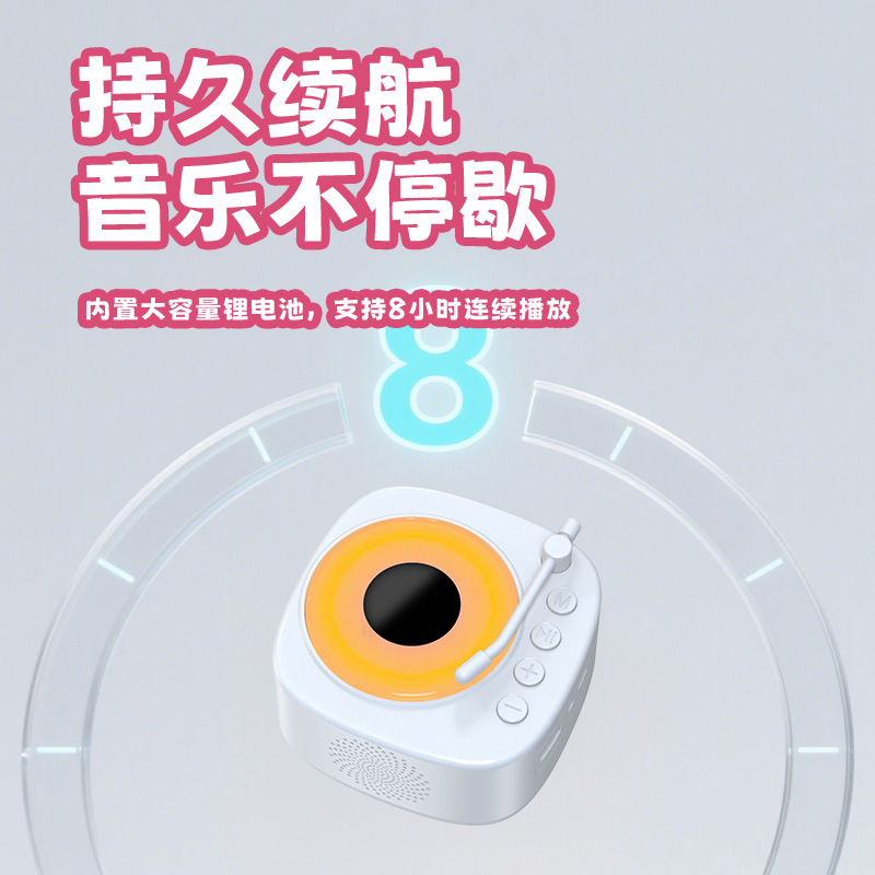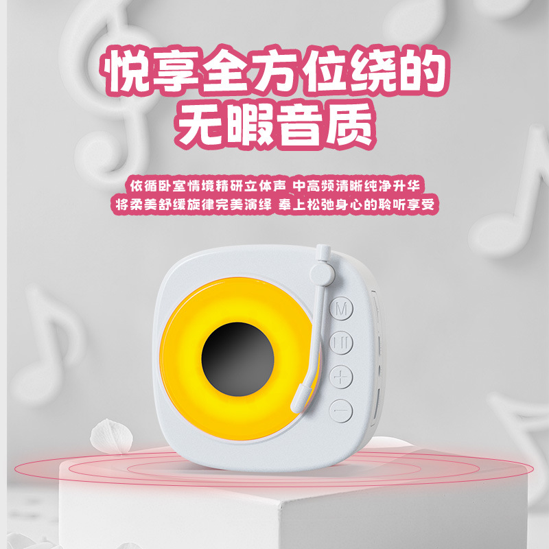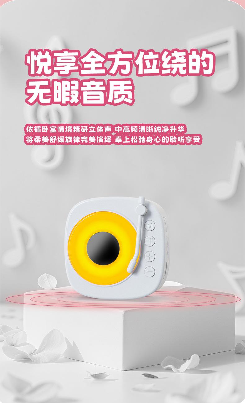 【颜色】白色、粉色 【扬声器功率】5W 【蓝牙版本】5.3 【材质】ABS 【播放模式】蓝牙、TF卡、U盘、AUX 【电池容量】1200mAh 【产品尺寸】115*115*62mm 唱片造型,炫彩氛围灯,多种灯光模式 智能语音AI,你好小云唤醒 采用大口径音圈保障足够的驱动力,让声音更通透 一键收音,内置FM天线,自动开启搜台模式