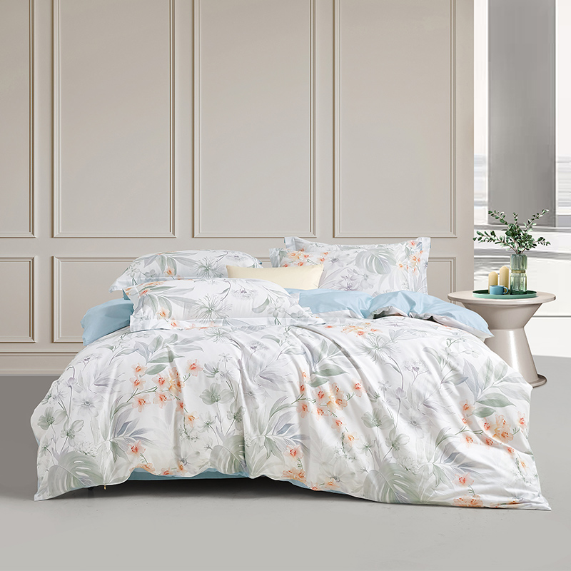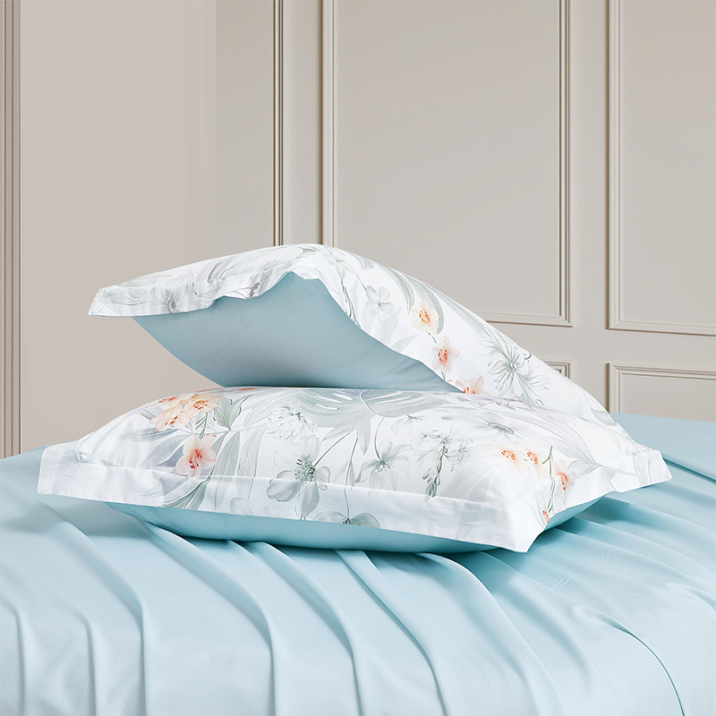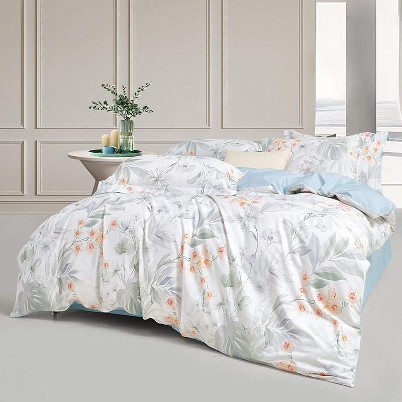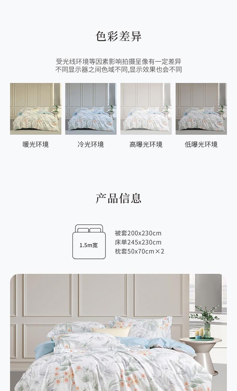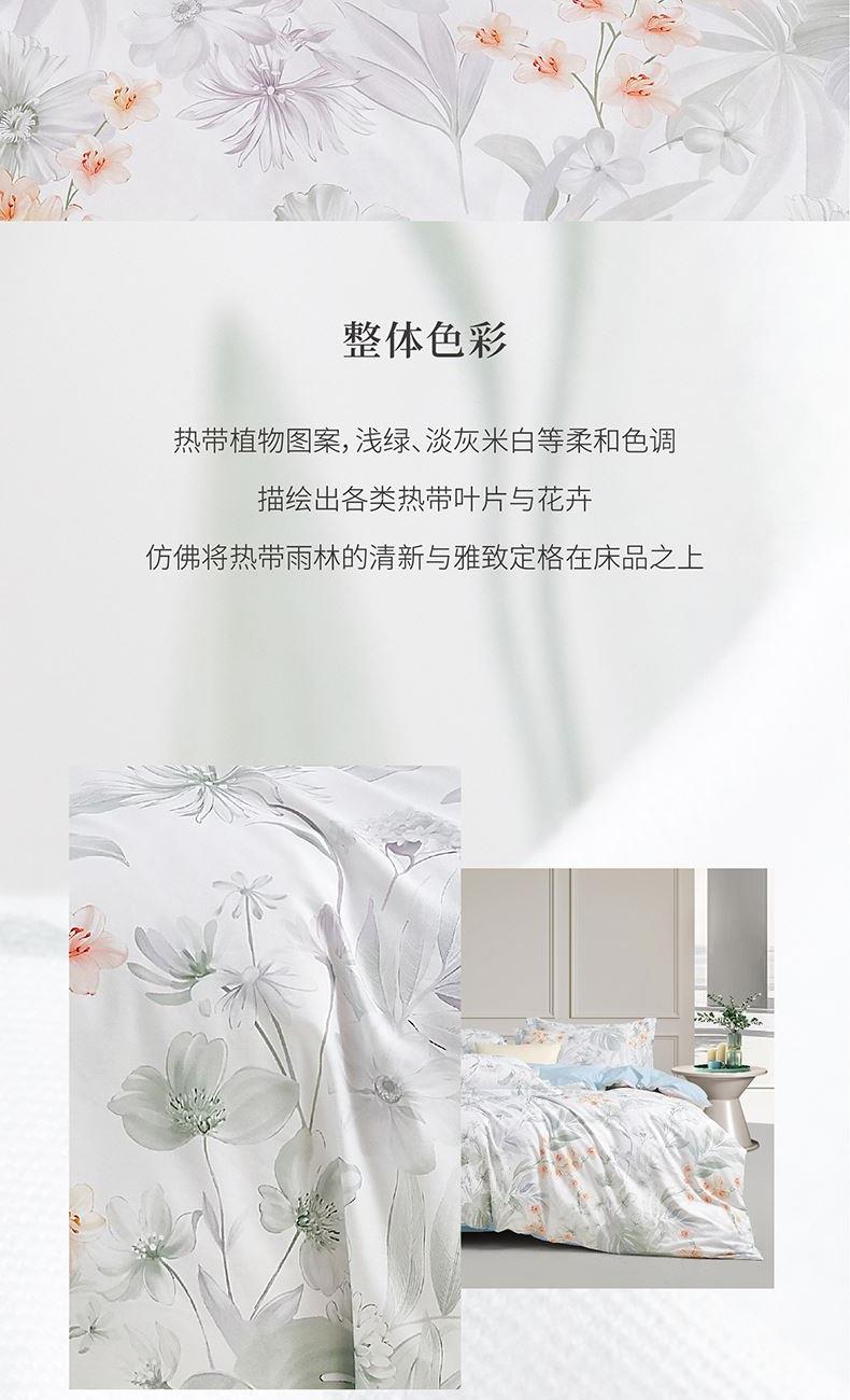 面 料:棉 尺 寸:被套:200×230cm 床单:245×230cm 短枕:50×70cm×2 整体色彩:热带植物图案,浅绿、淡灰、米白等柔和色调,描绘出各类热带叶片与花卉,仿佛将热带雨林的清新与雅致定格在床品之上。 面料:选用优质棉花,经严格工序,梳去较短纤维,去除杂质,使棉花更有韧性,更不易起球。面料柔软平整,亲肤细腻,透气性佳。 工艺:精简的四件套组合,短枕大气。