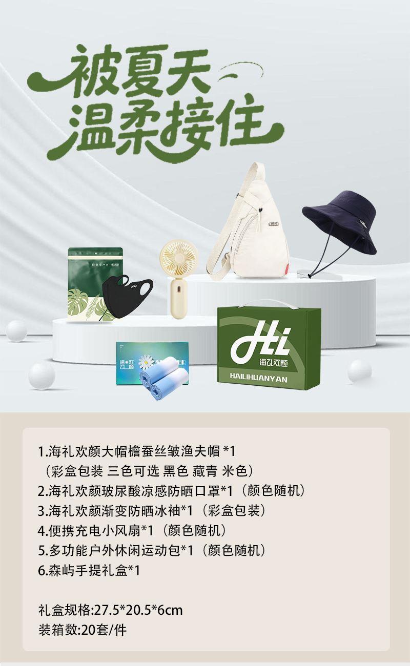 海礼欢颜大帽檐蚕丝皱渔夫帽 可折叠携带更方便轻量化携带 (彩盒包装 发货三色随机 黑色 藏青 米色) 海礼欢颜玻尿酸凉感防晒口罩*1(颜色随机)清凉透气舒适 海礼欢颜渐变防晒冰袖*1(彩盒包装)清凉透气防晒 便携充电小风扇*1(颜色随机)方便携带 多功能户外休闲运动包*1(颜色随机)一包装所有 轻装出行