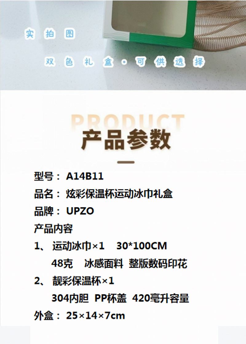 型号: A14B11 产品内容 1、 运动冰巾×1 48克 冰感面料 整版数码印花 2、 靓彩保温杯×1 304内胆 PP杯盖 420毫升容量 外盒: 25×14×7cm 靓彩保温杯融入祝福元素和时尚设计理念,给与保温杯常规功能外更多的靓丽色彩 内胆采用304材质 杯盖优质PP 冰巾采用冰感面料 整版激光印 外观靓丽 运动好搭配