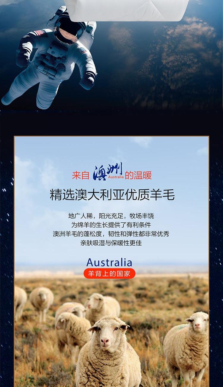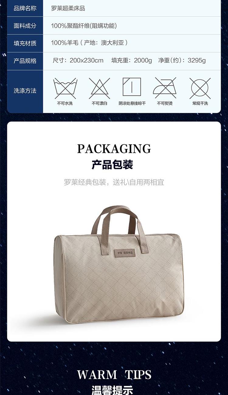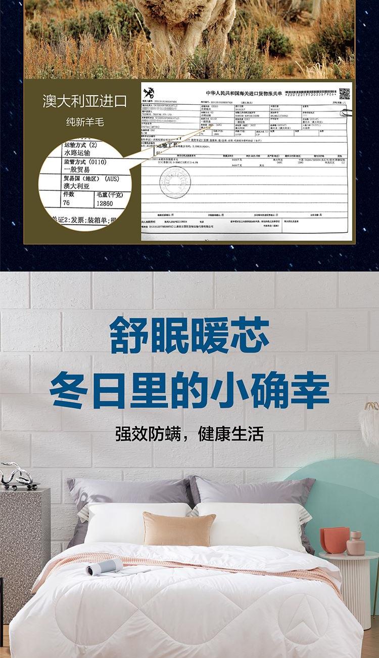面料:聚酯纤维(防螨) 规格:200cm*230cm 填充材质:羊毛(产地澳大利亚) 填充重量:2000g