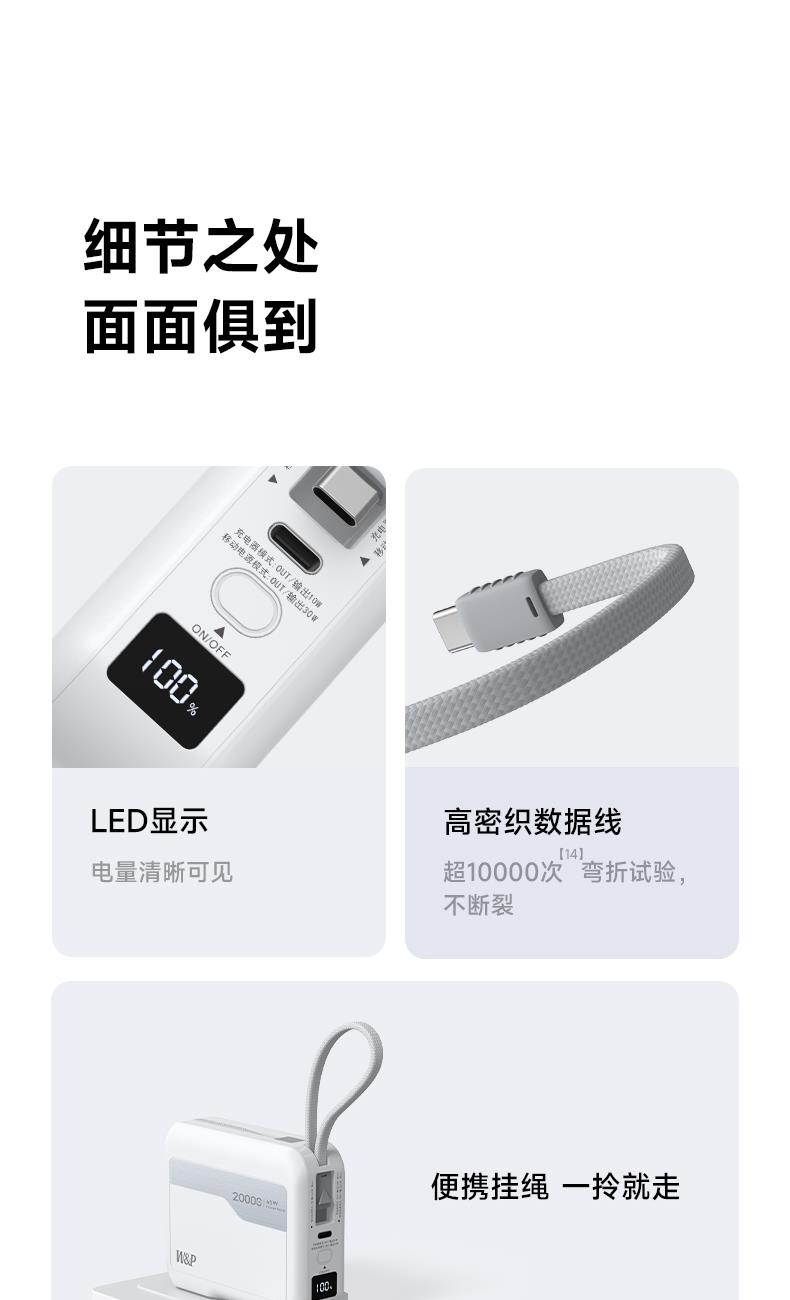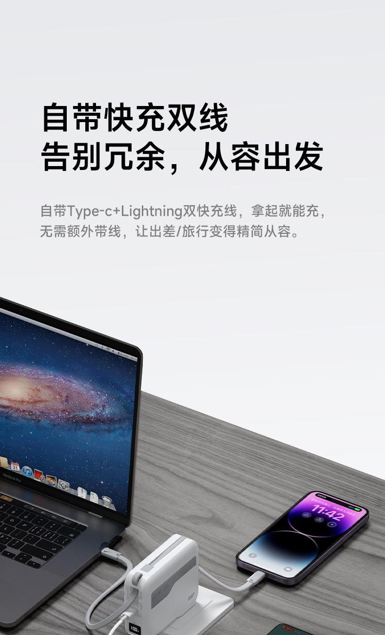 1、 20000毫安大容量,可上飞机 2、自带AC墙插,可为电源进行20W快速充电,对外10W供电 3 、可充平板电脑、笔记本电脑 4、带双线 lightning+type-c双线快充,简单利落 5 、影像数显屏 ,可跟踪实时电量