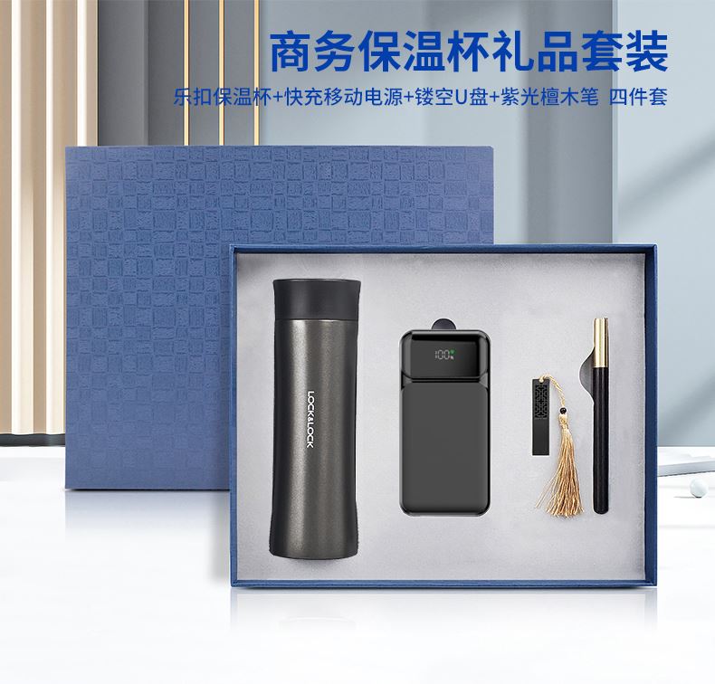 礼盒配置 : 1、型号:LHC4028 400ML LOCK&LOCK 保温杯 2、22.5W超级快充10000mAh自带线移动电源 3、金属镂空16GU盘 4、黄铜紫光檀签字笔 5、包装盒尺寸:328x263x75mm 6、手提袋尺寸:335x293x85mm 7、重量:26kg/箱