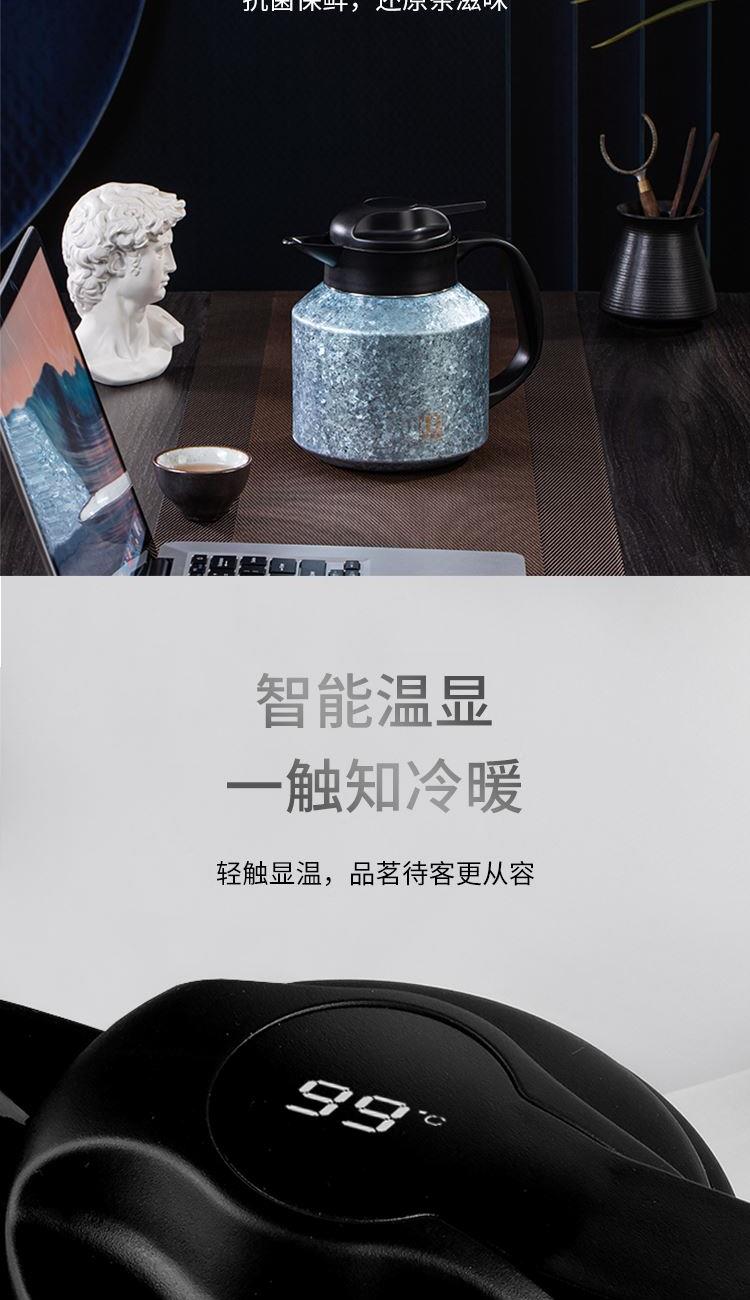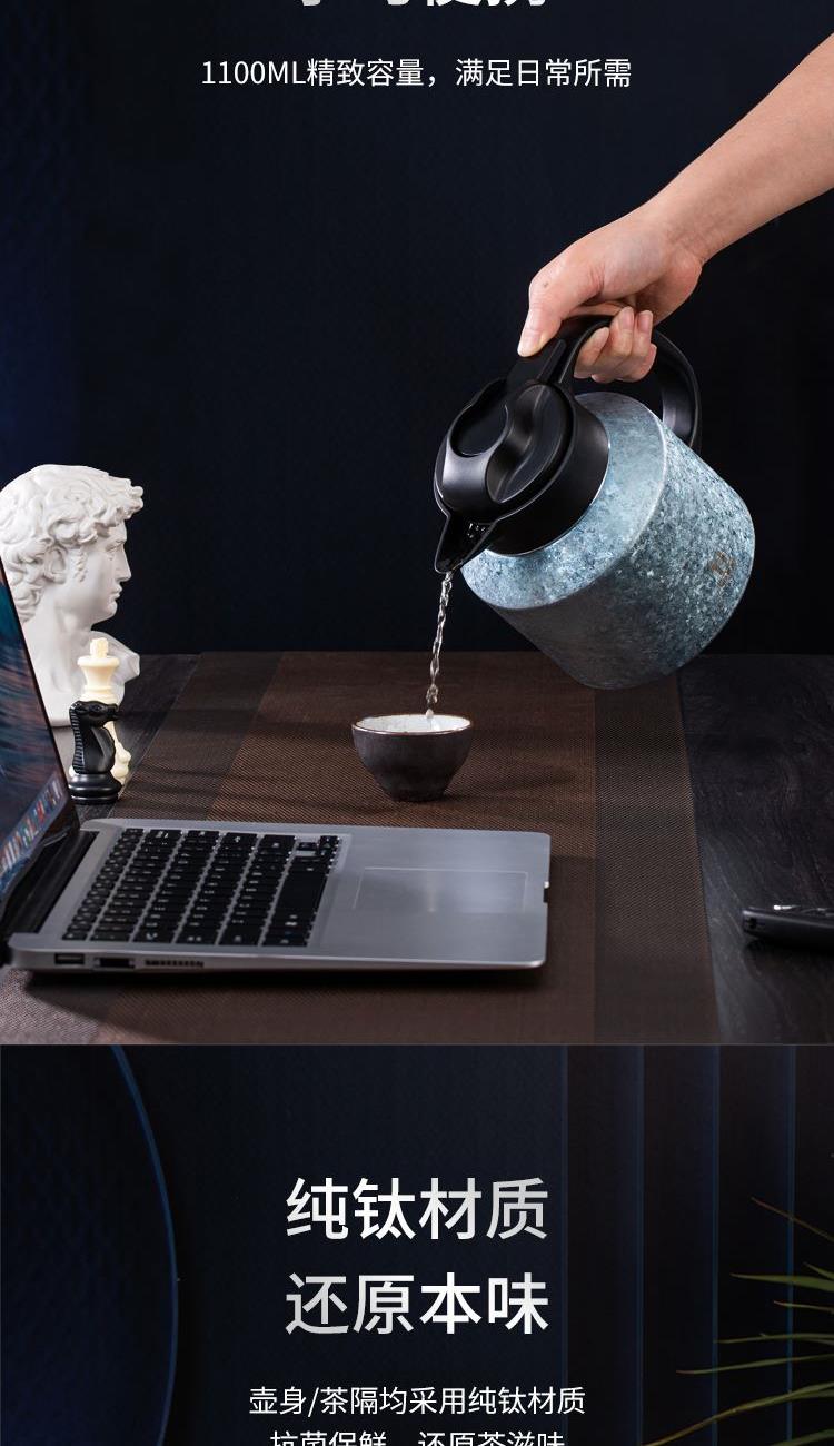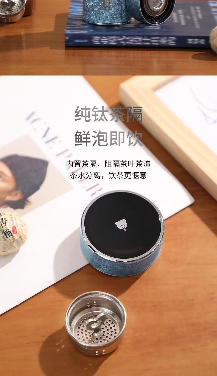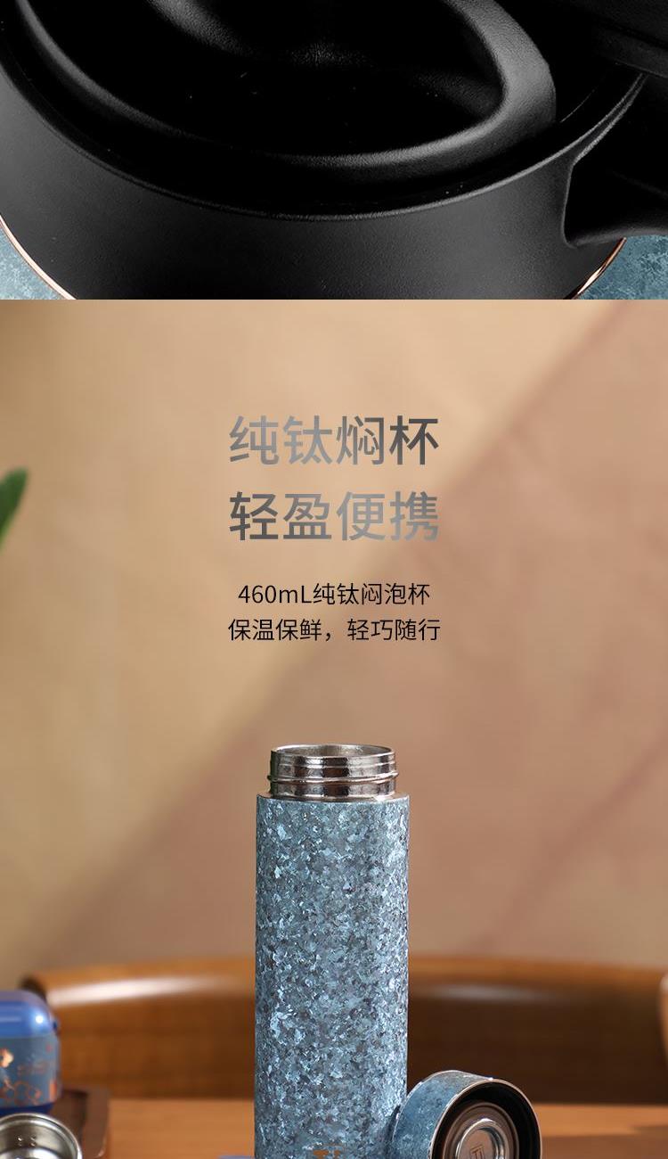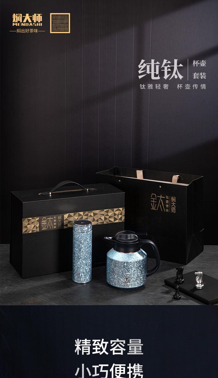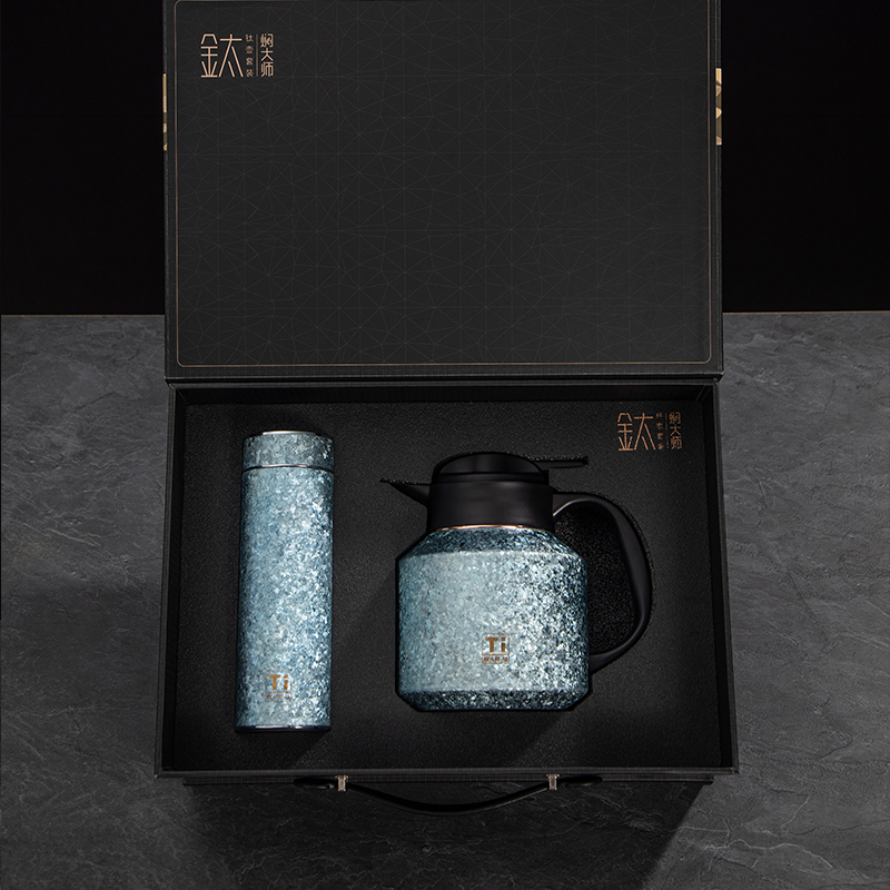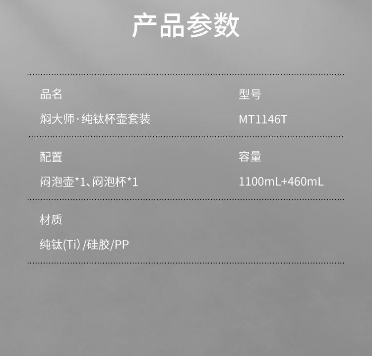 轻触式智能温度提示 宝石肌理,手工打磨 内外纯钛,表里如一 茶水分离,精细过滤 持久保鲜,健康随行 商务、办公、居家、聚会均可适用 外壳材质:纯钛(Titanium) 内胆材质:纯钛(Titanium) 茶隔材质:纯钛(Titanium) 塑 件:聚丙烯PP(食品接触用) 密 封 圈:食品接触用硅胶 保温效力:室温25℃条件下95℃满水容量测试12h≥50℃ 配 置:内外纯钛闷泡壶+纯钛闷泡杯 包装尺寸:390*165*270mm