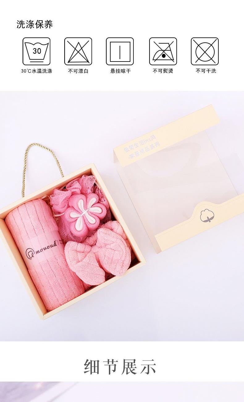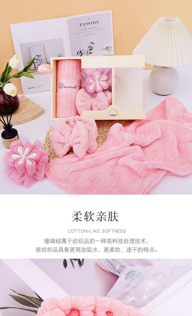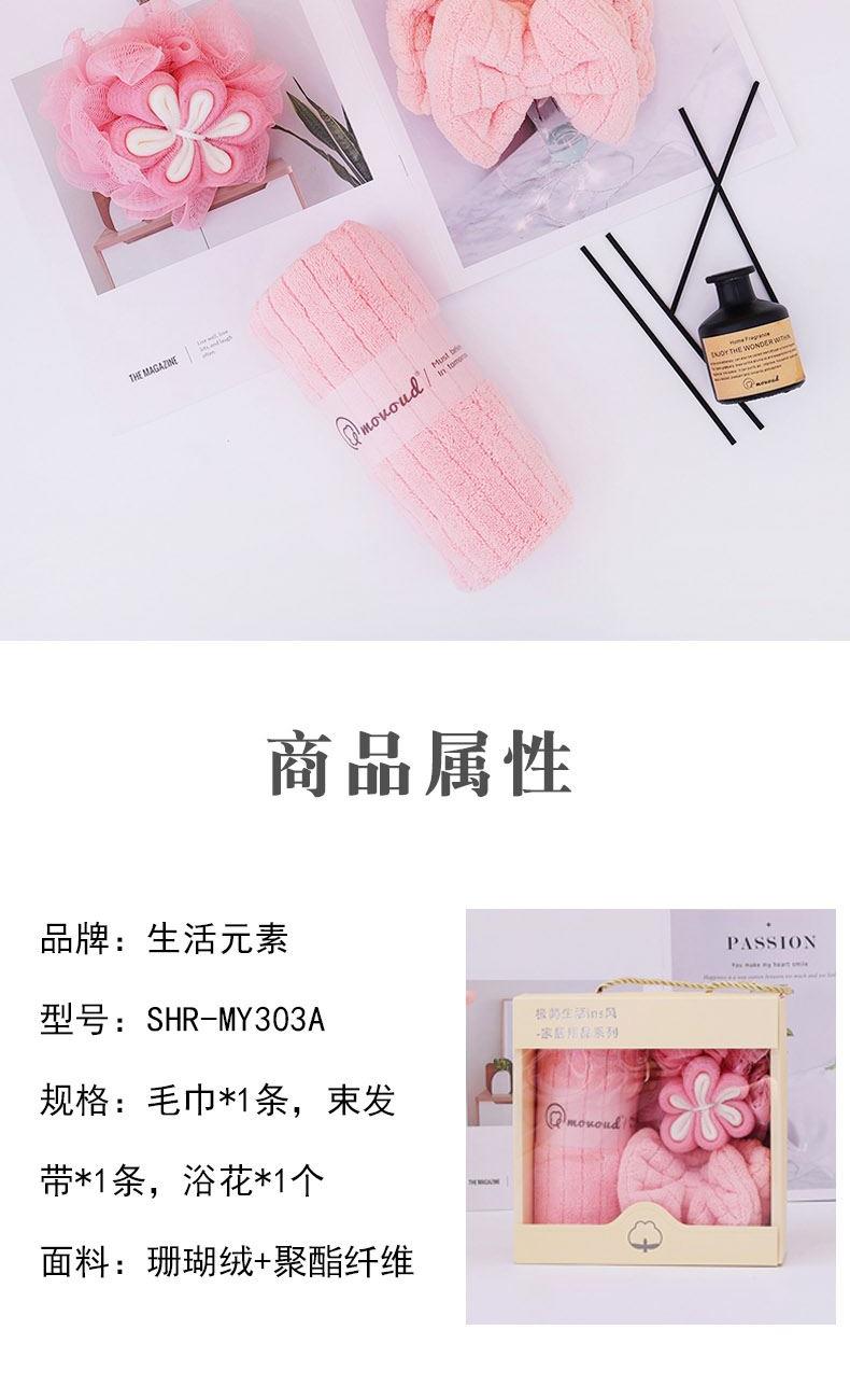 规格:毛巾*1条,束发带*1条,浴花*1个 尺寸: 毛巾:35*75CM 面料:珊瑚绒+聚酯纤维 包装方式:礼盒装 包装尺寸: 200*200*9mm 质地细腻、手感柔软、不易掉毛、不起球、不掉色,对皮肤无任何刺激,不过敏。外形美观,颜色丰富。