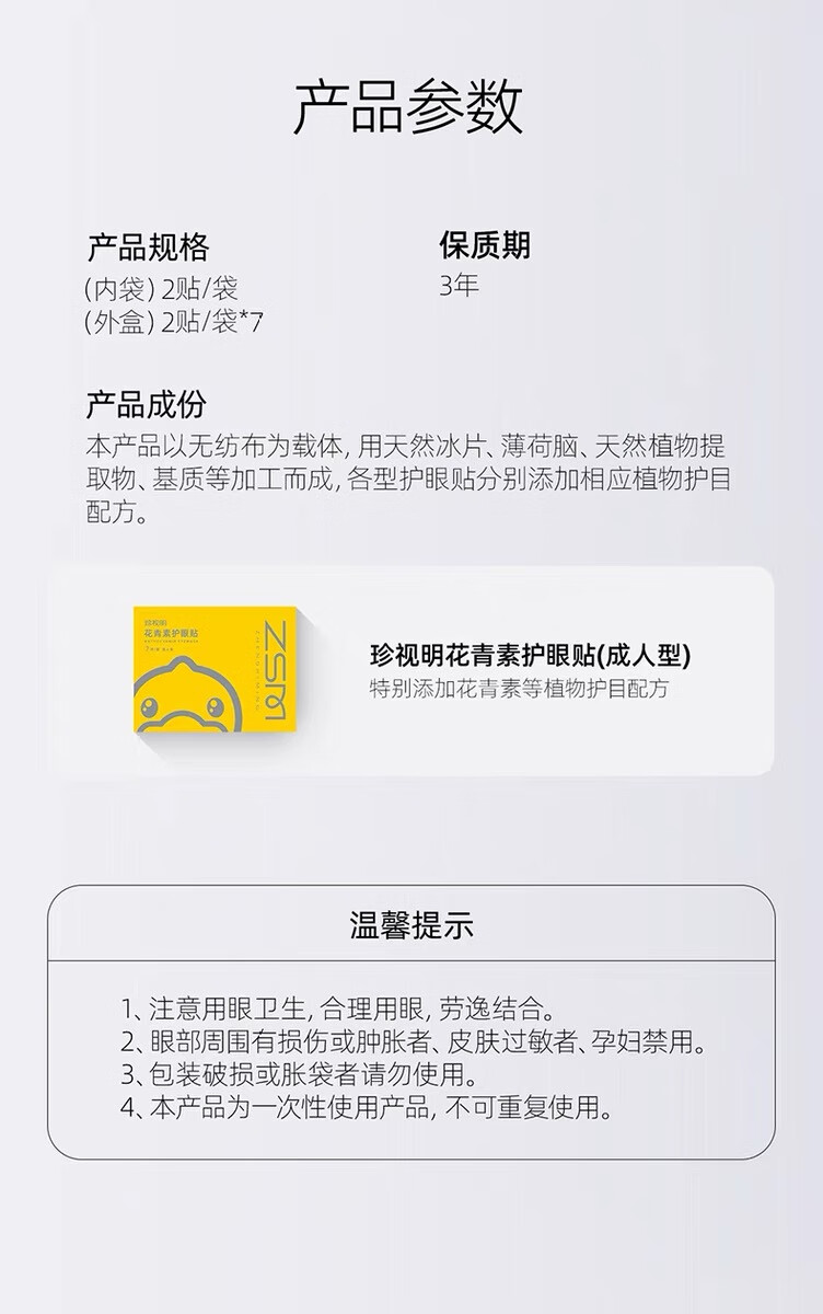 规格: 7对/盒 内袋2贴/袋(尾翼型) 本产品以无纺布为载体,用天然冰片、薄荷脑、天然植物提取物、基质等加工而成,特别添加花青素等植物护目配方。