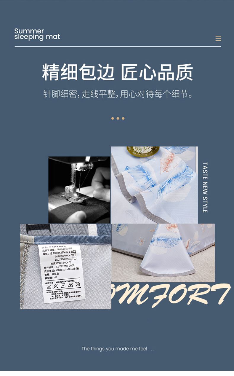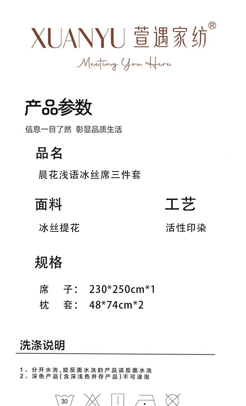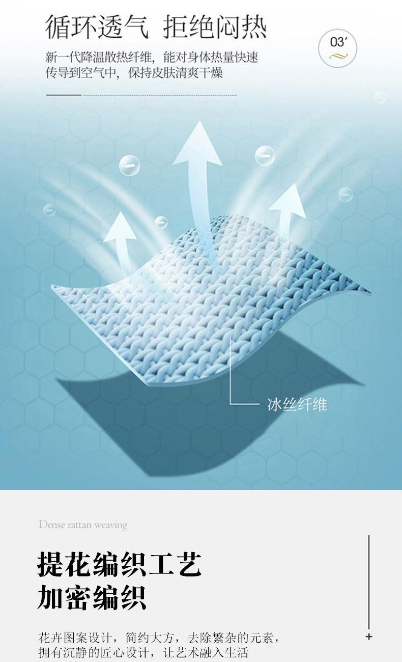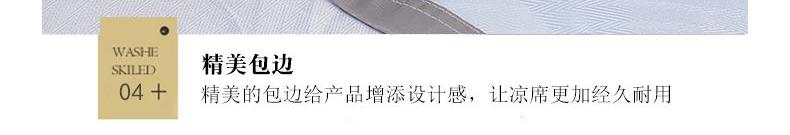 规格:230*250cm 枕套:48*74cm*2 面料:冰丝提花 工艺:活性印染 执行标准:GB/T22796-2021 安全类别:GB18401-2010 B类 1.这是一款可水洗机洗的软席,不褪色不起球,凉而不冰,细腻光滑,老少皆宜 2.可折叠收纳,透气性强 冰爽 丝滑 凉感 无睡痕 不夹发 光滑柔软 凉而不冰 此刻尽丝滑形。