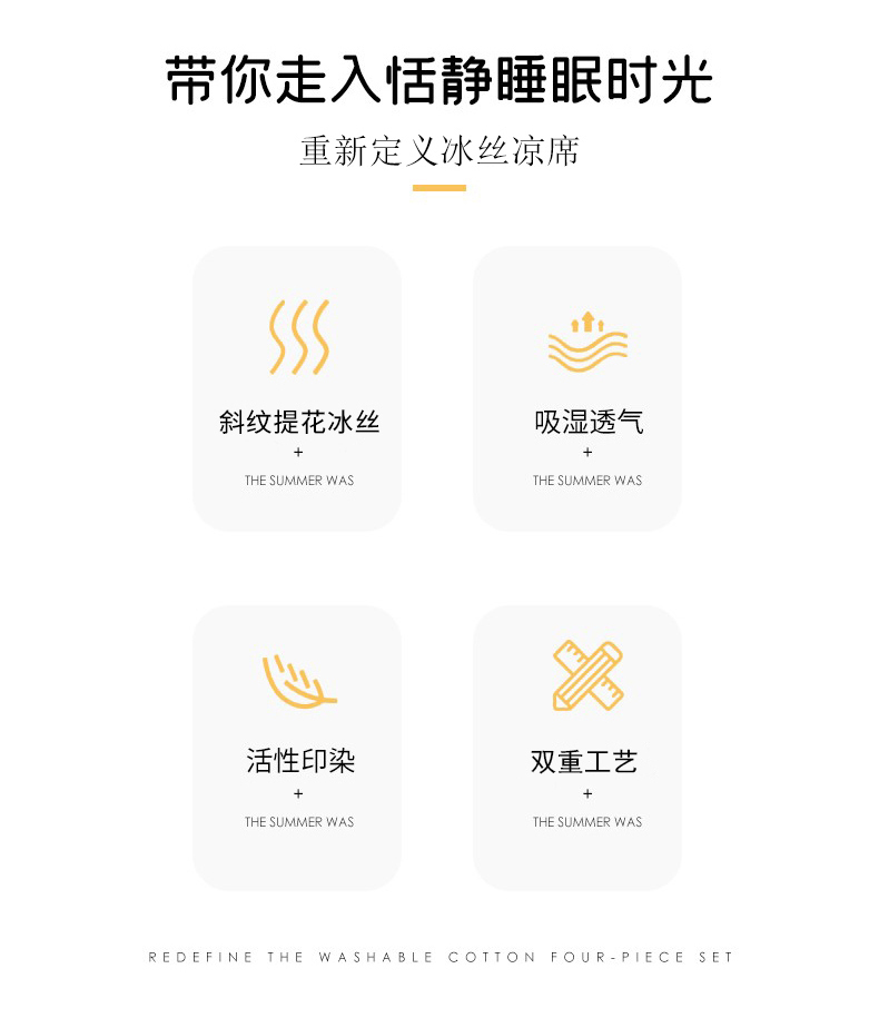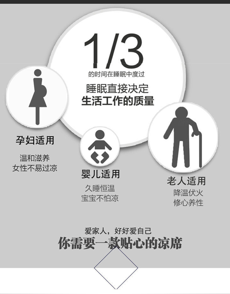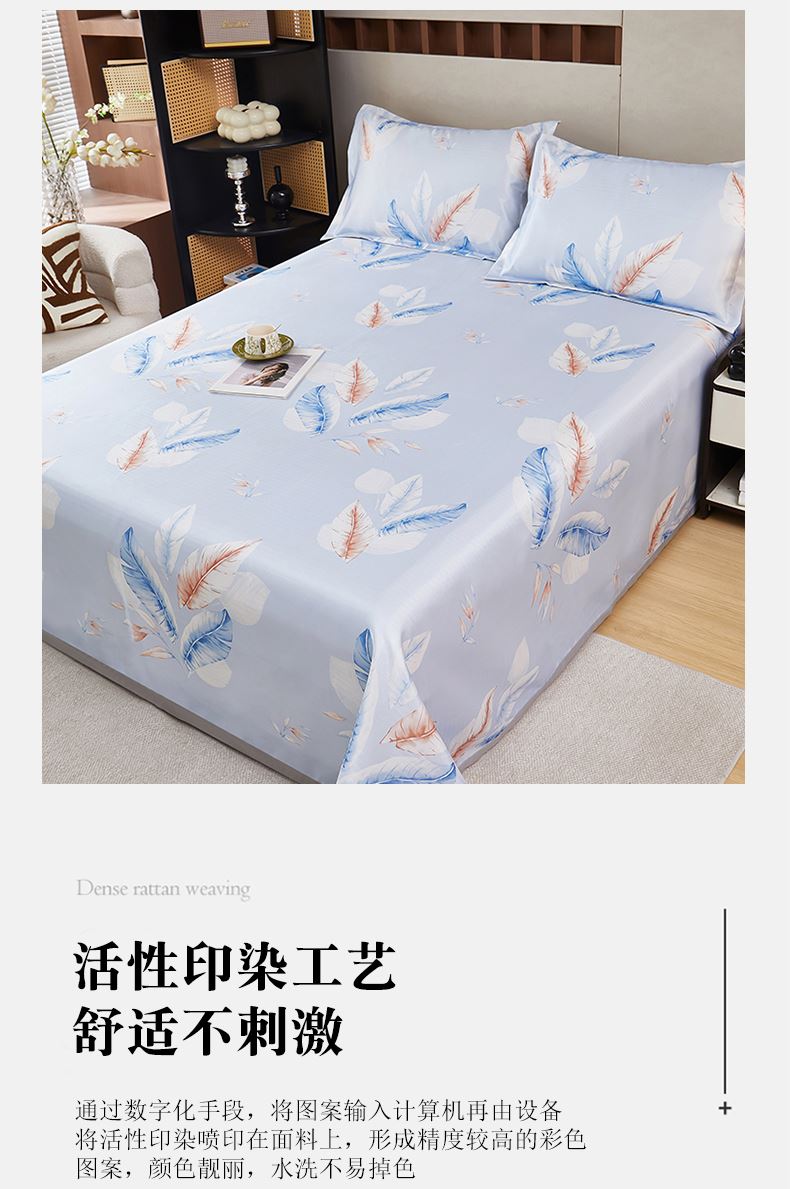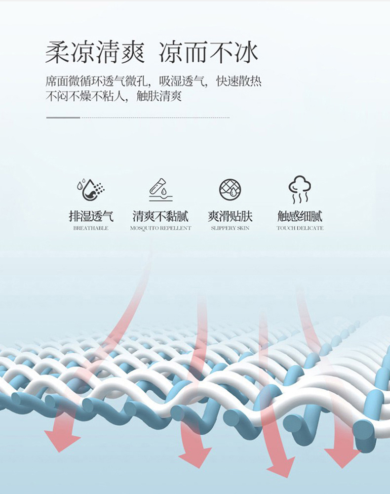 规格:230*250cm 枕套:48*74cm*2 面料:冰丝提花 工艺:活性印染 执行标准:GB/T22796-2021 安全类别:GB18401-2010 B类 1.这是一款可水洗机洗的软席,不褪色不起球,凉而不冰,细腻光滑,老少皆宜 2.可折叠收纳,透气性强 冰爽 丝滑 凉感 无睡痕 不夹发 光滑柔软 凉而不冰 此刻尽丝滑形。