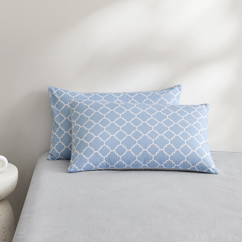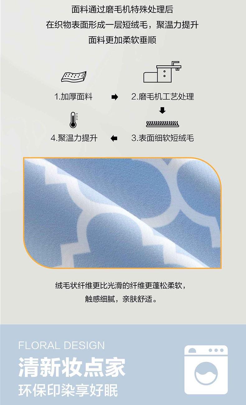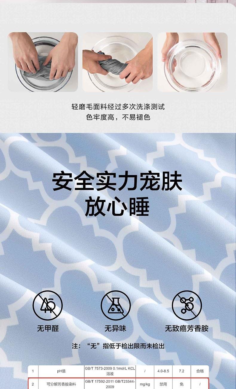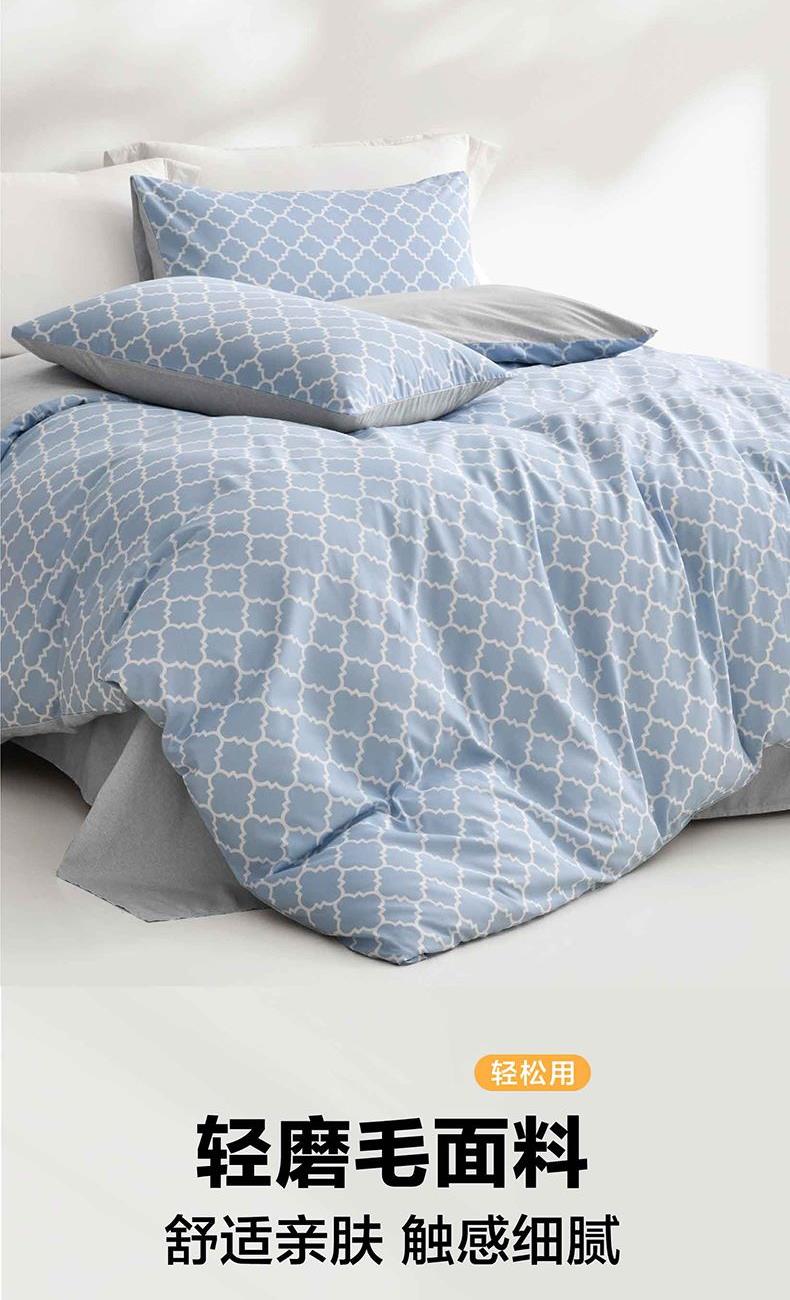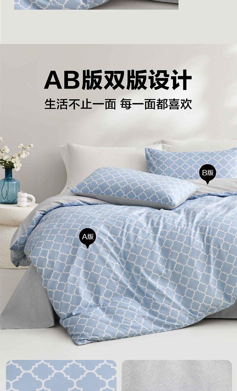 规 格 :200*230cm 被 套 :200*230(cm)*1 被 单 :230*241(cm)*1 枕 套 :48*74(cm)*2 面 料 :聚酯纤维 包 装 :礼盒包装 采用天蓝色的A版搭配银灰色的肌理B版,时尚清新。一根根的线条组成的简约几何图案,立体感十足,富有时尚的艺术气息,设计简约舒适。