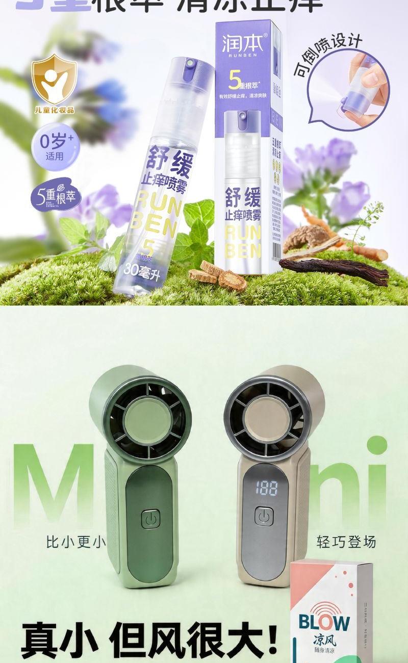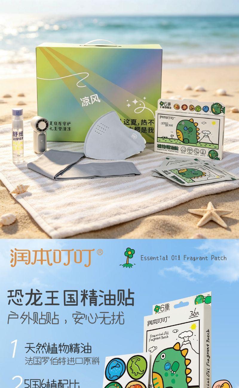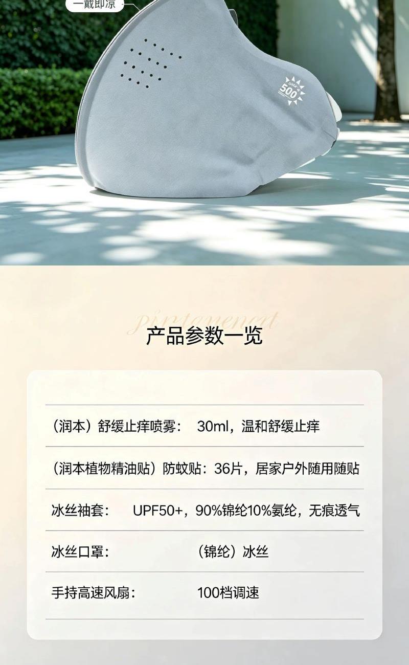 配置: (润本)舒缓止痒喷雾*1 (润本)植物精油贴(防蚊贴)*36片 手持高速风扇*1 冰丝口罩*1 冰丝袖套*1 主要材质和功能: (润本)舒缓止痒喷雾:30ML,温和舒缓止痒 (润本)植物精油贴防蚊贴*36片:居家户外随用随贴 手持高速风扇:100档调速 冰丝口罩:(锦纶)冰丝 冰丝袖套:UPF50+,90%锦纶10%氨纶
