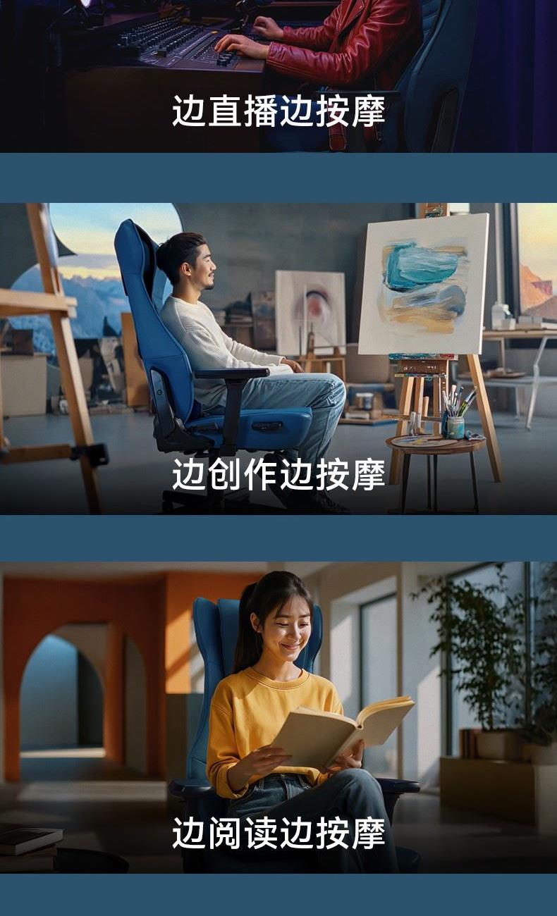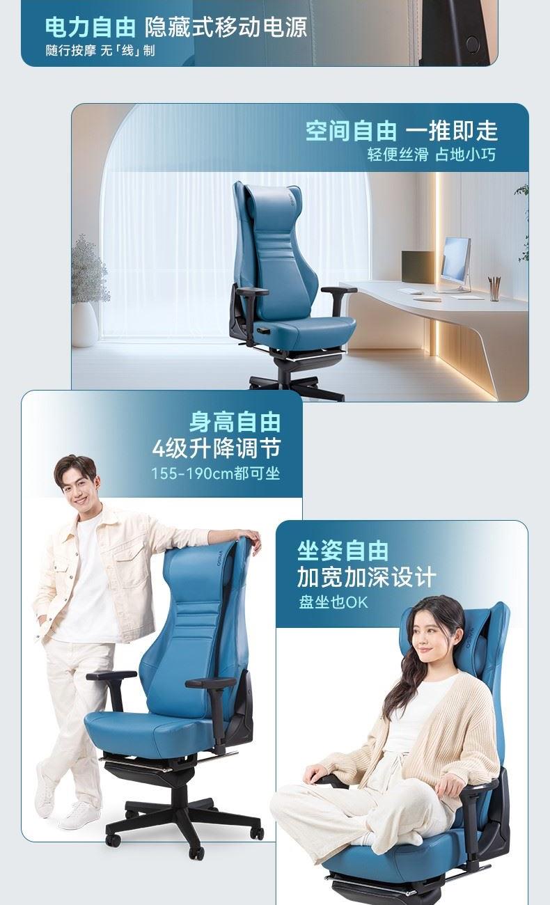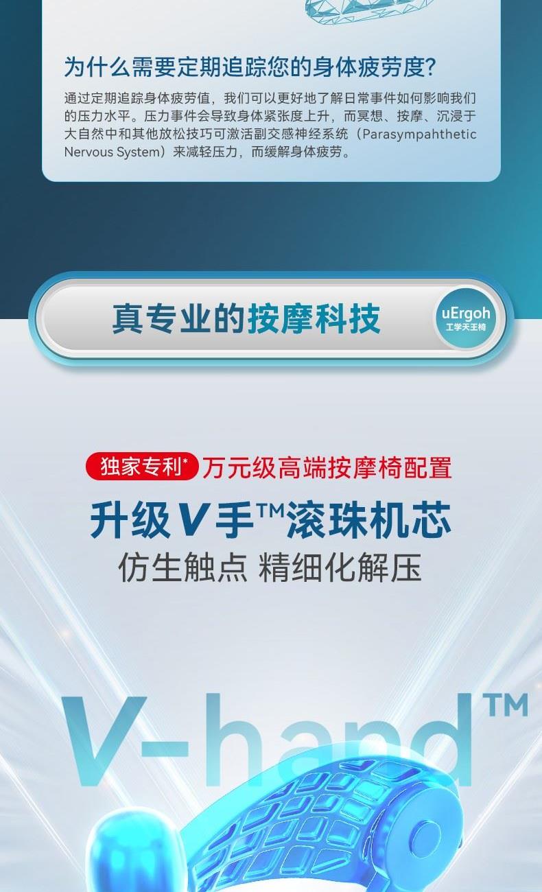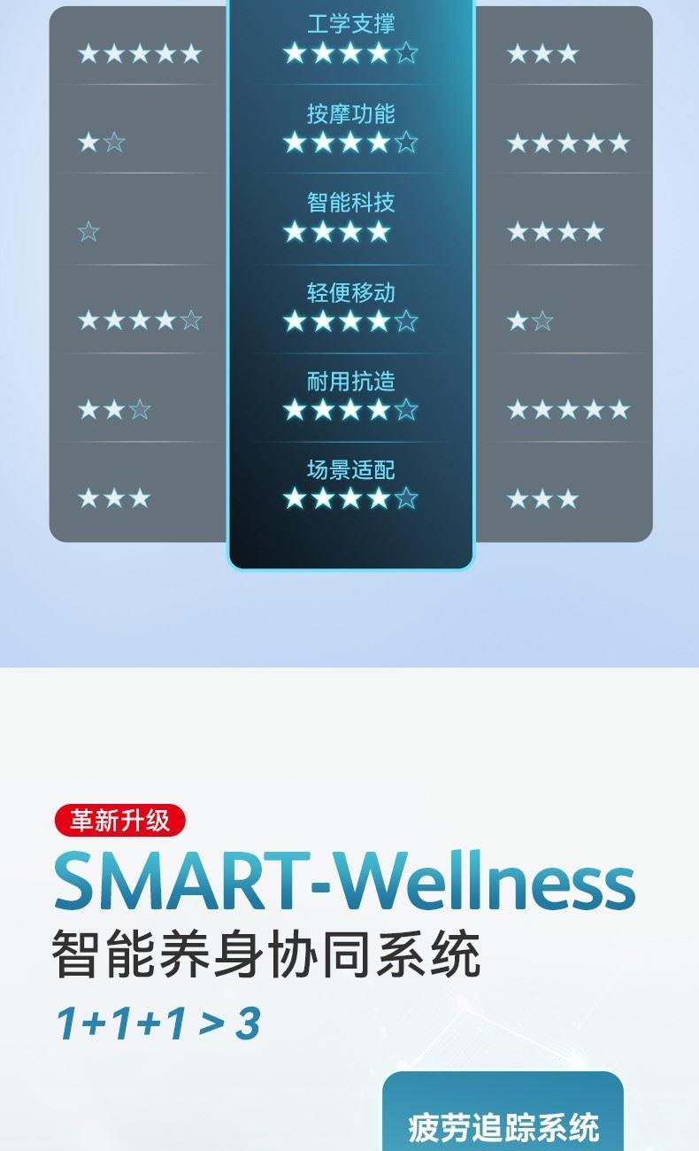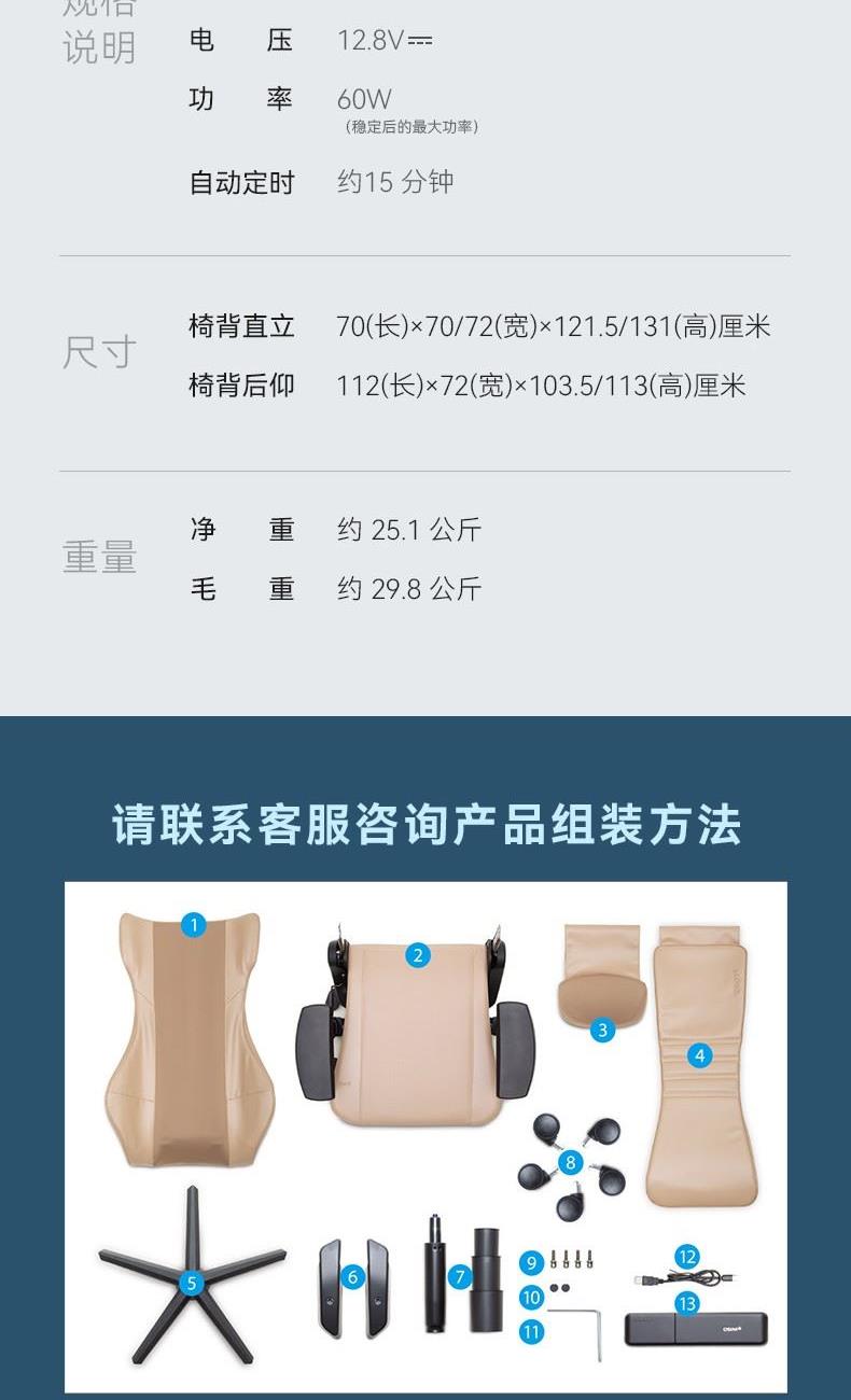 耗电量:12.8V-60瓦特(15min) 净重:约25.1公斤 毛重:约29.8公斤 尺寸:直立:70(长)x70/72(宽)x121.5/131(高)厘米 后仰:112(长)x72(宽)x103.5/113(高)厘米 1、首创无线驱动,随意移动、一键操作方便使用、多场景、全家可用 2、V手科技360°按摩球Pro,0-140°倾斜放空 3、新创古法踩背养身科技+联动科技+智能APP+机身按键 4、人体工学设计标准EN1335,结构耐用性BIFMA,材质intertek认证