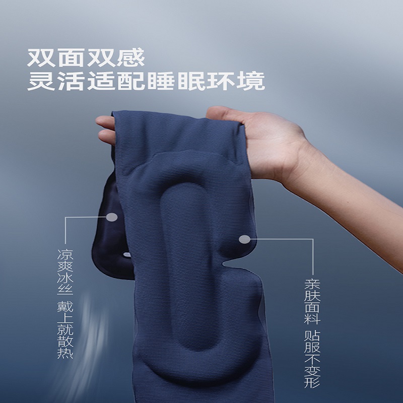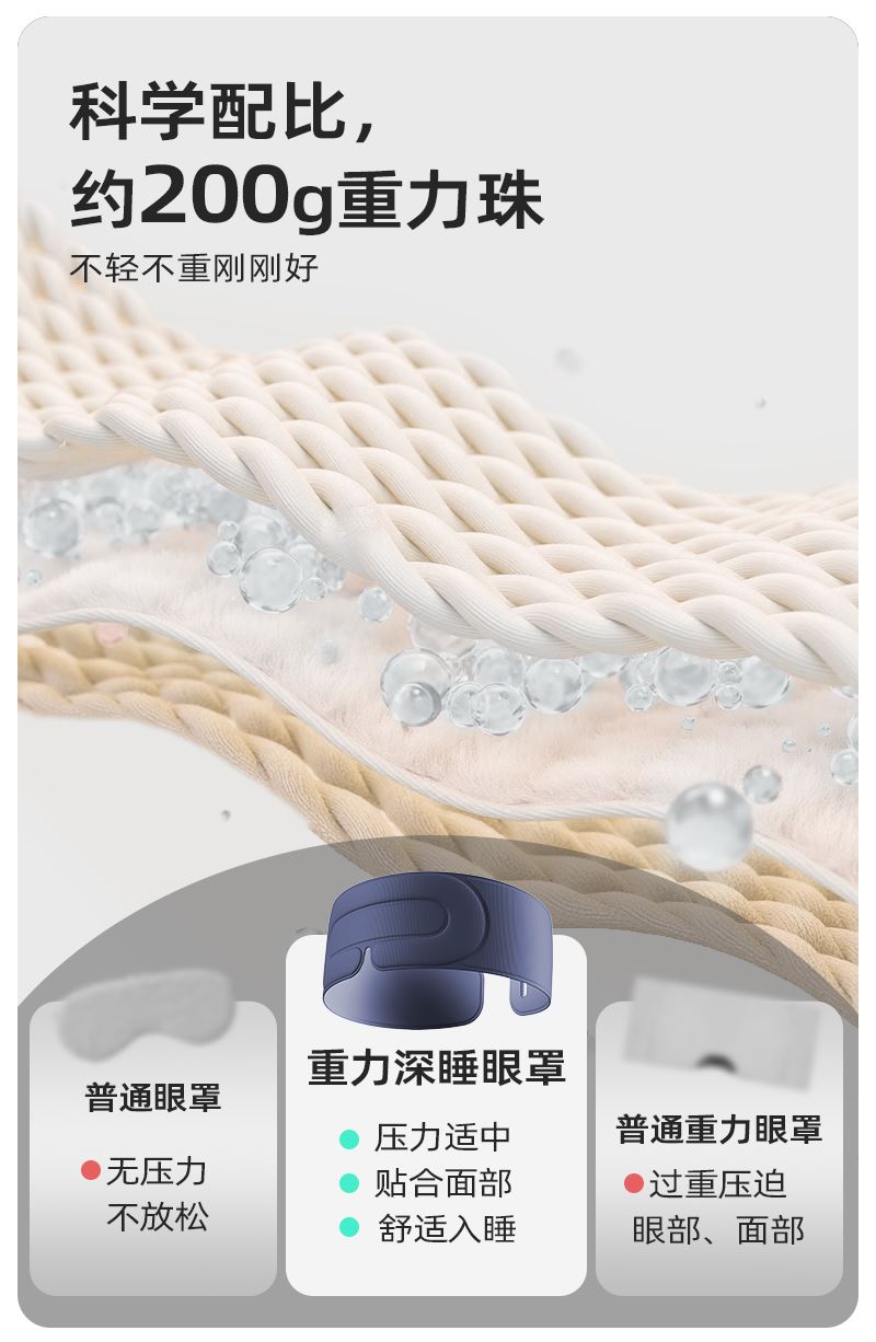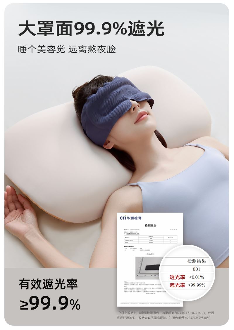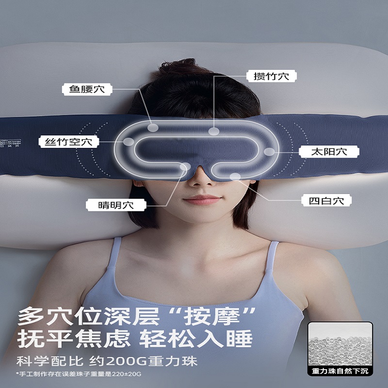 外侧面料: 74%锦纶,26%氨纶 内侧面料: 87%锦纶,13%氨纶 包装清单:眼罩*1 防尘防尘袋*1 单台包装尺寸:270*110*40mm 单台重量:300g(含彩盒) 颜色:阑夜黑、深睡蓝 功能特点: ①多穴位重力触达,缓解疲劳轻松入眠 ②科学分配重力,不压眼球 ③3层结构 ,遮光率99% ④可调节大小,小巧便携,可水洗 ⑤午睡不易花妆