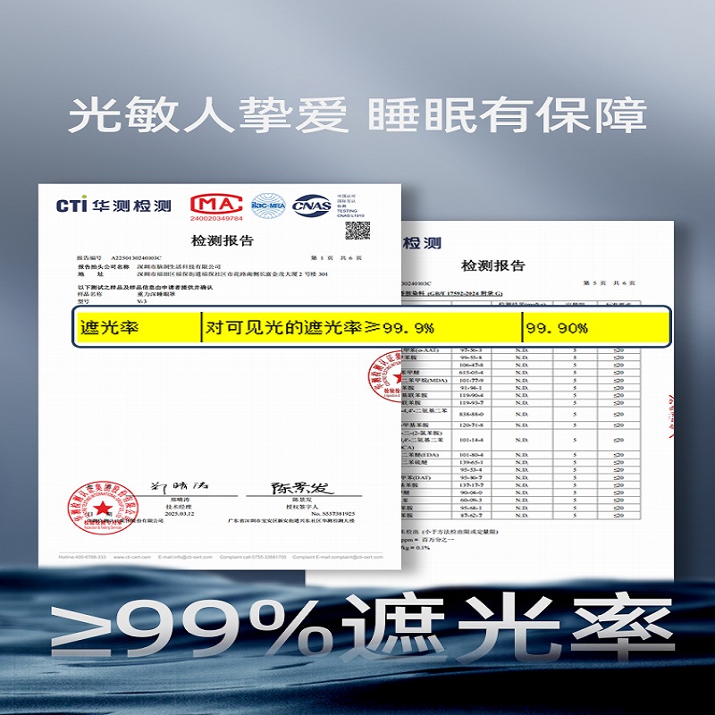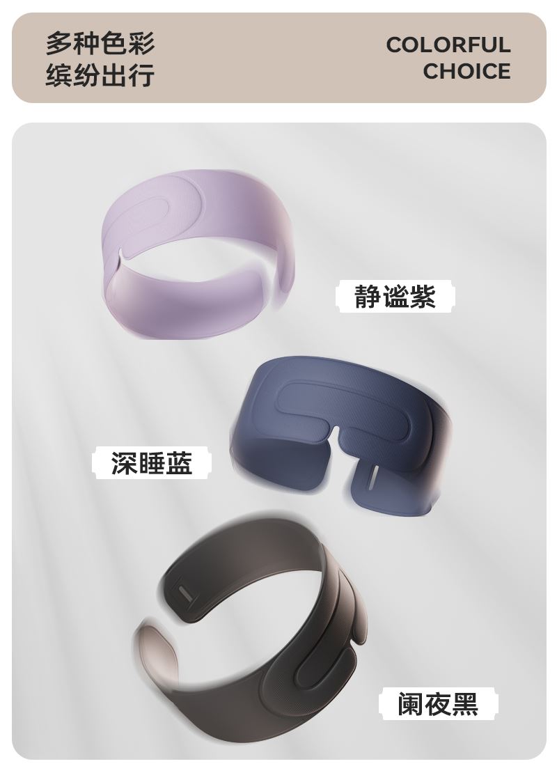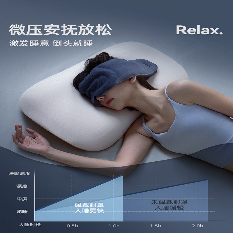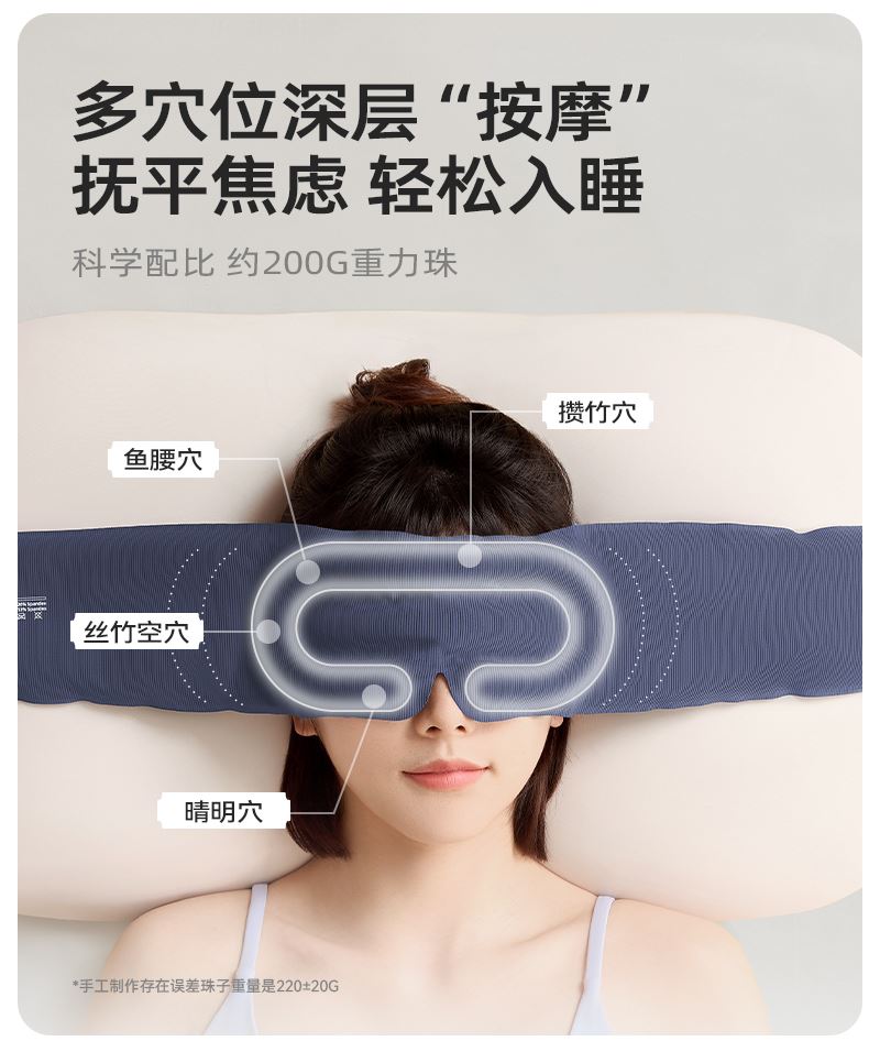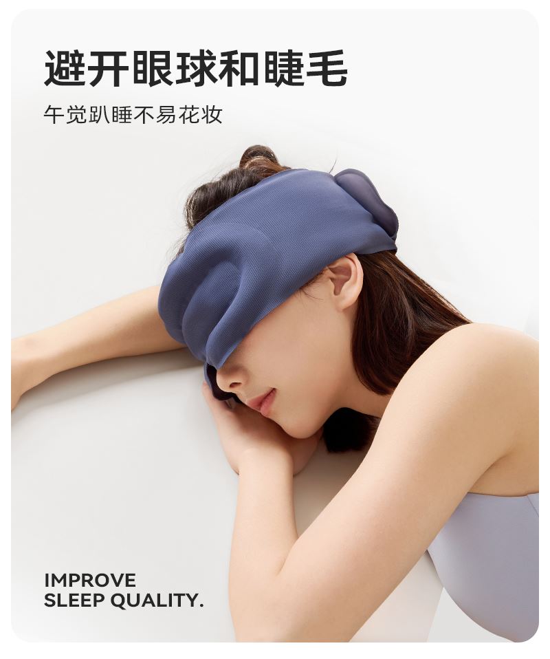 外侧面料: 74%锦纶,26%氨纶 内侧面料: 87%锦纶,13%氨纶 包装清单:眼罩*1 防尘防尘袋*1 单台包装尺寸:270*110*40mm 单台重量:300g(含彩盒) 颜色:阑夜黑、深睡蓝 功能特点: ①多穴位重力触达,缓解疲劳轻松入眠 ②科学分配重力,不压眼球 ③3层结构 ,遮光率99% ④可调节大小,小巧便携,可水洗 ⑤午睡不易花妆