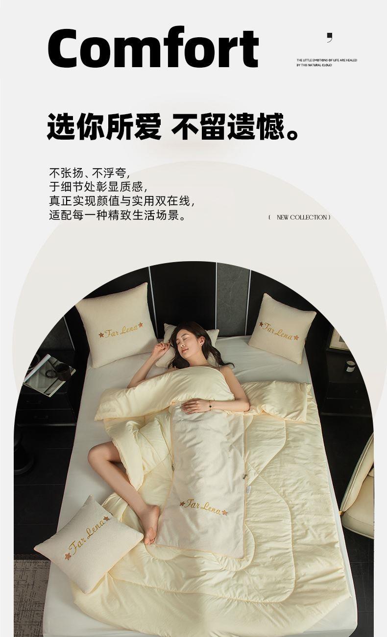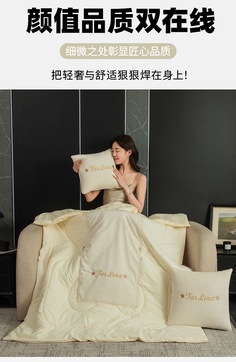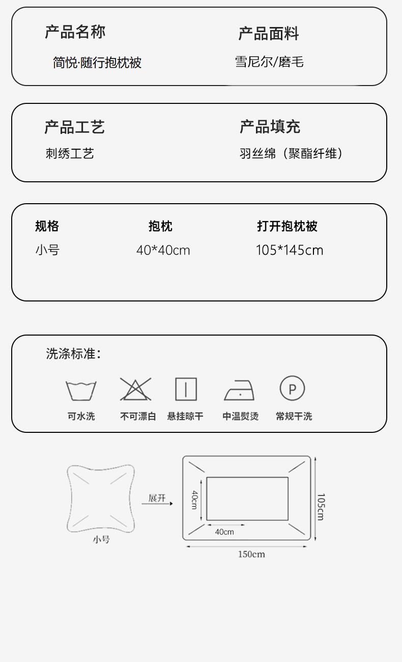 抱枕尺寸:40*40cm*1 被子尺寸:105*145cm 面料:雪尼尔/磨毛 数量:一只 产品包装:精美手提袋 产品特点: 1.雪尼尔面料自带肌理感,软糯透气舒适,四季适用。 2.雪尼尔面料自带细腻麻感肌理,磨毛则添一份软糯亲肤,双重面料加持,触感湿润细腻又兼具韧性,上手便能感受到藏在面料里的质感。