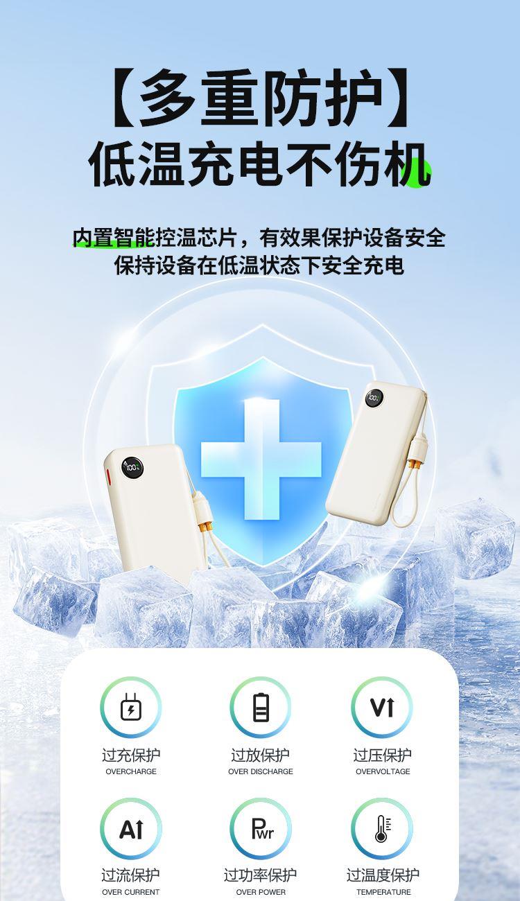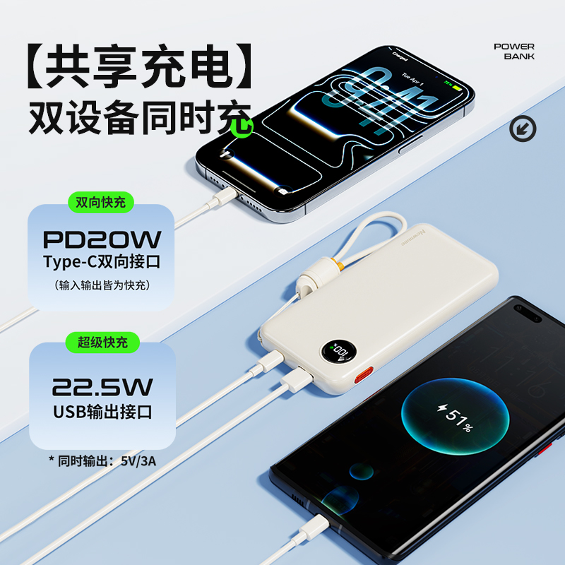 2万毫安,自带Type-c快充挂绳线,数显电量。22.5W快充:电池类型:聚合物锂离子电池电池容量:20000mAh,额定容量:10600mAh输л腆荟浼坟围:Type-C口:5V=3A 9V-2A 12V=1.5A输出:Type-C口:5V-3A,9V-2.22A、12V=1.67AUSB-A口:5V=3A、9V=2A、12V-1.5A、10V=2.25A,产品尺寸:146*71*29mm