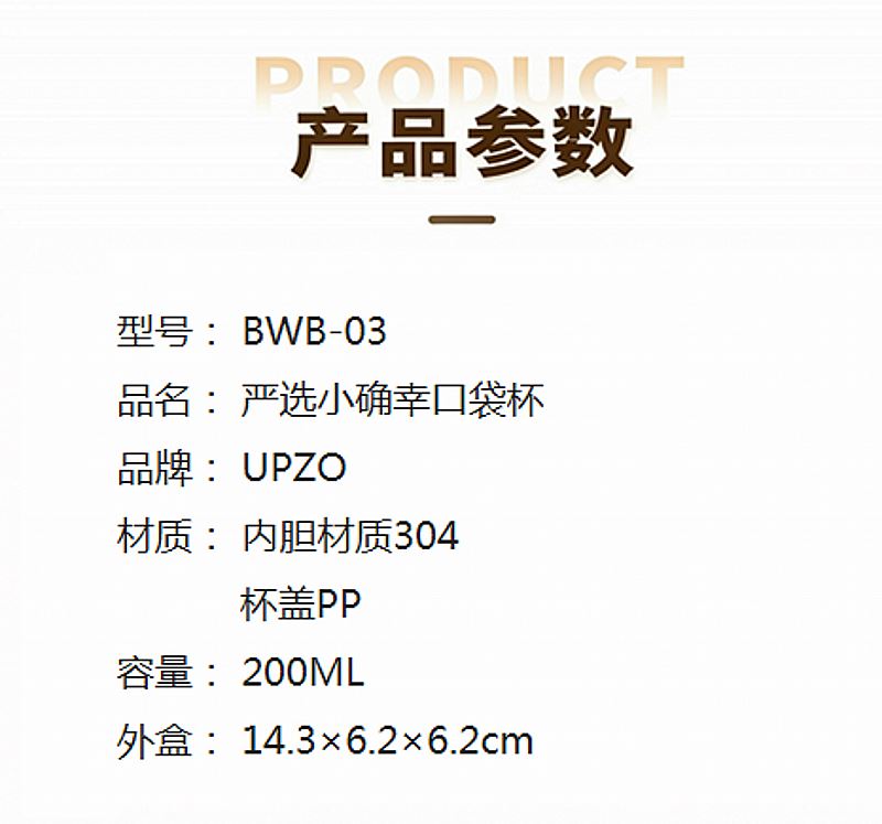 型号: BWB-03 材质: 内胆材质304 杯盖PP 容量: 200ML 外盒: 14.3×6.2×6.2cm 小确幸保温杯 200毫升口袋杯 撞色设计 304内胆 外观靓丽 品质优良