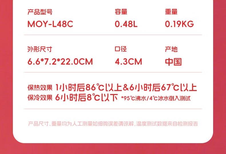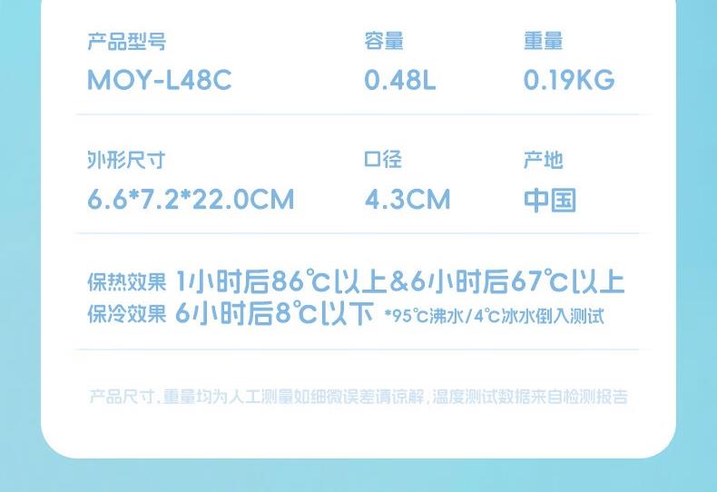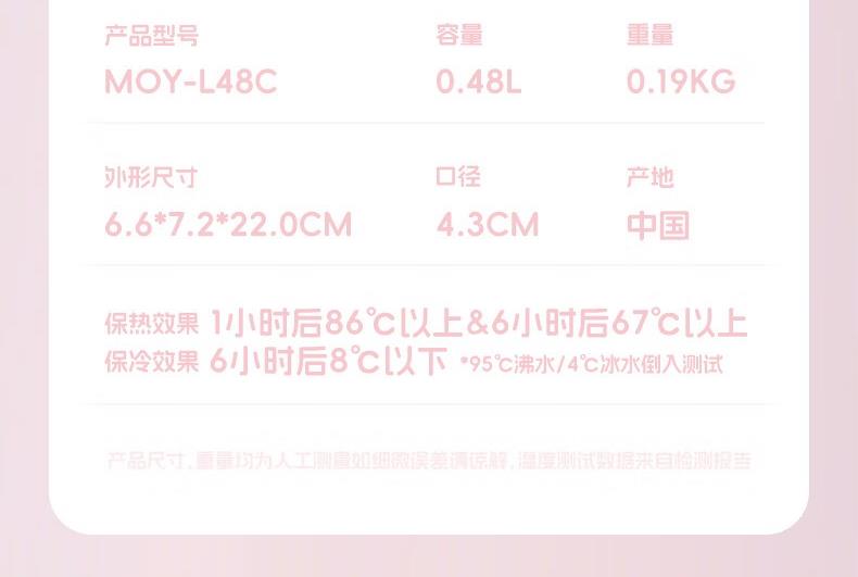 颜 色:HELLOKITTY-WR/帕恰狗 -WY/双子星-WA 容 量 :0.48L 重 量:0.19KG 外形尺寸:6.6*7.2*22.0CM 口 径:4.3CM 产 地:中国 保热效果:1小时后86℃以上&6小时后67℃以上 保冷效果: 6小时后8℃以下“95℃沸水/4℃冰水倒入测试 单手使用轻松快捷,一键开启自动上锁 优质304不锈钢材质 梦重力轻量设计
